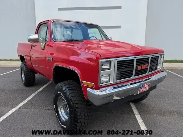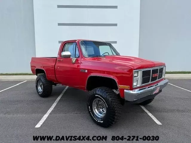 The 1987 GMC Sierra Classic V10/K10 1500 Squarebody pickup features custom upholstery with a like-new seat, 35-inch BFGoodrich Mud-Terrain tires on chrome wheels, a steel cowl induction hood, and a bright red finish with spray-in bedliner. Additional highlights include a sliding rear glass window, 4-inch lift kit with new bushings, dual shock system, dual steering stabilizer, chrome differential cover, dual exhaust, replacement dash pad, and a rear roll pan with receiver hitch. This truck runs, drives, and operates well but is best described as an average-condition vehicle that has undergone many recent repairs and maintenance. It is not one of our high-end custom Squarebody builds or $100,000-plus restorations, but as seen on our YouTube channel Davis Drives, it has been reconditioned extensively since we purchased it. We would still classify it as a good-looking "10-footer," making it a great choice for a hunting truck, weekend toy, or fun project vehicle. Please watch all videos of this trucks journey on davis drives. This is an AS-IS Sale.