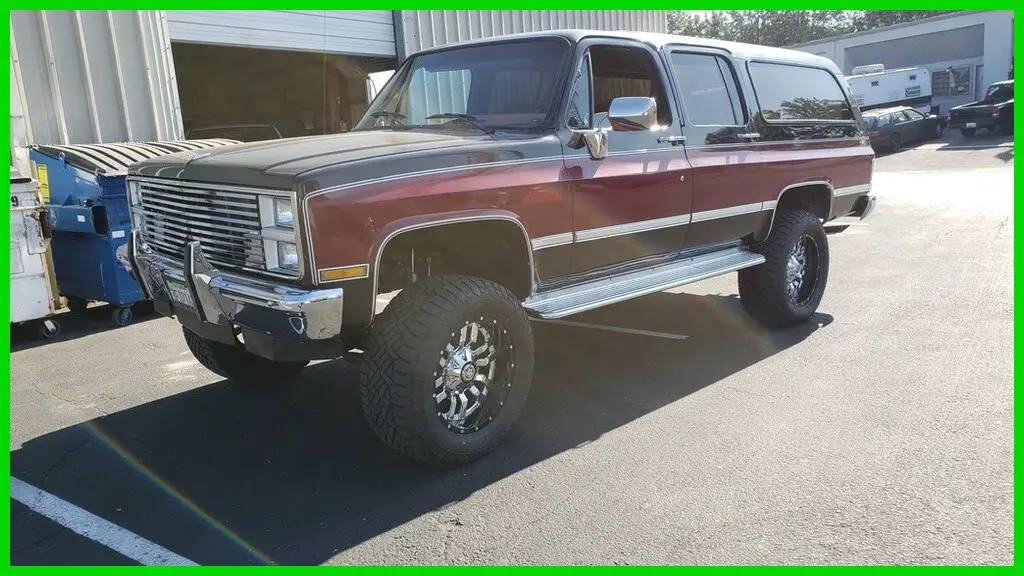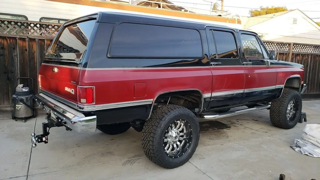 1988 MC Suburban 4WD 2500 This 1988 MC Suburban 4WD 2500 is a classic American SUV that boasts a powerful 5.2-liter V8 engine with less than 50,000 miles on the new engine. It features a robust 3-speed automatic transmission with overdrive, ensuring a smooth driving experience. The vehicle is equipped with new 20" Fuel wheels and 35" Fuel Gripper all-terrain tires, along with a new steering box and power steering pump for enhanced handling. The exterior is finished in a sleek black with a custom burgundy hue, while the interior showcases original burgundy upholstery, complete with a third-row seat and rear air conditioning. Additional features include running boards, factory tint, bucket seats with console, a B&W hitch with tow package, and an alarm syste