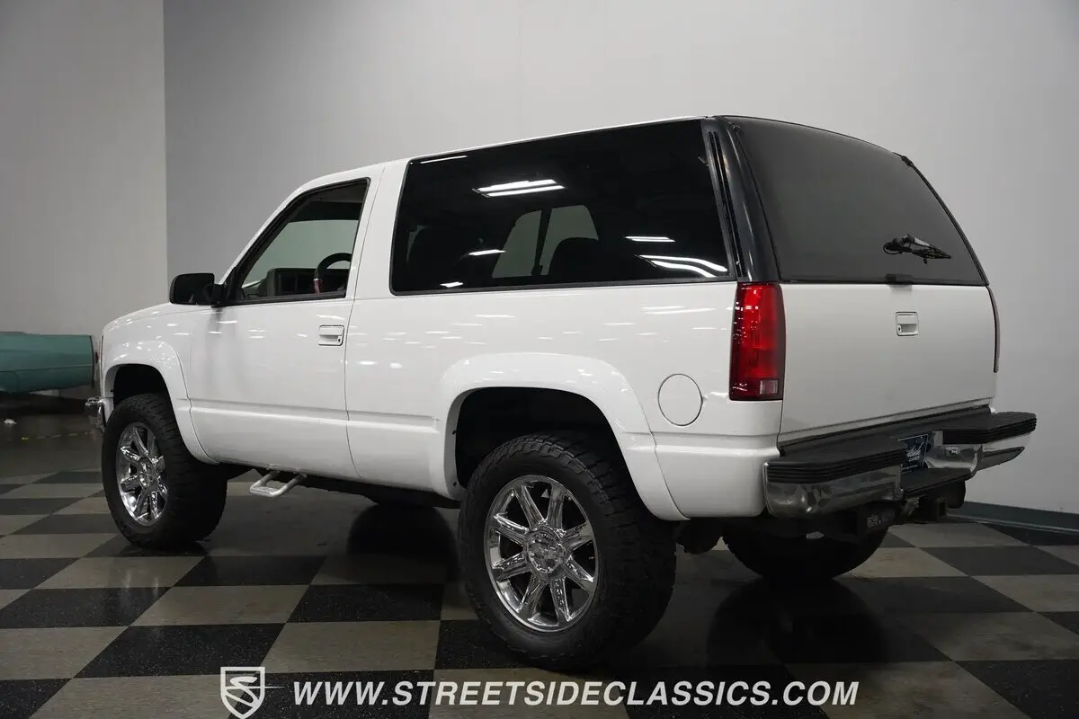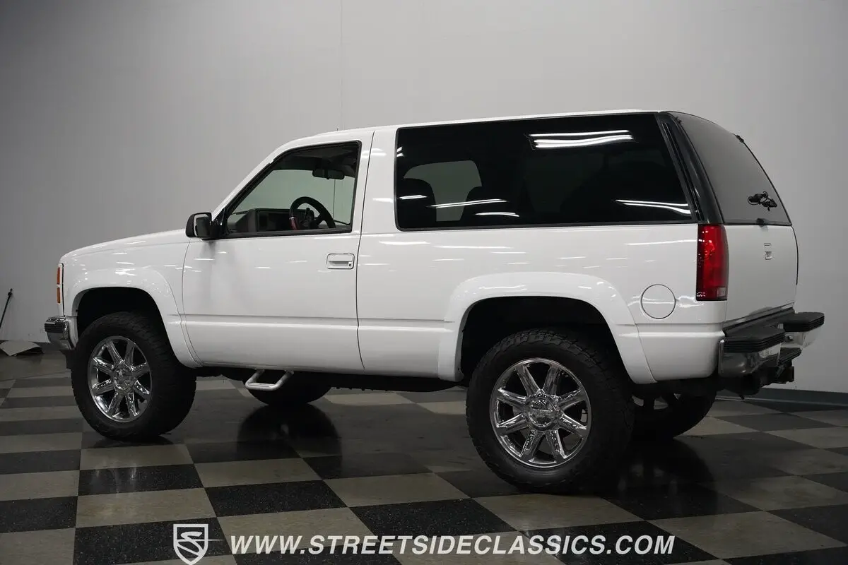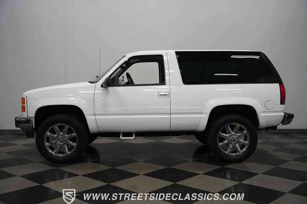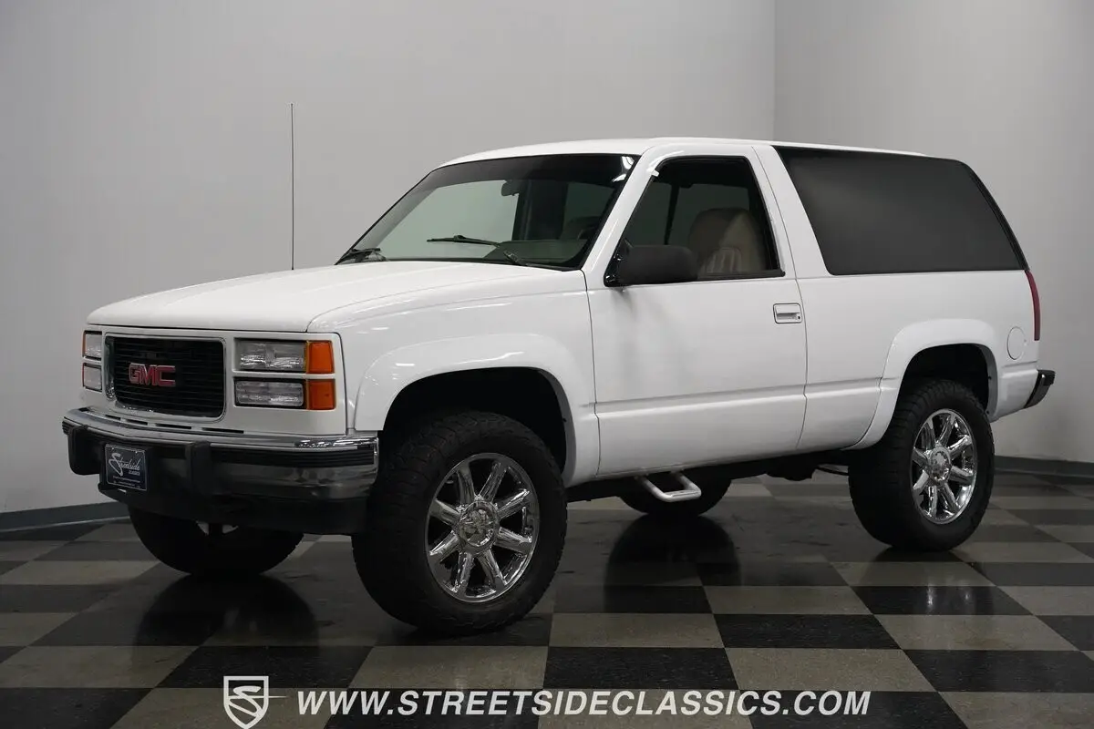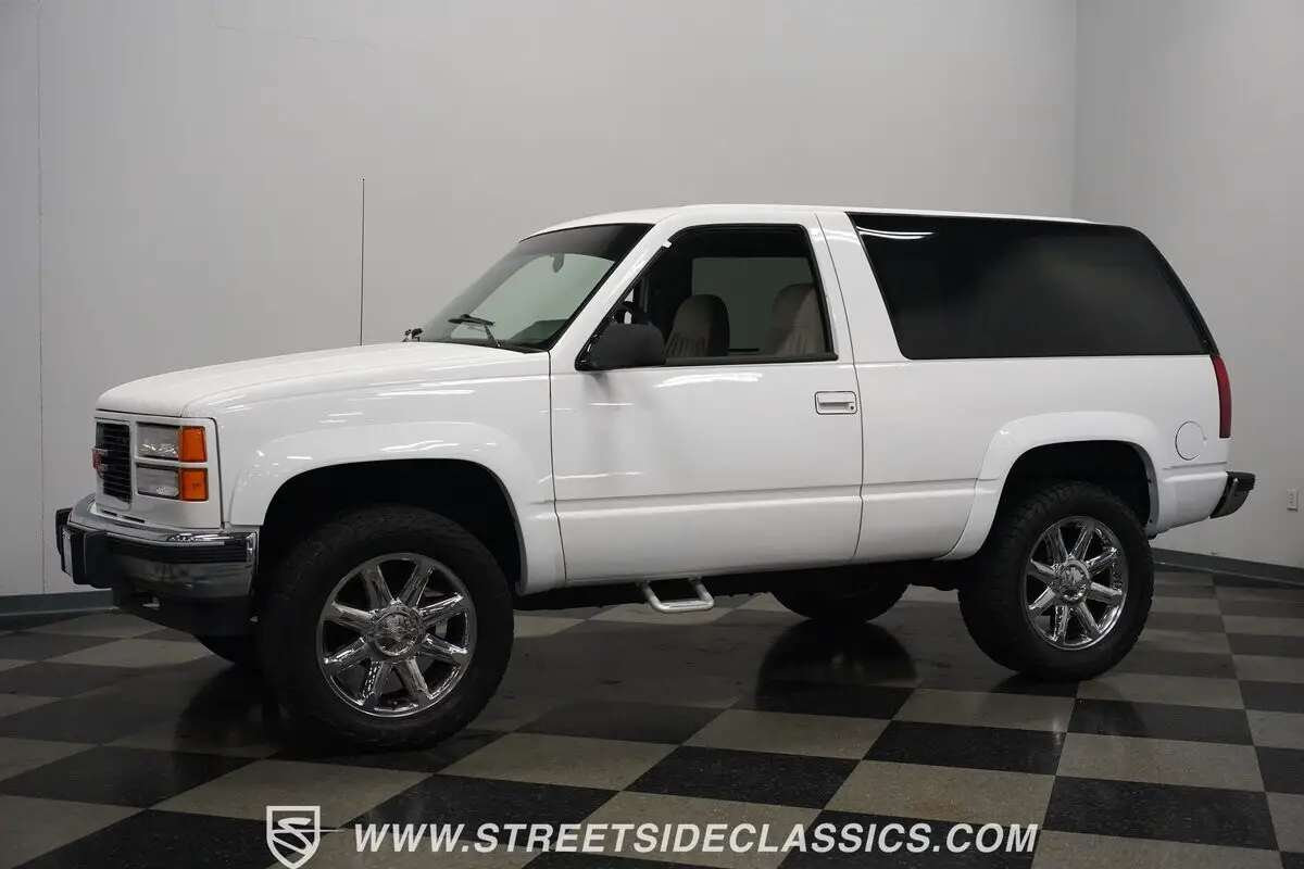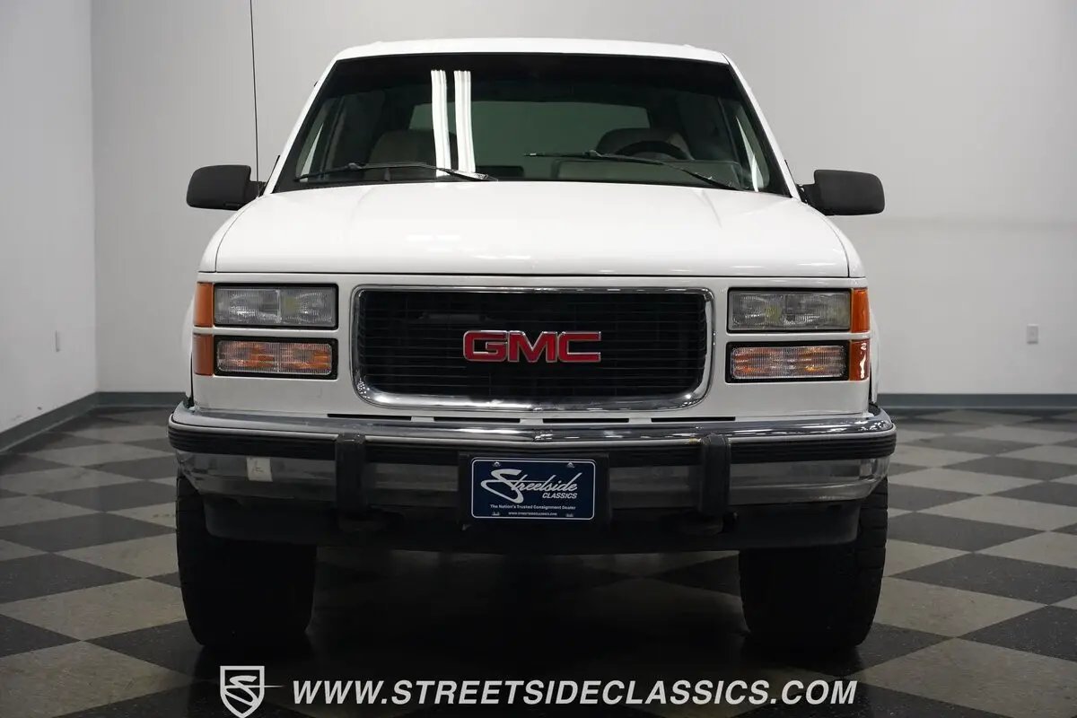 An Olympic White 1994 GMC Yukon 4X4 sits ready for action with its Rough Country lift kit elevating this off-road warrior to new heights. The pristinely applied paint highlights the bold, angular design of this two-door trail blazer, while custom painted headlight bezels and bright new lighting units modernize its front fascia. Gleaming chrome accents on the bumpers and steps create striking contrast against the snow-white exterior, and massive 20" GMC chrome wheels wrapped in aggressive LT305/55R20 tires establish an unmistakable presence. Dark tinted windows complete the look of this backcountry explorer, built for venturing where ordinary vehicles fear to tread.
