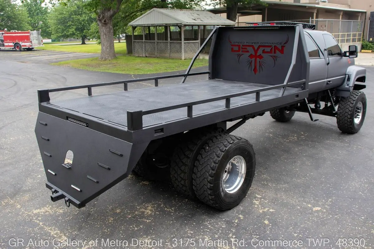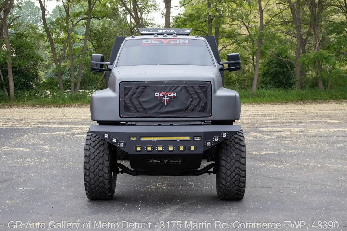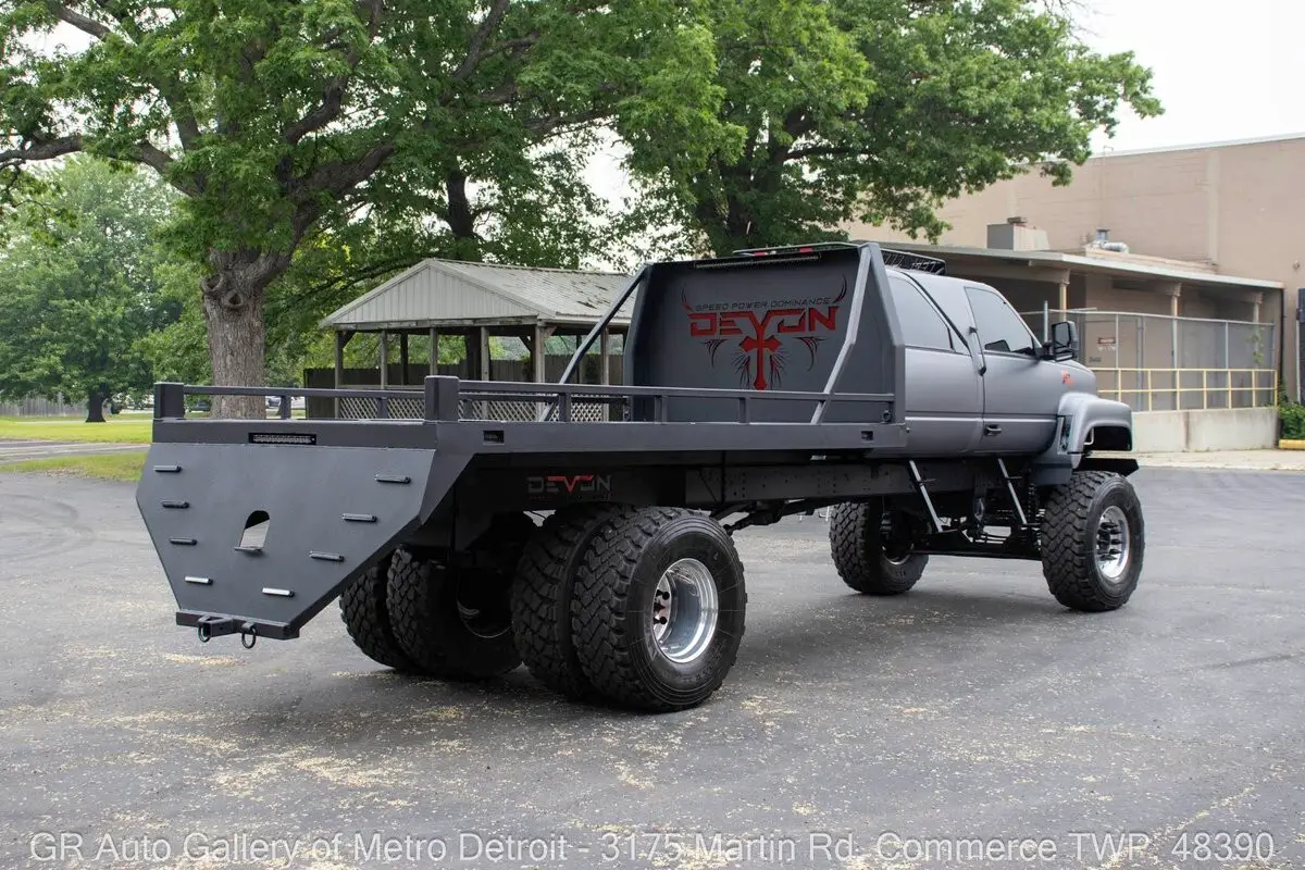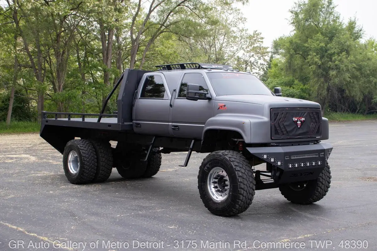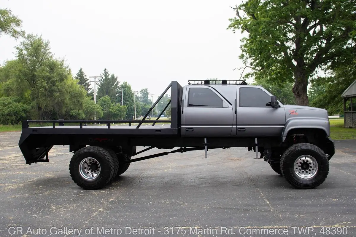 GR Auto Gallery is excited to present this ultimate toy hauler, a beast of a machine: 1991 GMC TopKick C7500 Mega Hauler for your consideration. This truck boasts a unique Ghost Gray painted exterior complemented by a custom black interior. Under the hood, you'll find the powerful turbocharged diesel 3116 inline 6 engine, paired with a 5-speed manual transmission. The truck is geared to a 4:55 rear end, ensuring that it not only excels on the highway but also has the capability to tackle any tough terrain with ease. With over 2,000 man-hours invested in custom modifications, this one-of-a-kind build features a custom Denali interior, rebuilt gauge cluster, brand new turbo, complete stereo system and speakers, rear backup camera, touch screen head unit, custom crew cab configuration, shaved lights, relocated door handles, and removable side step entry for added convenience. Additional features include stow-away compartments, a massive 50-gallon fuel tank discreetly positioned between the frame rails, a heavy-duty 5-ton rear axle, and custom front and rear bumpers. The raised suspension and one-of-one in-the-world dually super single wheels (445/225's) add an aggressive stance that is sure to turn heads. Length: 350 inches, Height: 114 inches, Width: 100 inches. This truck is truly a masterpiece, designed to bring joy both on and off the road. Drive this one out of our showroom or have us assist with shipping it to you anywhere in the United States! Don't hesitate to call us with any questions or for more information.
