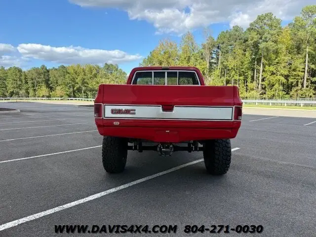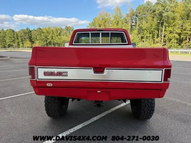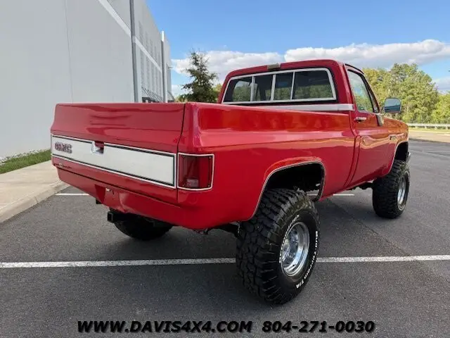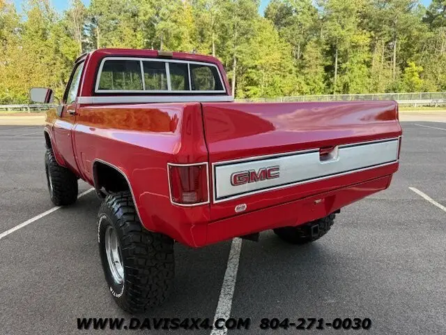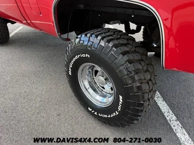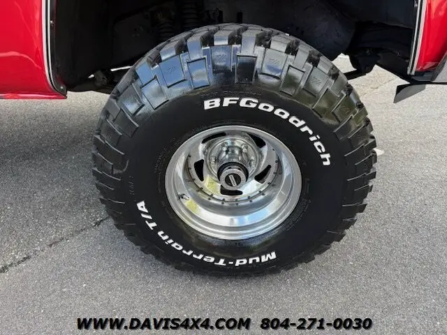 The 1987 GMC Sierra Classic V10/K10 1500 Squarebody pickup features custom upholstery with a like-new seat, 35-inch BFGoodrich Mud-Terrain tires on chrome wheels, a steel cowl induction hood, and a bright red finish with spray-in bedliner. Additional highlights include a sliding rear glass window, 4-inch lift kit with new bushings, dual shock system, dual steering stabilizer, chrome differential cover, dual exhaust, replacement dash pad, and a rear roll pan with receiver hitch. This truck runs, drives, and operates well but is best described as an average-condition vehicle that has undergone many recent repairs and maintenance. It is not one of our high-end custom Squarebody builds or $100,000-plus restorations, but as seen on our YouTube channel Davis Drives, it has been reconditioned extensively since we purchased it. We would still classify it as a good-looking "10-footer," making it a great choice for a hunting truck, weekend toy, or fun project vehicle. Please watch all videos of this trucks journey on davis drives. This is an AS-IS Sale.