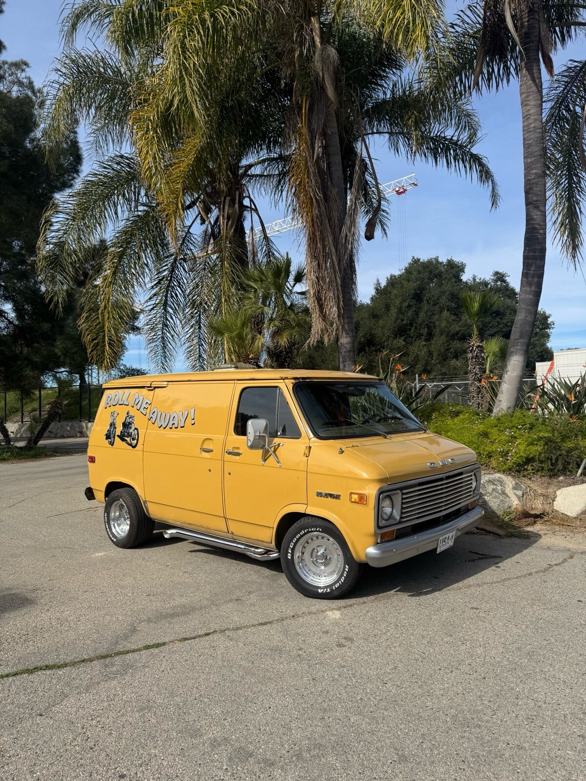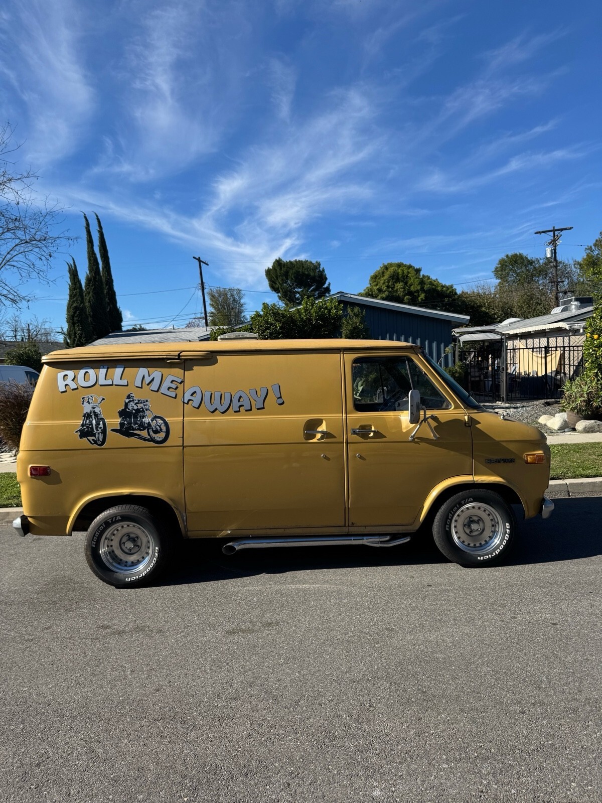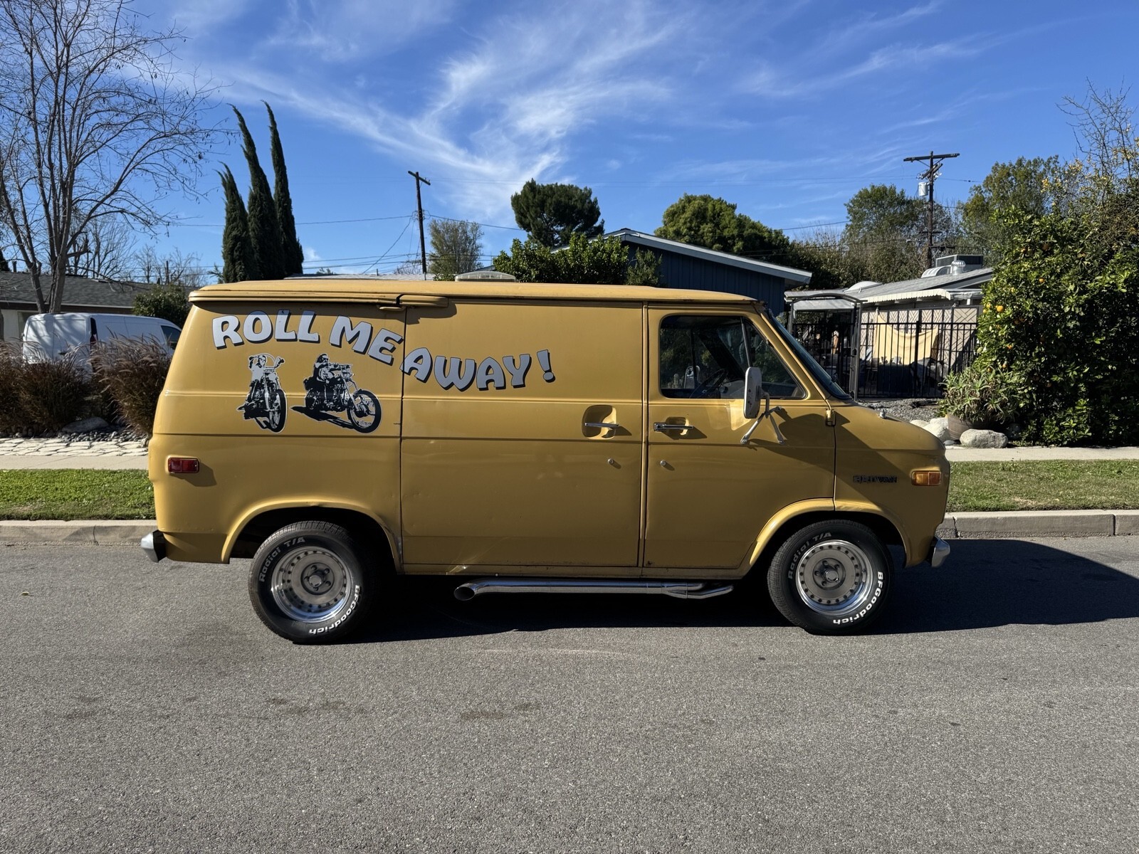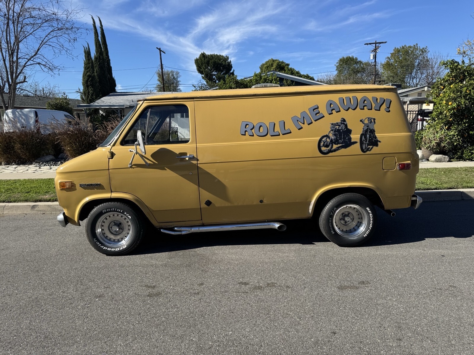 1974 GMC Vandura shorty for sale California car Original paint, sunset gold color. 250 cui 6 cyl engine 3 speed manual transmission on the floor Really cool smog exempt shorty van with lots of upgrades and recent work. Staggered Centerline wheels with new BFG tires. Custom interior, insulated throughout the van. Diamond rubber mat under the carpet Foldable full size orange Futon also new Reupholstered front seats with yellow houndstooth inserts. Orange 3 point seatbelts. Interior LED lights Vanessential soft cabinets, adds lots of storage. ApplePlay stereo with rear view camera - new battery -new HD radiator and hoses -new water pump -new engine mounts -new exhaust manifold and gaskets -new valve cover gaskets -all new coolant hoses and vacuum lines -new battery tray -new front and rear brakes -new shocks all around, front lowering springs -new front windshield gasket Clean title in my name, registered till 2027. The Van runs and drives perfect. Will ship on buyers expense. Call with any questions you have 8l8-3l0-l866 Tom