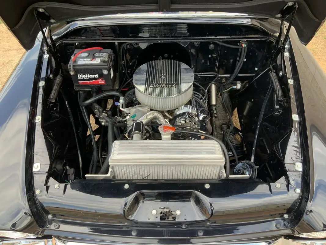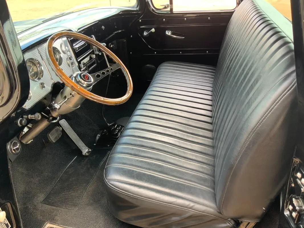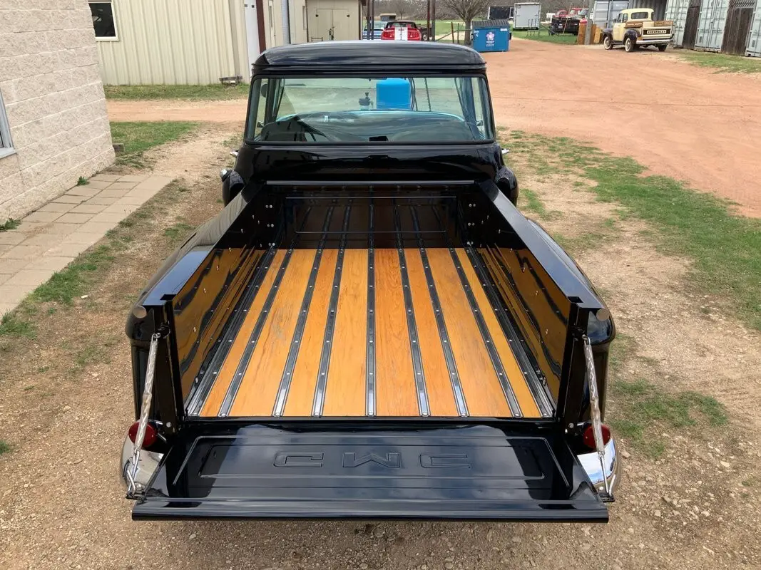 Inside you'll find a black vinyl bench seat and a well-thought-out driving environment that blends vintage style with comfort upgrades. A tilt steering column and wood steering wheel add both style and driving comfort, while a floor-mounted shifter gives the truck a sporty feel. Air conditioning has also been added to make cruising in warmer weather far more enjoyable.