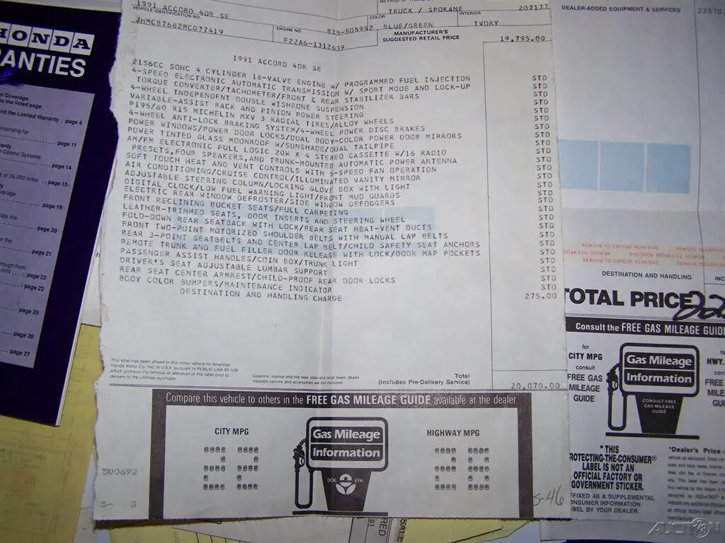 If you're not viewing this vehicle on our website. Please view the 150 plus photos & link to 4k You Tube video on our website at cherokeeautogroup.com Type in search 1991 Honda Accord SE in search tab! Check out this very very special 1991 Honda Accord SE sedan that was just acquired from it's very finicky original owner! Mr. Meissinger purchased this beauty new on 3-11-1991 @ Peterson Motors a Cadillac-Pontiac-Honda dealer in Missoula MT. He pampered, climate controlled garaged stored & fair weather drove it only for over 33 years and 55k miles. This car is a remarkable, non-smoker, original survivor! Its truly a spectacular Honda! Power comes from a smooth Fuel Injected 2.2-liter inline-four linked to a four-speed automatic transaxle, and the exterior is finished in SE only color Bright Blue Green Metallic over SE only glove soft Ivory leather upholstery. Riding on factory 15"³ chrome wheels with nice match set of Michelin Pilot Sports, anti-lock 4 wheel disc brakes and dual stabilizer bars, the car is equipped with a factory power glass sunroof, gold-plated 24k badging, cold air conditioning, hot heat, power windows and door locks, and a Rocking JVC CD Bluetooth stereo with trunk-mounted amplifiers and subwoofers with sub driver controller, Cobra hard mounted radar detector. The original timing belt, water pump, belts & seals were replaced in 2022 approx. 500 miles ago. This Accord SE is now offered in Georgia with fantastic original documentation that include original window sticker, original purchase paperwork, original bill of sale, audio booklets, finance contract, great records, all owner's manuals plus many others! Nice rare Genuine Honda car cover, Genuine Honda Bra, Honda headlight covers, An engine block heater, a clean Carfax report, and a clean title & much more! The zero rust ultra clean body is finished in Bright Blue Green Metallic (BG-23M) that looks original other than both side mirrors were repainted. It was Ceramic coated in 2019 to keep this beauty looking great, All weather stripping is clean & soft, It has nice gold pinstriping and features a 24-karat gold-plated grille surround and badging. Other exterior features power-adjustable side mirrors, remote trunk and fuel-filler door releases, a working power antenna, and SE correct dual polished exhaust tips. Chrome-finished 15"³ wheels feature gold accents and logos look fantastic with no pitting or issues. The seats are upholstered in Ivory leather that extends to the folding rear seat and door panel inserts. Motorized shoulder belts are paired with manual lap belts up front, and carpeted floor mats with 2 sets of floor mats, illuminated visor mirrors, and a JVC CD stereo with USB and auxiliary inputs that is connected to trunk-mounted amplifiers which drive the replacement speakers and dual subwoofers. The removed Honda head unit and speakers accompanying the car can be viewed in the gallery. The tilting leather-wrapped steering wheel includes a gold center emblem and buttons for the cruise control. Instrumentation consists of a 130-mph speedometer, a tachometer, and auxiliary gauges. The six-digit mechanical odometer reads 55k miles & are actual & factual. The 2.2-liter 16-valve inline-four uses a single overhead camshaft and was factory rated at 130 horsepower and 137 lb-ft of torque really zips around nice & a highway cruiser. Also recent oil change, valve cover gasket, spark plugs and battery were done in past 250 miles. The window sticker shows factory colors and equipment along with a total price of $22570 inc dealer additions. It runs and drives out smooth and strong & tight! This is a original un-restored condition Honda and shows fantastic even if it was a 3 year old much less a 34 year old! It has very nice under carriage, very nice engine bay & fantastic thru-out! The new owner should really love this solid investment quality Honda SE!