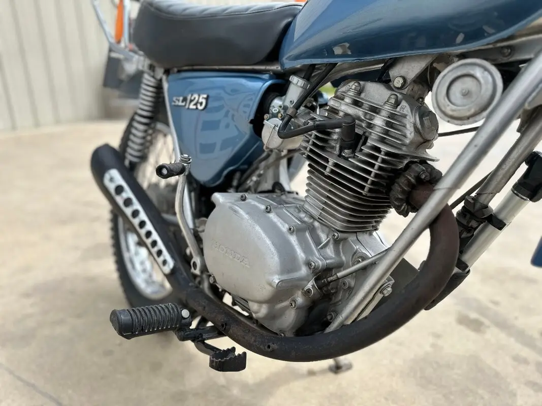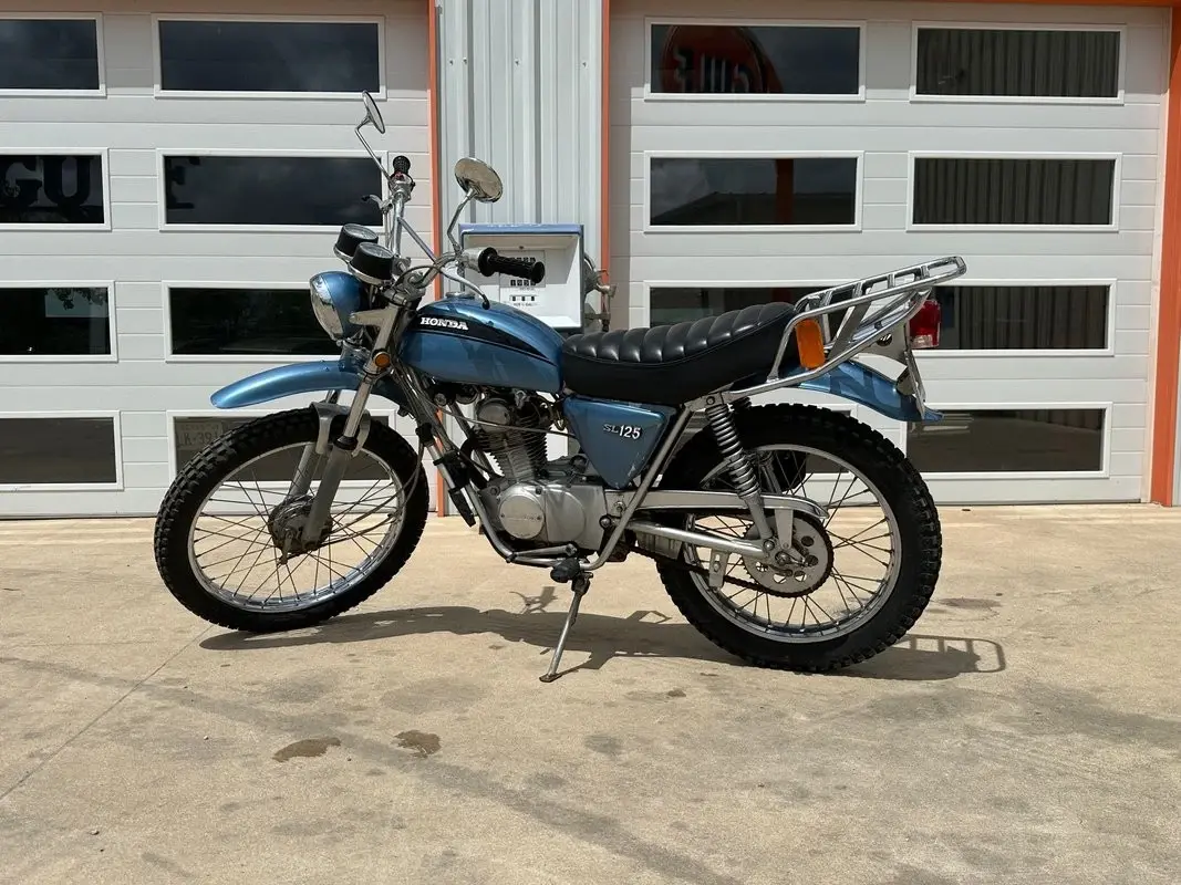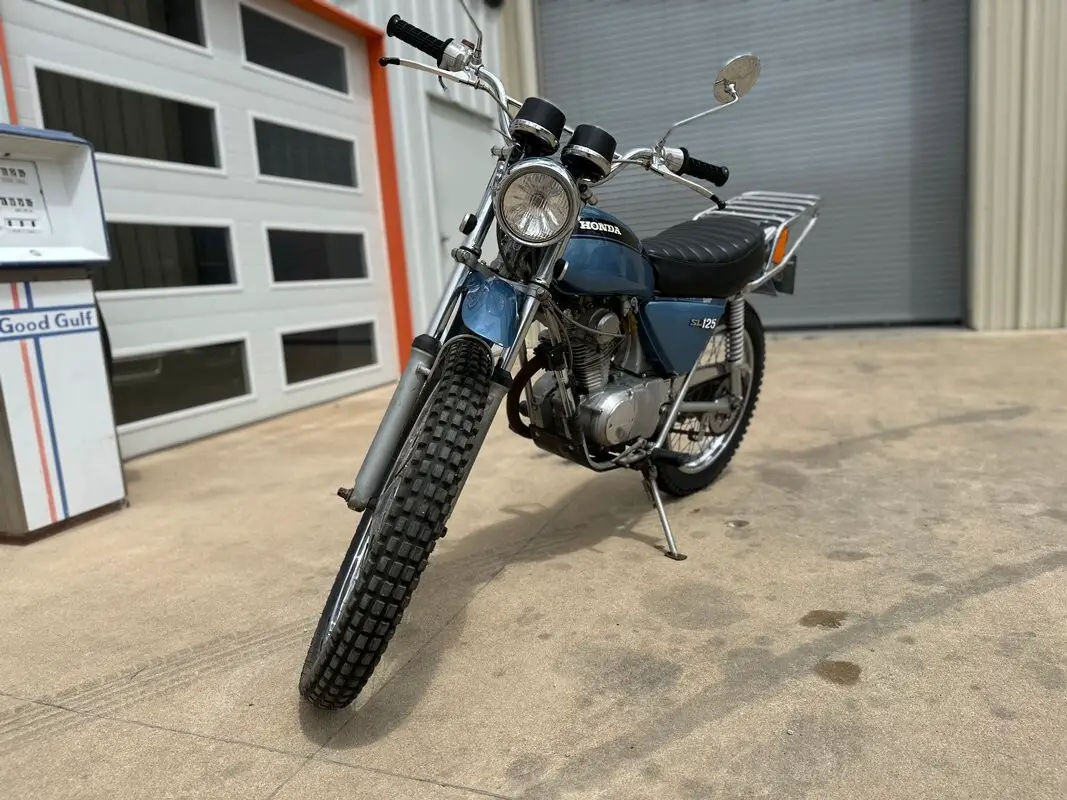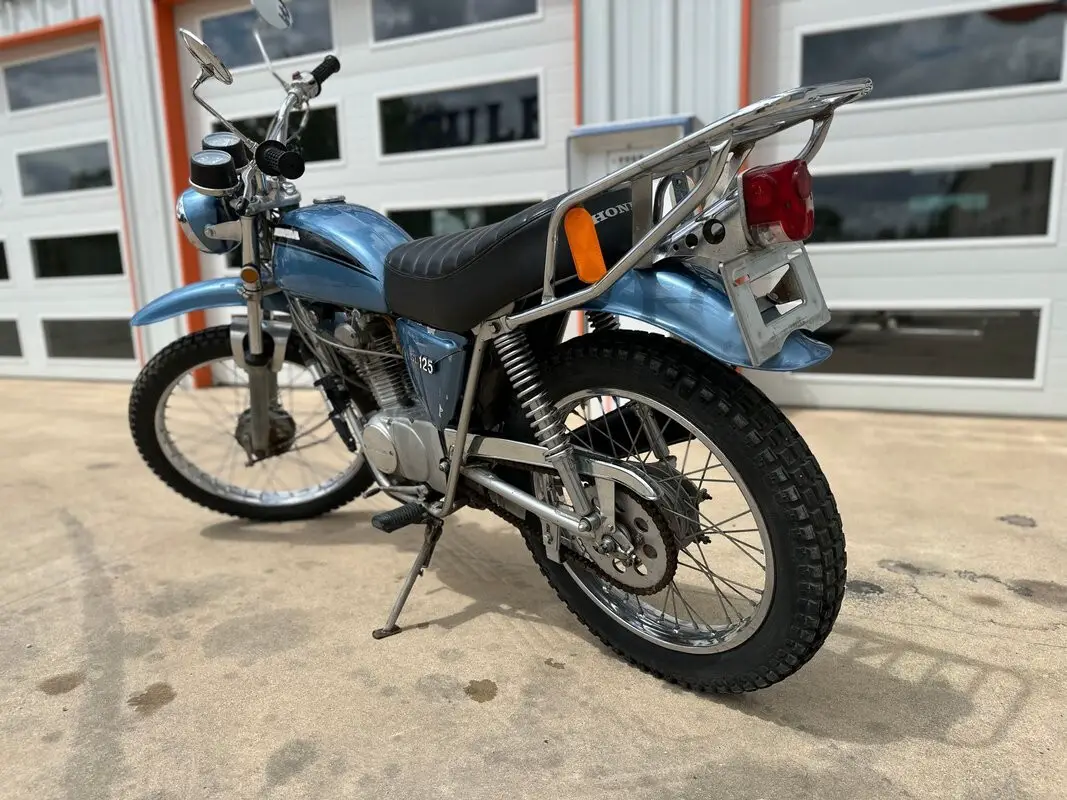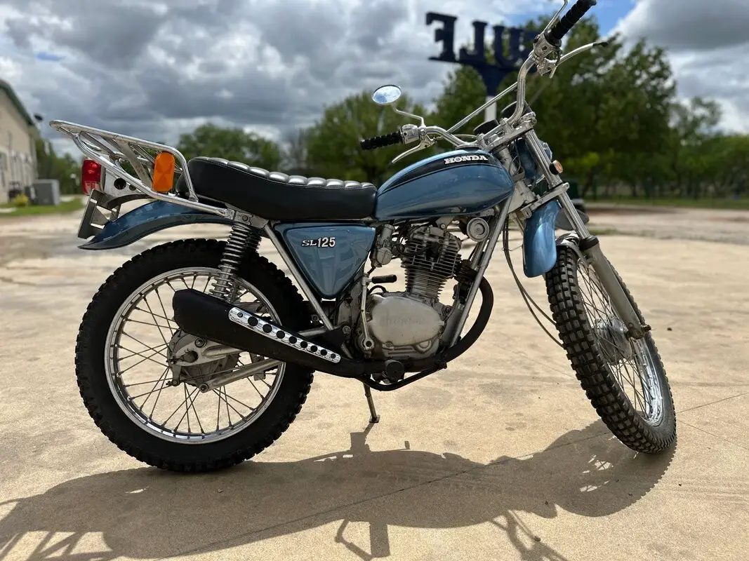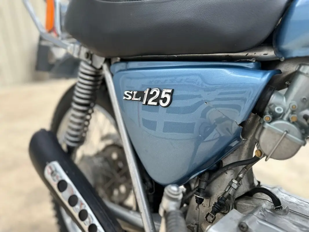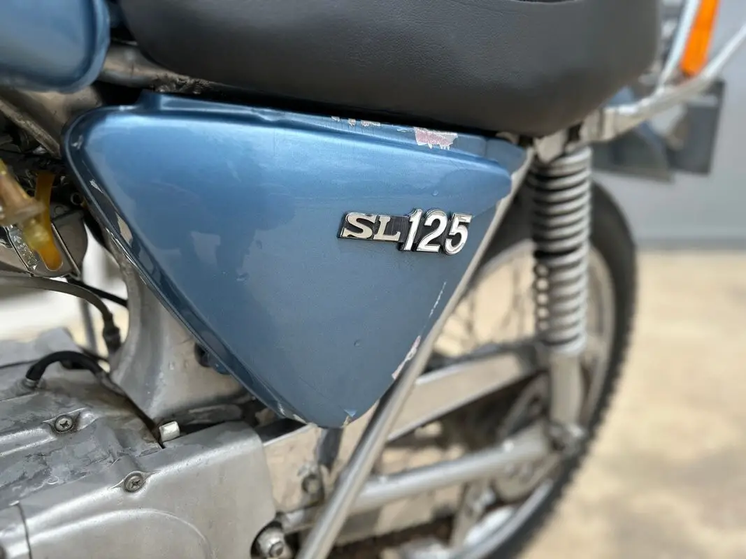 The 1972 SL125 features a Special Silver Metallic paint scheme (often with black accents or subtle stripes), a black pleated solo seat, chrome rear rack, high-mounted exhaust with heat shield, raised fenders, and a braced handlebar. It includes street-legal lighting and was designed as an entry-level trail bike - capable on light dirt/fire roads while remaining practical for commuting or casual road use.