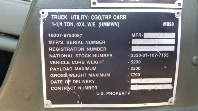 1990 HMMWV M998 with 3,278 miles. This is the 3rd Humvee I have owned since 2000. Divorce forces sale. Starts, runs and drives like new. Fully maintained. Titled and licensed in Florida and is street legal. VIN 104752. This HMMWV was purchased prior to PlanetGOV auctions. I have new passenger mirror not installed, antennae, radio box and armored grill. Tires are new with less than 100 miles. Has been stored in airport hanger for last 4 years. Original CARC paint. More photos available upon request. Call me with any questions. Mark 904-998-3903.