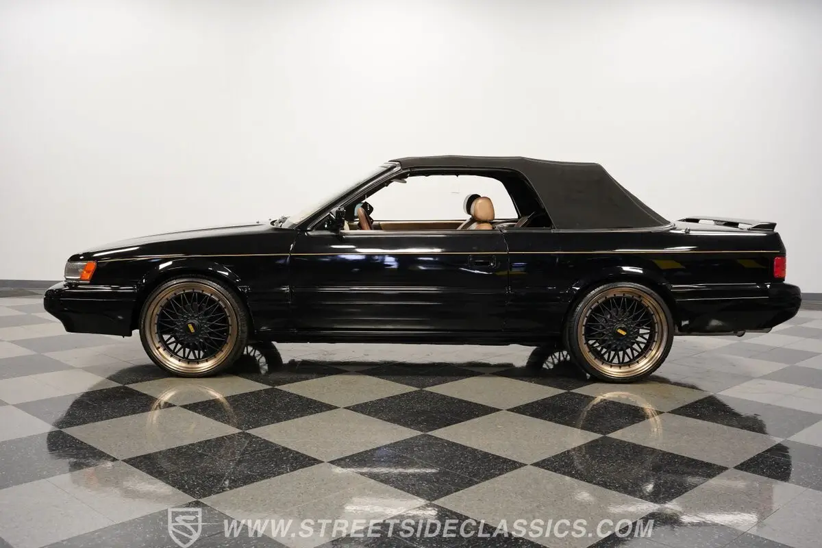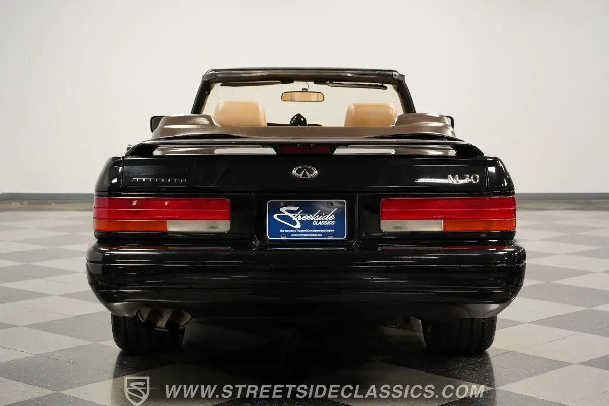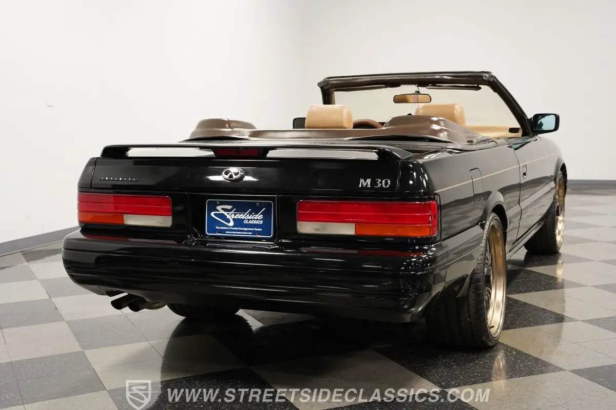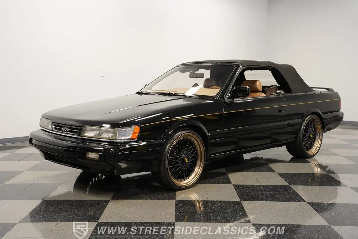 This little blacked-out buggy is pure fun to drive. Eye-catching and sexy, it's a 1991 Infiniti M30 Convertible. The tan interior complements the black exterior, highlighted by gold pinstripes and gold beauty rings on the 20-inch wheels. Its clean body lines and rear spoiler give it a sleek, balanced look. With the top up, it's sophisticated; with the top down, it's ready for warm-weather cruising.