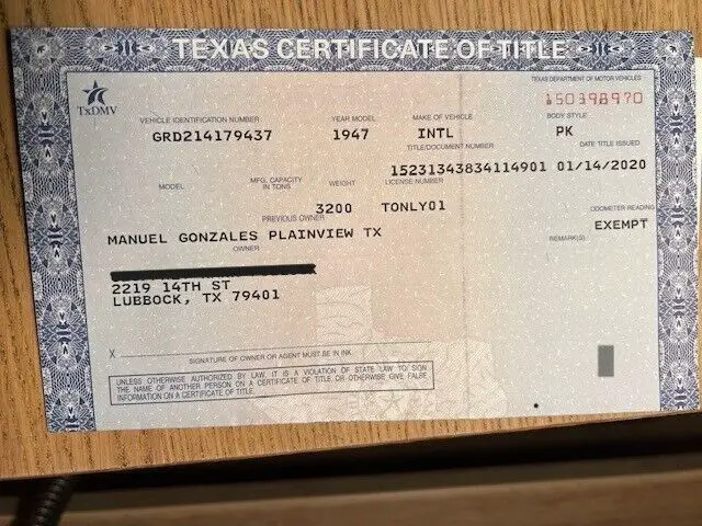1947 IHC KB-1 long bed: complete and rust-free (it has scale but no rust thru). Clear Texas title in my name. This truck was sold between cousins in LA and Texas several times over 50 years. This was a daily driver until 2012 +/- when it was parked in ultra-dry Plainview, Texas. Transmission is 3-on-a-tree, which has a syncro 1st gear. Was told that the rear gear set was replaced, so no problem hitting 70mph.