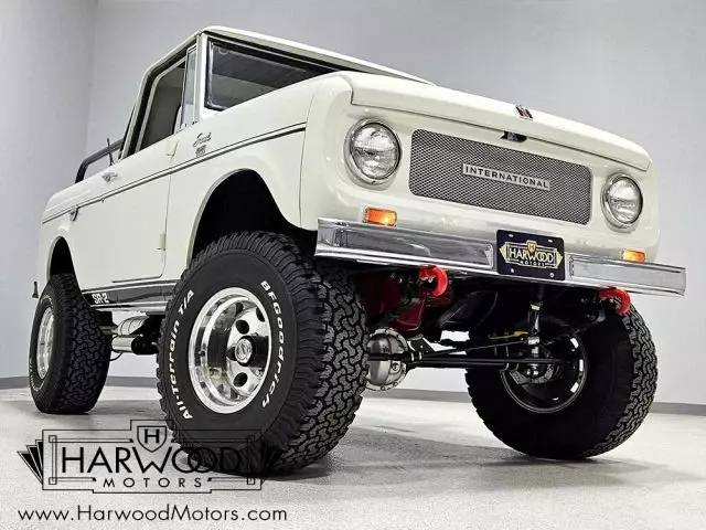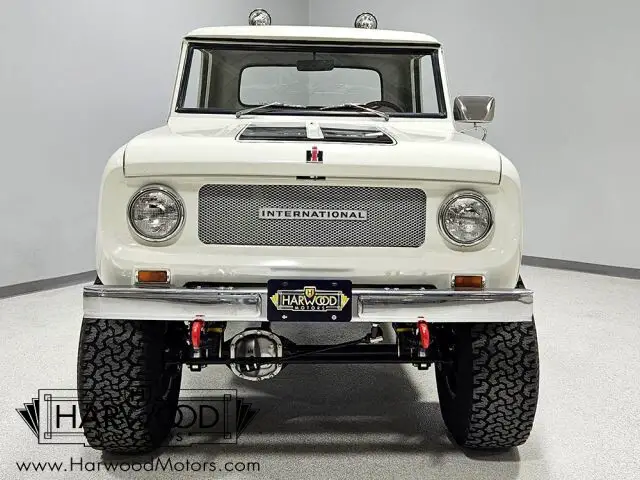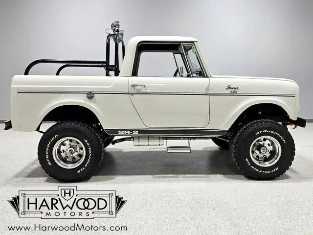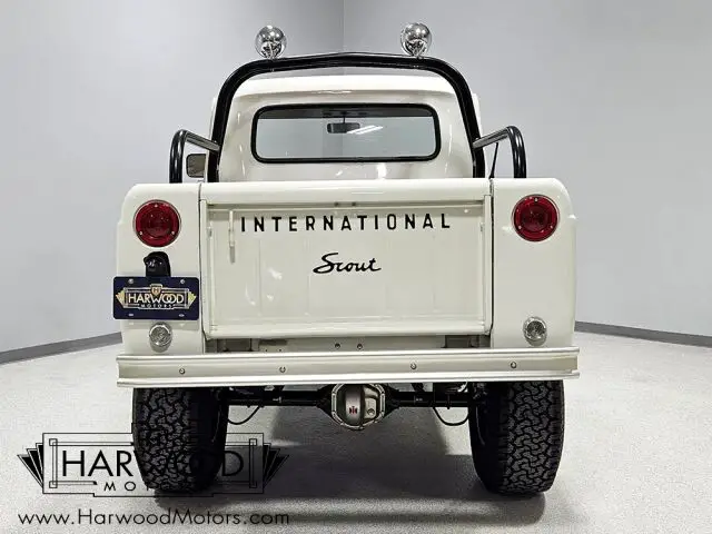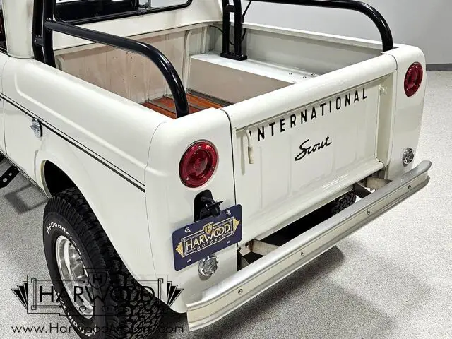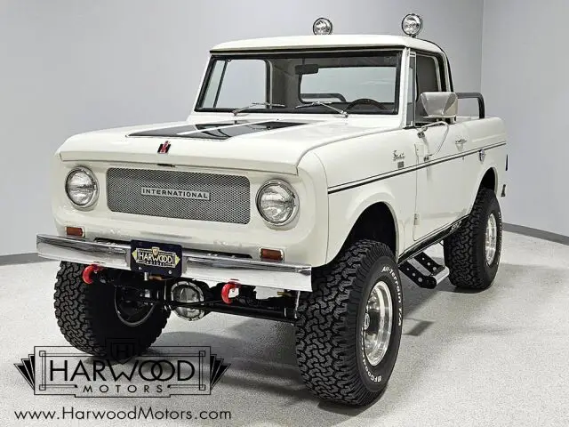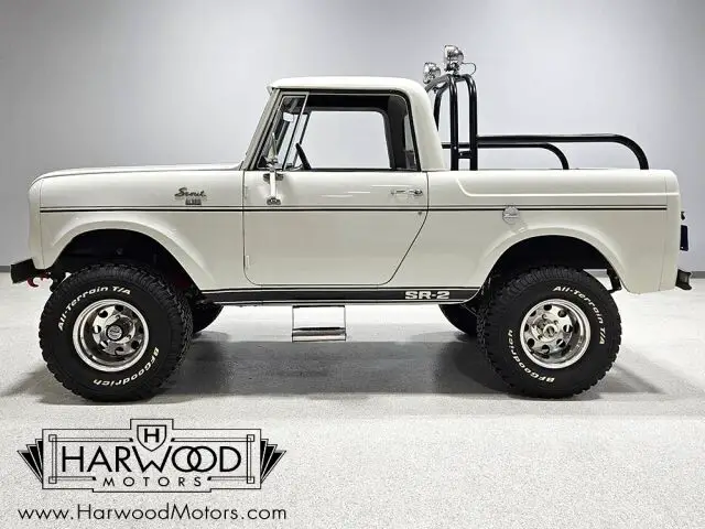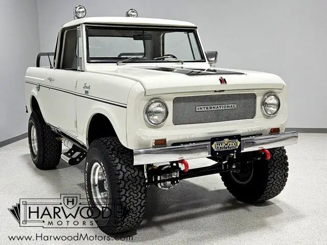 Unusual Scout half-cab pickup. Beautifully restored with numerous upgrades. Innovative 196 cubic inch engine, 3-speed manual, functional 4-wheel-drive. Added power steering and 4-wheel disc brakes. Rare and fun, this little Scout is the star of every show it attends.