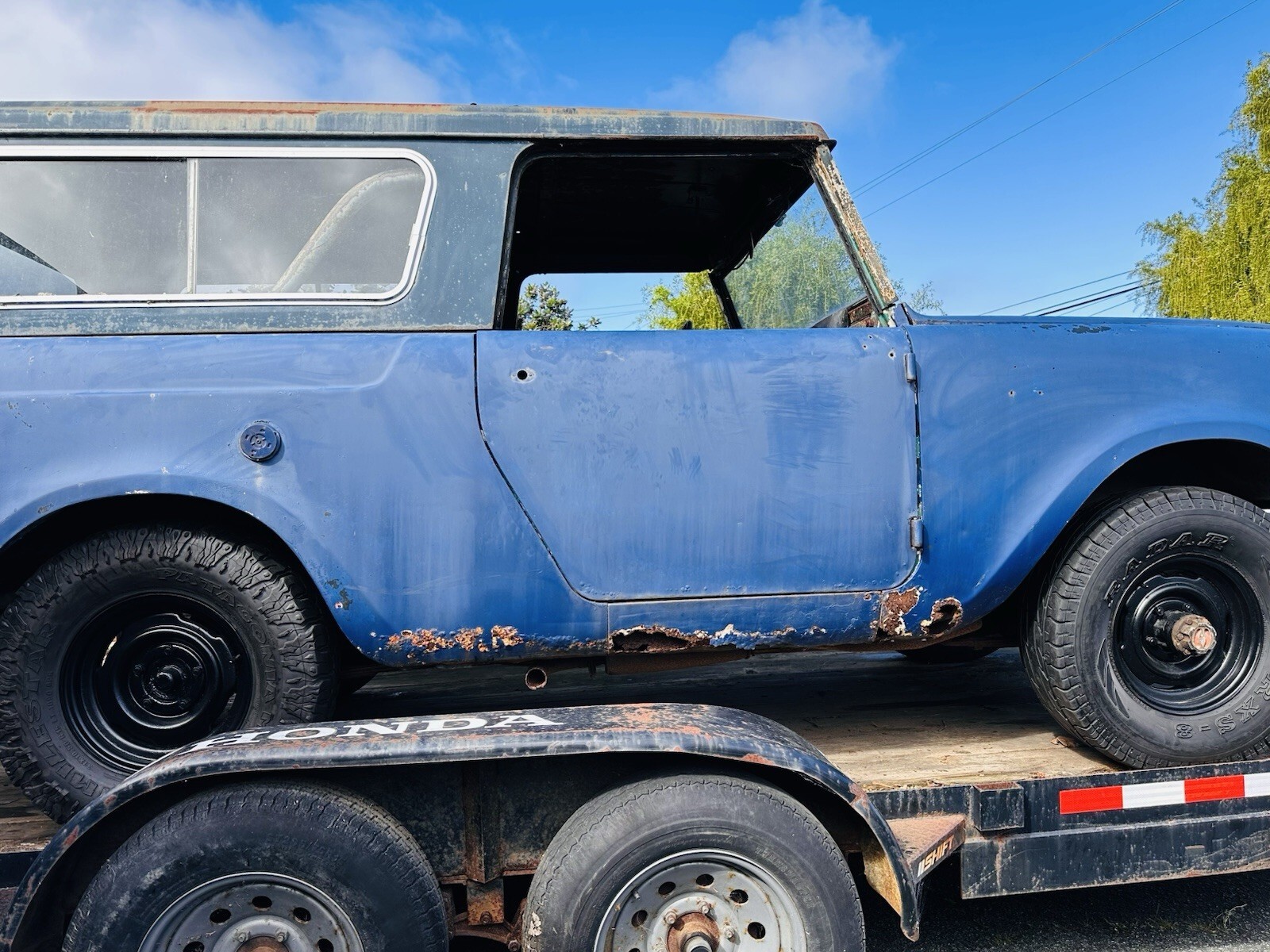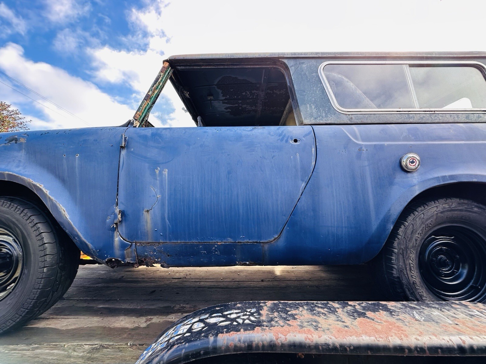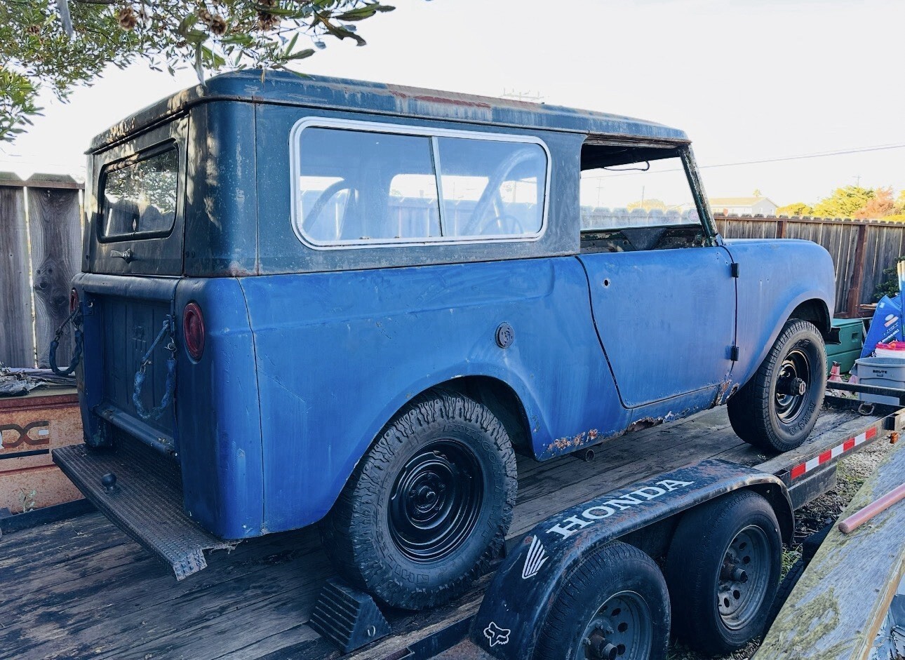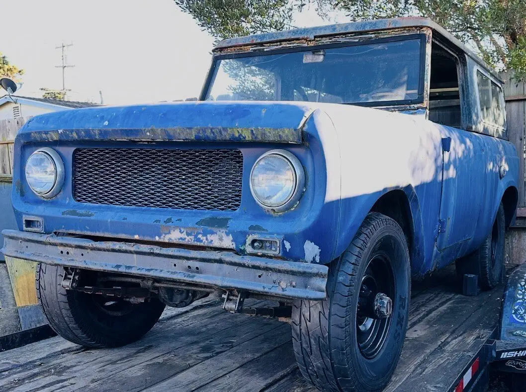 First year Scout. Full removable hard top. Has lots of rust and dents. Most body patch panels available online. Original 4 cyl. Engine, trans, driveline, etc. Has not been driven in 20 years. Needs full restoration. May deliver in Monterey area, or pickup. Clean title in hand.