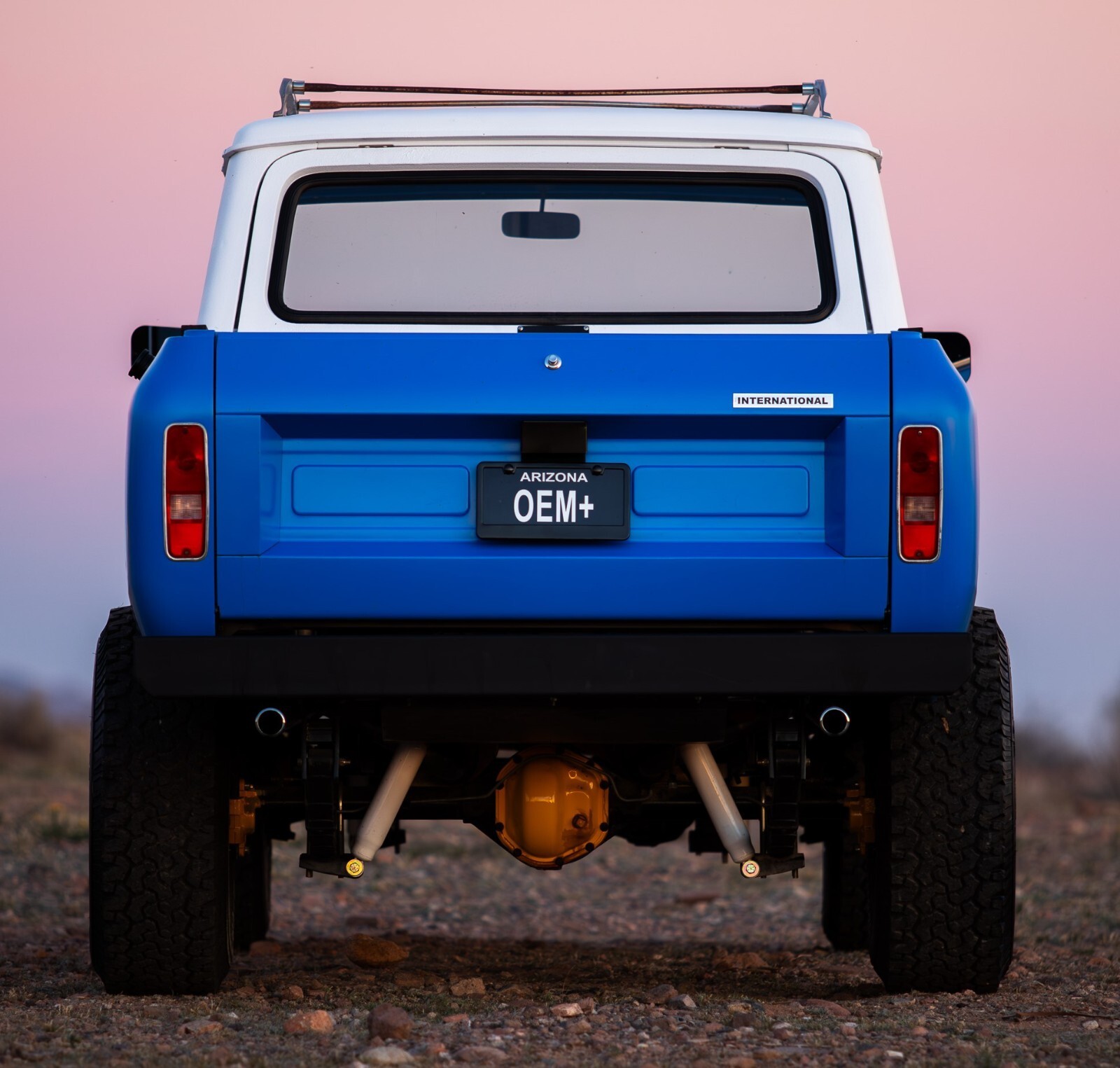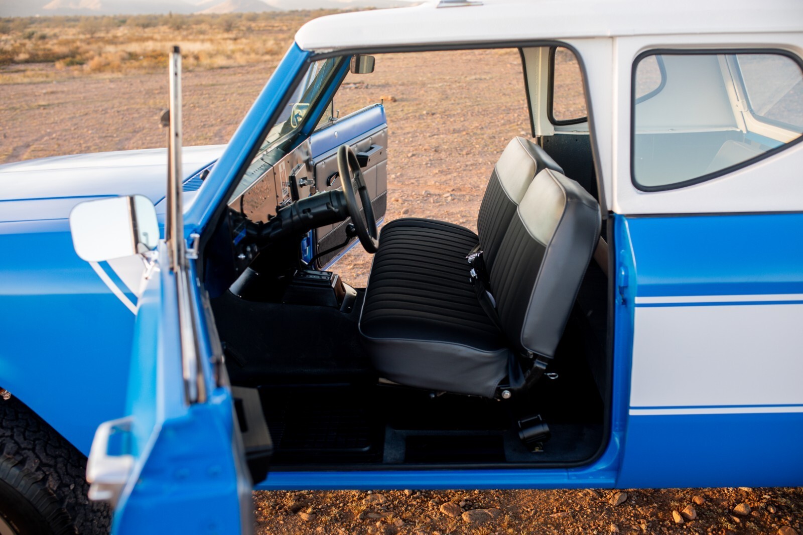 Finished in fresh Semi-Gloss/Satin Blue, this Scout has the perfect balance of rugged and refined. The Line-X White International hard top with all new seals contrasts beautifully against the paint, giving it that unmistakable vintage 4x4 stance.