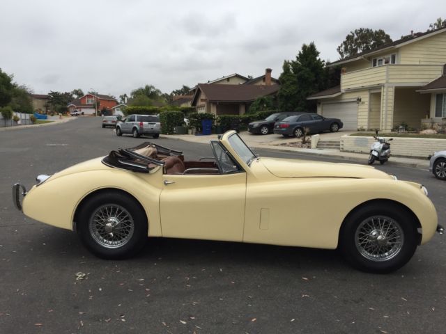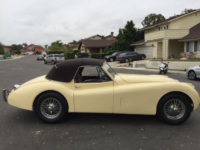 Jaguar xk-120 DHC. 5 year frame off restoration. Frame sandblasted and powder coated, body sandblasted. Engine, transmission and rear end all professionally rebuilt. New top with headliner, interior and wood. Wire wheels. Color is wheat with dark brown top and tobacco interior. Beautiful car. Call for more details. 619 422-8905