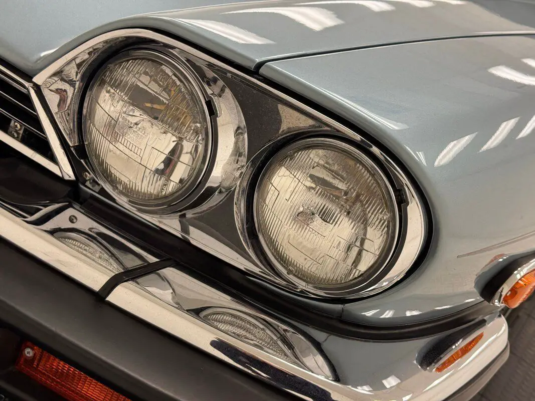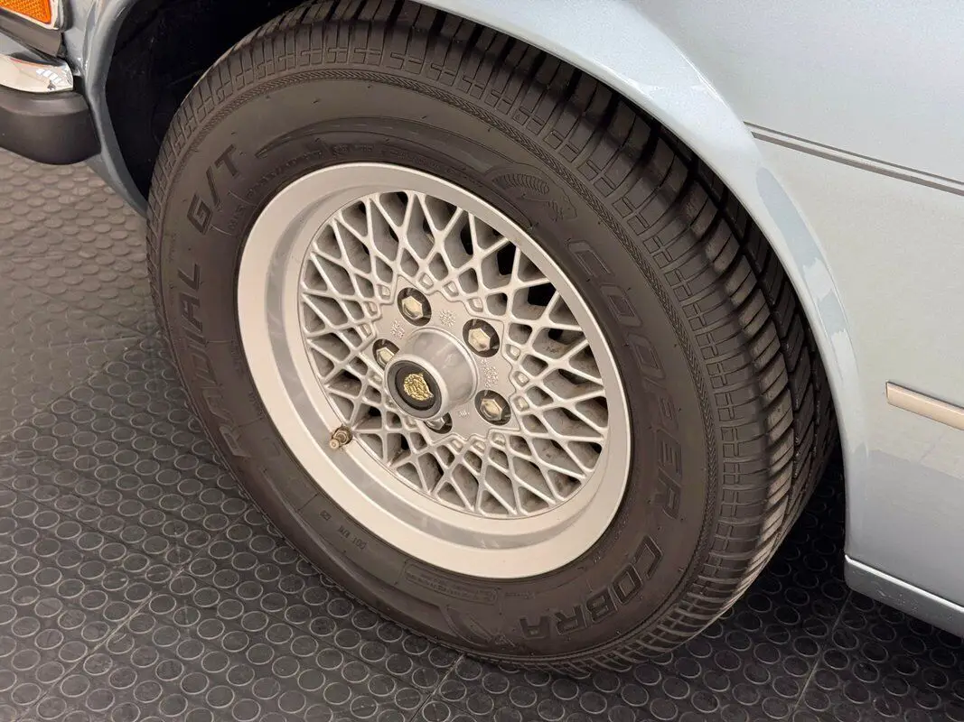 Ten colors were available for the 1990 XJS and this one shines in Artic Blue mated to a Dark Blue canvas roof which presents a rich contrast. A low shoulder line results in low wrap around bumpers, contouring to the gentle curve in front and arrow straight in back with very nice chrome. The flat deck lid rounds off at the edges and the distinctive tail lights absorb that shape and fit flush, symmetrically positioned over fluted dual exhaust tips. In front, the long, sleek hood descends into a valley flanked by lifting body panels that take in the quad headlights next to a streamlined grille and covered fog lights. 15-inch gray mesh style wheels seem just right for this personal luxury vehicle which has excellent paint and brightwork, along with a top that's in great shape. A single scuff on the radius of a wheel opening is the only imperfection we find on the outside.
