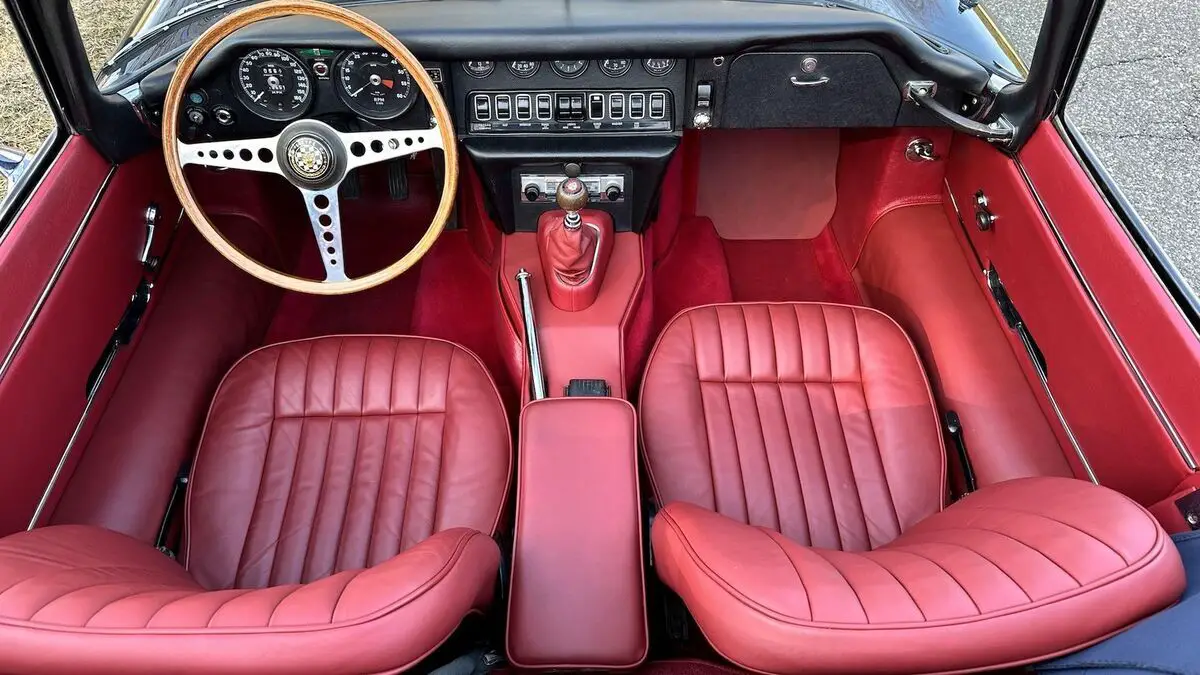 This is a highly restored, series 1.5 Jaguar XKE Roadster. Finished in stunning Azure Blue with a red leather interior. Car has had over $60,000 in mechanical sorting in the last few years and has a brand new interior from marque experts, Bassett of Rhode Island. All new leather seats, with correct moquette backing, correct new wool carpeting and matching hardura trim. Tires are redline, soft top is correct stayfast. The paint and chrome are excellent. Mechanically the car runs beautifully and has been fully sorted by our service department.