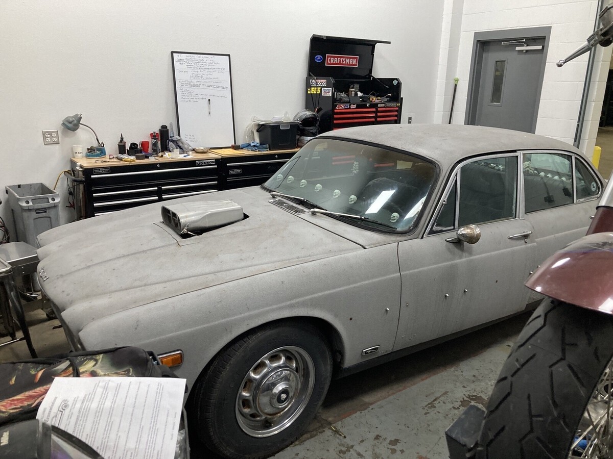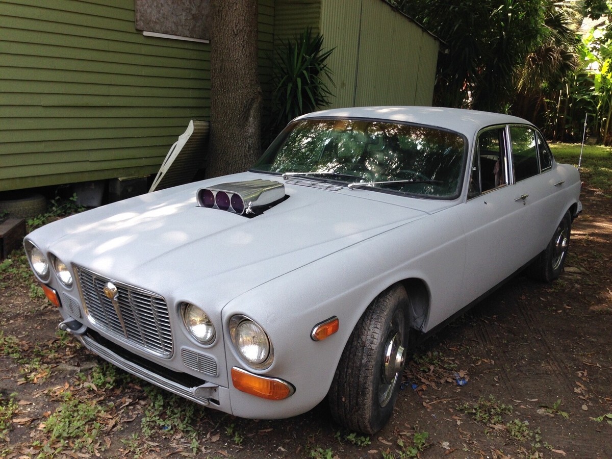 This is a 1969 Jaguar XJ with a chevy 350 v8 mated to the original automatic transmission. I drove it for years here in New Orleans. in 2020 I parked it with electrical issues and it sat for a few years! Now the motor won't turn over, the wiring is a mess, and the brakes ( original jag inboards on the rear axel ) are rough. I am moving on to another ratrod project & this one has to go!! If you are feeling brave enough, this thing is a straightforward ratrod project & will bring this amazing car back to life! The exterior is a grey pickup truck bedliner finish, and looks like cinderblock. If you are looking for a parts car for an xj6 build, there is a great '69 black leather interior, lots of original switches & dials, great glass, etc etc. yes, there is a hoodscoop hole cut into the hood, and the "blower" is just an air intake with a mechanical opener attached to a good edelbrock carb setup.
