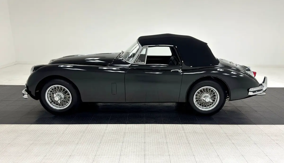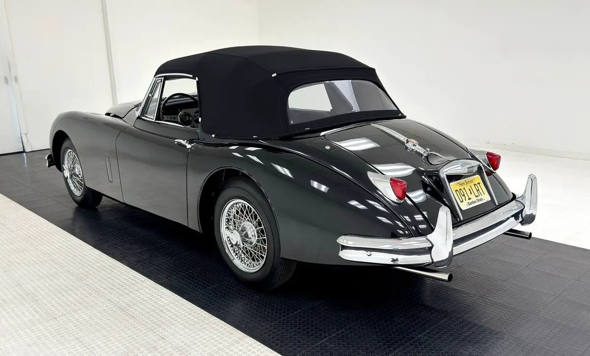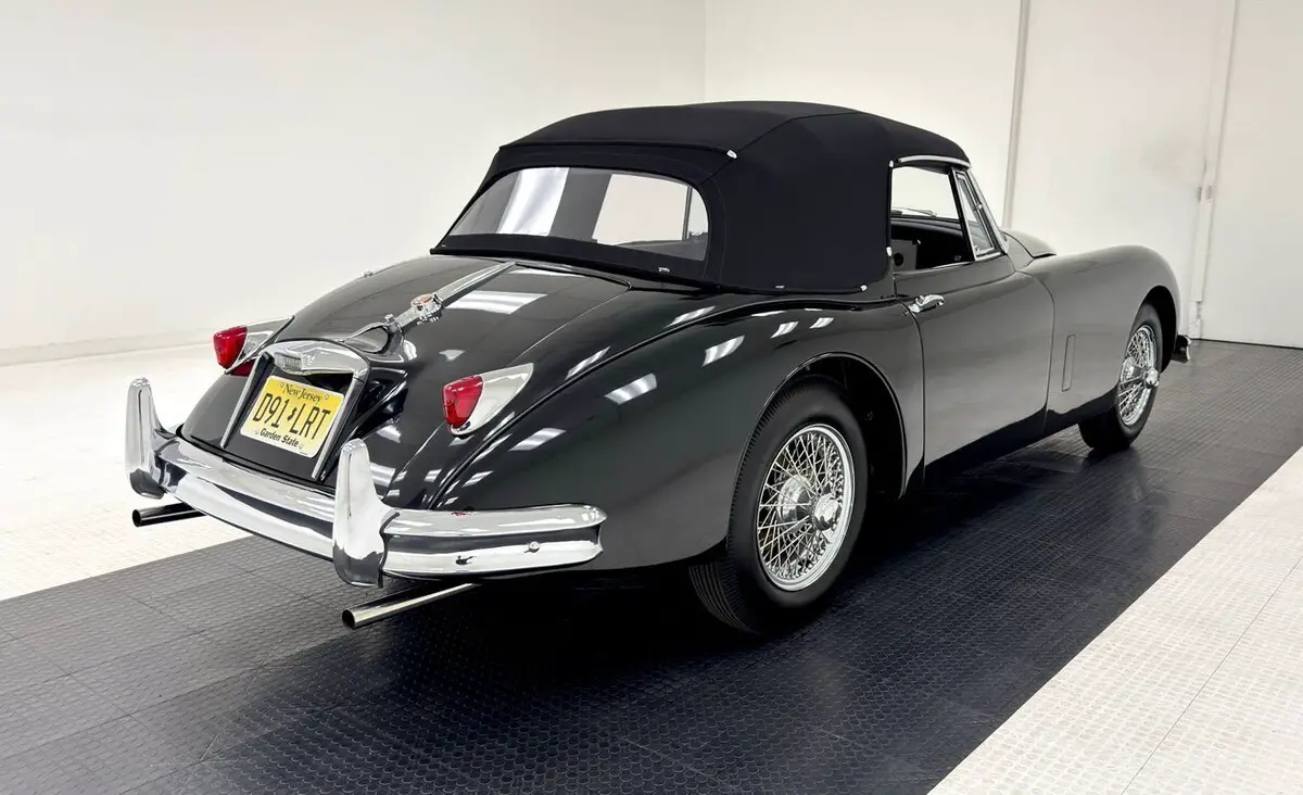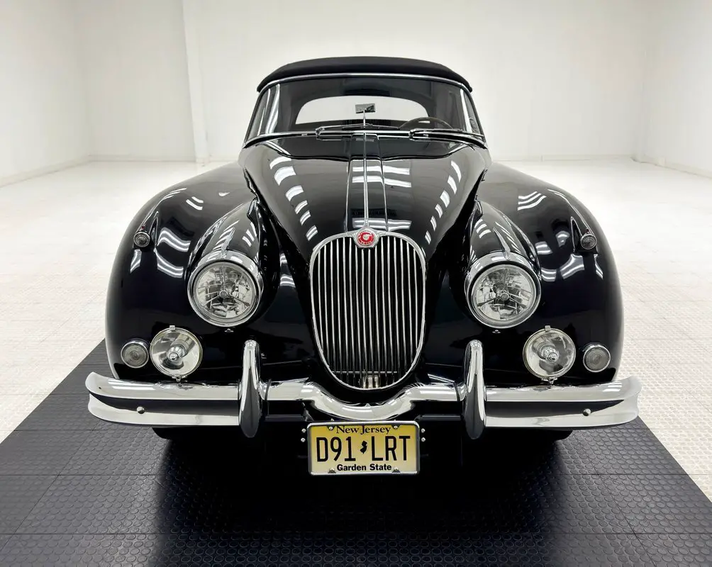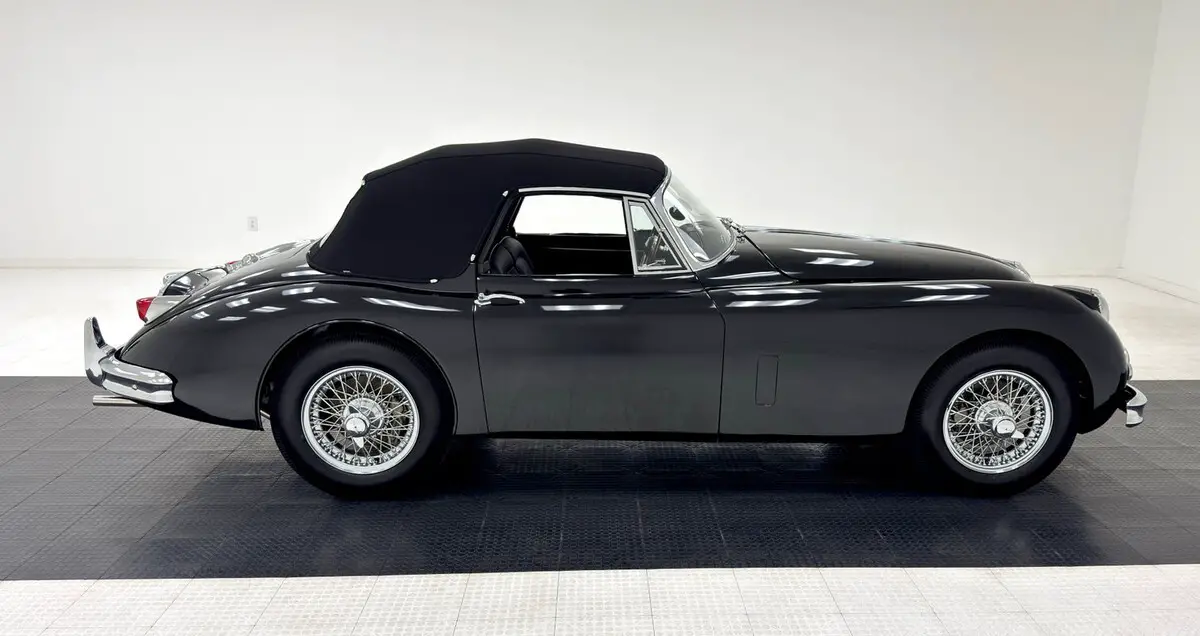 We all have our favorite British roadsters, but objectively speaking, the lines of the XK150 are truly stunning and dipped here in a vat of black ink which only makes the chrome pop in contrast, from the streamlined grille, the bumper that contours to that grille, the light rings, and the 16-inch chrome wire wheels. Not to be outdone, the polished frame of the slender windscreen also shines and meets vent windows at the corners. The rear is a work of art with stainless trim creating a mid rib over an ornate plate surround, a wraparound bumper, two polished tips, and bold chrome housing on the diminutive tail lights. Swooping front fenders create a cavernous space to the hood from which the headlights emerge from dramatic, cylindrical protrusions, while large fog lights are propped up on the bumper. The canvas black top is in immaculate condition and its plastic window remains clear. The paint and brightwork are very nice and the only imperfection we note is a paint scrape on the inside of the door on the latch panel.