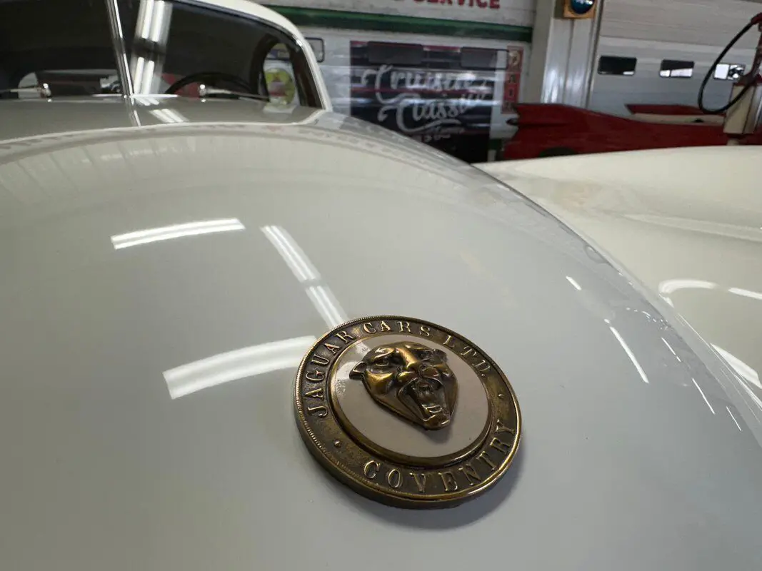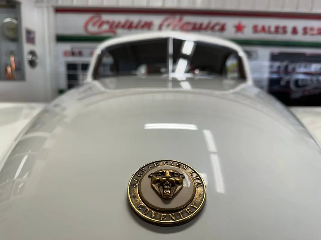Open the driver's door to reveal an exquisite interior appointed with red leather, burled walnut, and shining chrome. The door panels are covered with red leather, capped off at the top with a strip of luxurious burled walnut. The OEM-correct door handles and window cranks feature elegant styling and look like new. Flawless red leather seats with bucket bases and a split bench back welcome you inside for a special driving experience. Once you're inside with the door shut, you can see that the side windows are entirely framed with burled walnut, and it covers the entire dash as well. The red carpet underfoot is new and fresh with a perfect fit. Rising from the center tunnel is a black pattern knob shifter with a chrome stalk and a red leather boot. Just to the right of the shifter is a chromed emergency brake lever, also with a red leather boot. Directly ahead of the driver is a black 4-spoke OEM steering wheel on a telescopic column. The wheel features a chrome band with a Jaguar head at the center of the working horn button and a slider just above the button that operates the turn signal indicators. The beautiful wood dash ahead of the passengers is truly a work of automotive art! Atop the center of the dash is a miniscule rear-view mirror and an even smaller ashtray. Set in the dash itself are working Smiths gauges for oil, water, petrol, and oil as well as a 140mph speedometer and a reverse-sweep tachometer with built-in analog clock. There are switches for panel & interior lights and a knob for exterior lights. You'll also notice that amongst the gauges are controls for the working wipers and heater. The key ignition is located on the dashboard, and so is the start button. Beneath the gauges is a slide-out wooden drawer with a felt liner. At the far right of the dash is a locking door with even more green felt-lined storage behind it. There is a chrome pull-knob beneath the passenger side of the dash that acts as a hood release. Overhead, you'll find a tight grey fabric headliner and two tinted plexiglass visors. If you fold the front seats forward, you can access a wide but shallow storage space at the top of the rear package tray with a lift-up door.