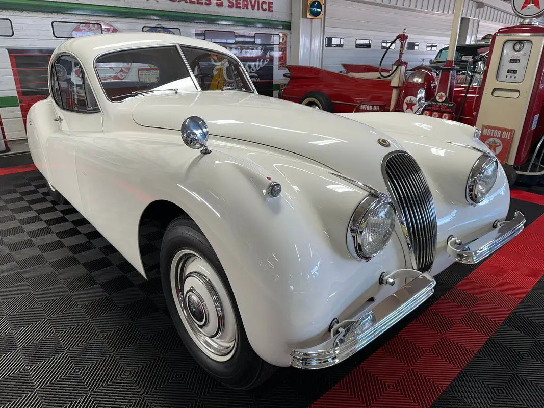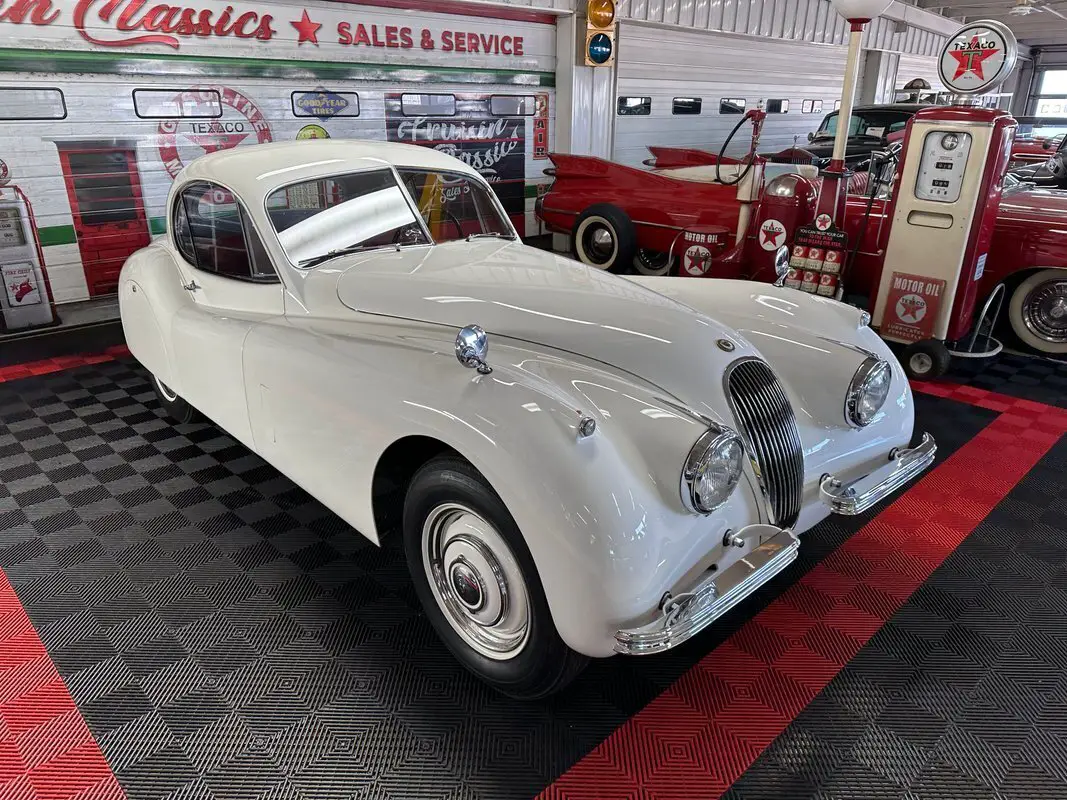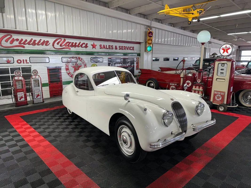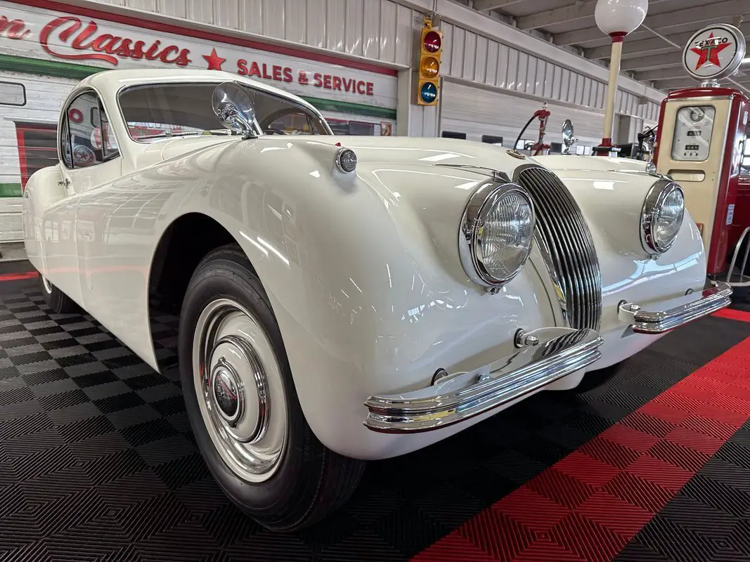 Vehicle Original VIN : 679593Cruisin Classics is proud to present to you this stunning 1953 Jaguar XK120 Fixed Head Coupe. The XK120 was launched in open two-seater roadster form at the 1948 London Motor Show as a testbed and show car for the new Jaguar XK engine designed by Jaguar Chief Engineer William Heynes. The sports car caused a sensation, which persuaded Jaguar Founder and Chairman William Lyons to put it into production. The XK120 set new standards of comfort, handling, and performance for British sports cars and, in keeping with the Jaguar tradition, there was nothing to touch it at the price. The XK120's claim to fame (and the reason for its name) was the fact that it was capable of sustained high-speed cruising at 120mph – making it the fastest production car in the world at the time. Jaguar began manufacturing the fixed-head coupe version of the XK120 in mid-1951 and produced only 2,477 left-hand drive models by mid-1954 (when production of the XK140 started) – making it quite a rare find today! The car before us today was produced on April 4th, 1952, with red paint and biscuit interior was then sent to Los Angeles, California, per the Jaguar Heritage Trust Certificate. After examining the car, we have determined that this XK120 retains its original numbers-matching chassis, body, engine block, head, and 4-speed manual transmission! That's right - this is a true numbers-matching car! This Jaguar comes to us fresh from a complete nut-and-bolt restoration that touched literally every inch of the car. It is now dressed in a show-quality coat of fresh Ivory paint with a gorgeous red interior – an absolutely perfect color combination for this coupe! The white paint really brings out the swooping body lines of what is widely considered one of the most beautiful shapes ever to grace an automobile. The body itself is made of pressed steel with aluminum doors, bonnet, and boot lid. All the chrome and brightwork on the car is in exceptional condition with a brilliant shine and no pitting. Up front, you'll find a gleaming vertical-bar oval grille flanked by round Lucas headlamps set in bright bezels and mirror-finish chrome bumperettes down low. Above the grille is a like-new gold Jaguar head badge, and up on top of the fenders are dual chrome side mirrors and turn signal indicators. The curved bonnet leads your attention back to a chrome-framed split windshield complete with a set of bright wiper arms. The windshield and all of the other glass on the car are brand new and crystal clear. The main door windows as well as the front and rear pop-out vent windows are all framed in chrome trim, just like the windshield. The view from the side of this Jaguar is truly the most breathtaking vantage point, showing off the swooping fender lines and the curvaceous top. The wheel/tire combination brings the whole look together with Ivory-painted steel wheels, beauty rings, and correct Jaguar centercaps all wrapped in new Dunlop Road Speed RS5 tires (6-ply nylon tube-type). Removable rear fender spats enhance the streamlined look from the side. Sophisticated styling continues around back with a downward-sloping rear end that features round taillights in bright fixtures, dual vertical chrome bumperettes, a locking gas fill door, a bright license plate lamp fixture, and a single stainless steel tailpipe peeking out from underneath. Twist the bright handle and lift the boot lid to find an immaculate trunk with red vinyl lining, a full spare, a period air-pump, and all of the correct factory jacking equipment mounted to the sidewalls. The leather strap that would hold the factory tool roll is present, though the tool roll is not. The undercarriage of this XK120 is just as exceptional as the top side, and it's painted Ivory just like the body. It is obvious that literally every detail underneath was attended to with equal vigor during the restoration. Under the bonnet is an exemplary engine bay that is home to the fabulous XK engine that made these Jaguars famous. It is a 3.4-liter 210ci straight six cylinder engine that boasts twin overhead camshafts running in an aluminum-alloy cylinder head with seven main bearings and a maximum output of 160bhp. It is a low-compression engine by today's standards (8:1) and can be run on standard pump gas. Other engine highlights include correct twin side-draft SU carburetors (both were rebuilt), gleaming valve covers, black porcelain-coated exhaust manifolds, and a correct Jaguar grease gun mounted on the sidewall. The engine was rebuilt during the restoration process, and it starts and runs like a top. The engine is mated to a 4-speed manual gearbox (also rebuilt) that shifts easily as it sends power to the rear wheels. Stopping power comes from 4-wheel 12" hydraulic drum brakes. Open the driver's door to reveal an exquisite interior appointed with red leather, burled walnut, and shining chrome. The door panels are covered with red leather, capped off at the top with a strip of luxurious burled walnut. The OEM-correct door handles and window cranks feature elegant styling and look like new. Flawless red leather seats with bucket bases and a split bench back welcome you inside for a special driving experience. Once you're inside with the door shut, you can see that the side windows are entirely framed with burled walnut, and it covers the entire dash as well. The red carpet underfoot is new and fresh with a perfect fit. Rising from the center tunnel is a black pattern knob shifter with a chrome stalk and a red leather boot. Just to the right of the shifter is a chromed emergency brake lever, also with a red leather boot. Directly ahead of the driver is a black 4-spoke OEM steering wheel on a telescopic column. The wheel features a chrome band with a Jaguar head at the center of the working horn button and a slider just above the button that operates the turn signal indicators. The beautiful wood dash ahead of the passengers is truly a work of automotive art! A