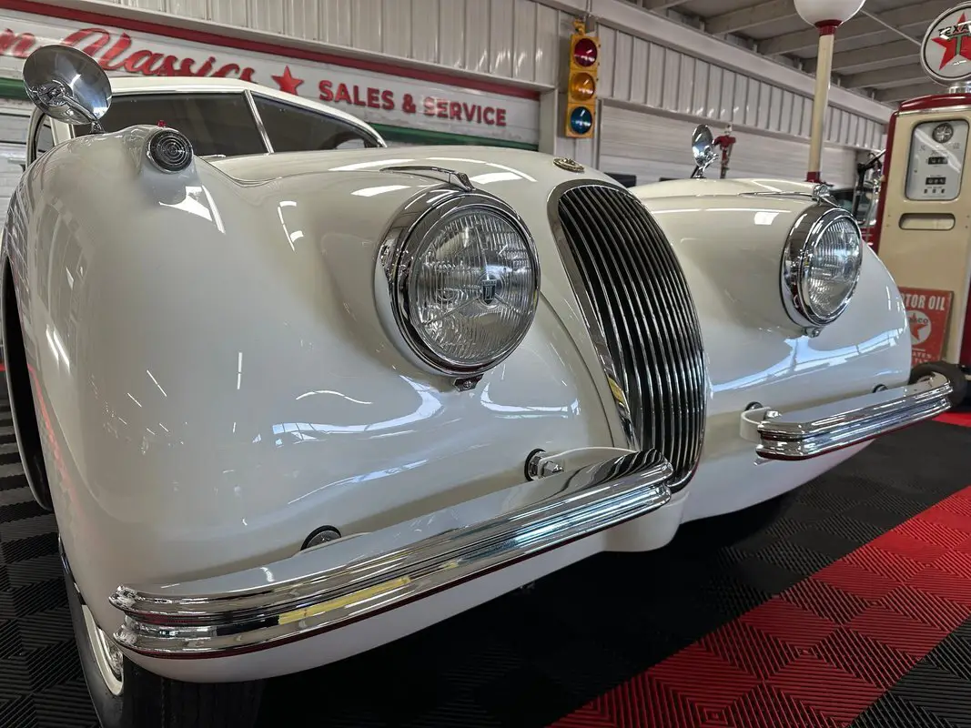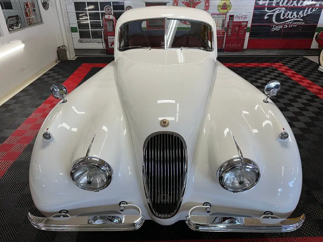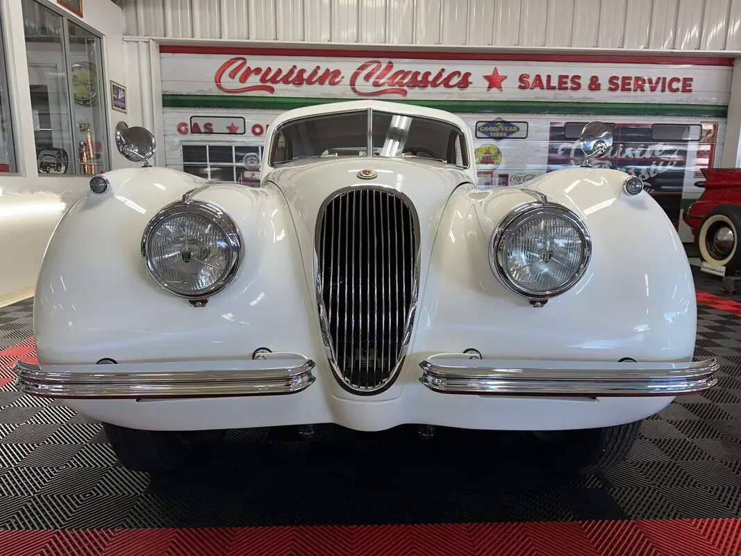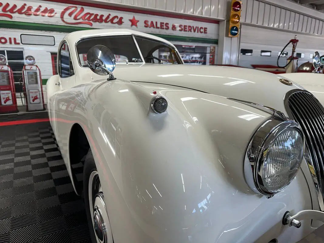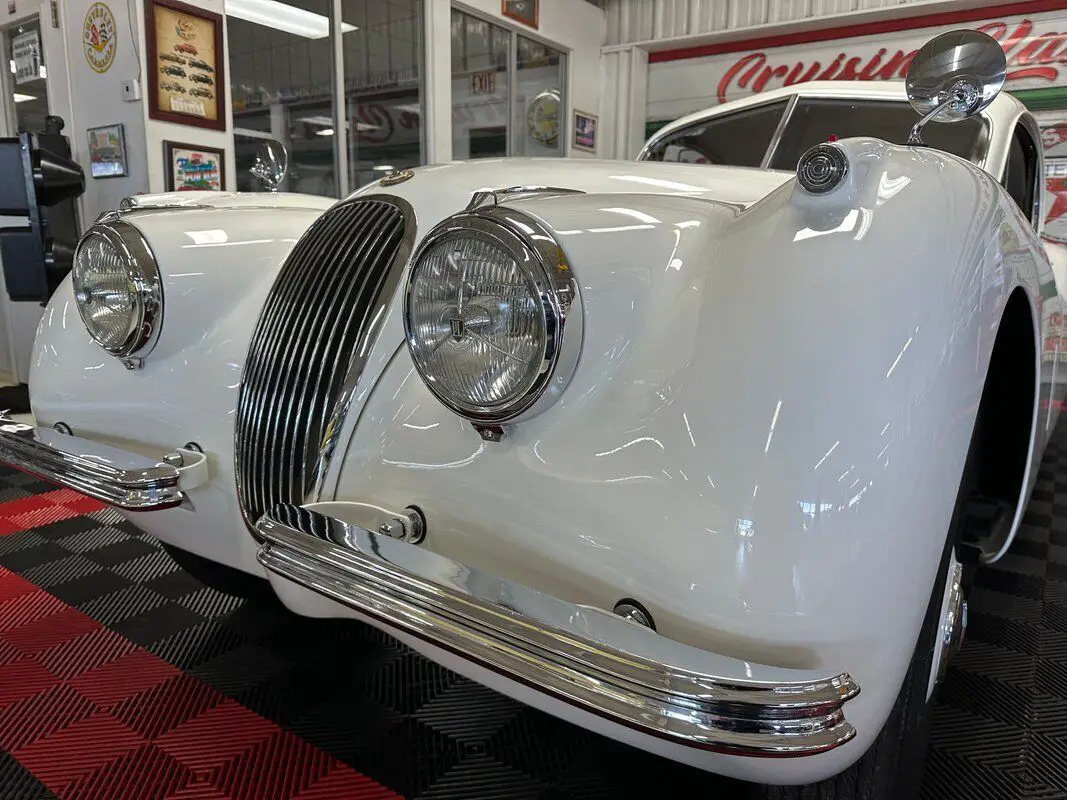 Vehicle Original VIN : 679593Cruisin Classics is proud to present to you this stunning 1953 Jaguar XK120 Fixed Head Coupe. The XK120 was launched in open two-seater roadster form at the 1948 London Motor Show as a testbed and show car for the new Jaguar XK engine designed by Jaguar Chief Engineer William Heynes. The sports car caused a sensation, which persuaded Jaguar Founder and Chairman William Lyons to put it into production. The XK120 set new standards of comfort, handling, and performance for British sports cars and, in keeping with the Jaguar tradition, there was nothing to touch it at the price. The XK120's claim to fame (and the reason for its name) was the fact that it was capable of sustained high-speed cruising at 120mph – making it the fastest production car in the world at the time. Jaguar began manufacturing the fixed-head coupe version of the XK120 in mid-1951 and produced only 2,477 left-hand drive models by mid-1954 (when production of the XK140 started) – making it quite a rare find today! The car before us today was produced on April 4th, 1952, with red paint and biscuit interior was then sent to Los Angeles, California, per the Jaguar Heritage Trust Certificate. After examining the car, we have determined that this XK120 retains its original numbers-matching chassis, body, engine block, head, and 4-speed manual transmission! That's right - this is a true numbers-matching car! This Jaguar comes to us fresh from a complete nut-and-bolt restoration that touched literally every inch of the car. It is now dressed in a show-quality coat of fresh Ivory paint with a gorgeous red interior – an absolutely perfect color combination for this coupe! The white paint really brings out the swooping body lines of what is widely considered one of the most beautiful shapes ever to grace an automobile. The body itself is made of pressed steel with aluminum doors, bonnet, and boot lid. All the chrome and brightwork on the car is in exceptional condition with a brilliant shine and no pitting. Up front, you'll find a gleaming vertical-bar oval grille flanked by round Lucas headlamps set in bright bezels and mirror-finish chrome bumperettes down low. Above the grille is a like-new gold Jaguar head badge, and up on top of the fenders are dual chrome side mirrors and turn signal indicators. The curved bonnet leads your attention back to a chrome-framed split windshield complete with a set of bright wiper arms. The windshield and all of the other glass on the car are brand new and crystal clear. The main door windows as well as the front and rear pop-out vent windows are all framed in chrome trim, just like the windshield. The view from the side of this Jaguar is truly the most breathtaking vantage point, showing off the swooping fender lines and the curvaceous top. The wheel/tire combination brings the whole look together with Ivory-painted steel wheels, beauty rings, and correct Jaguar centercaps all wrapped in new Dunlop Road Speed RS5 tires (6-ply nylon tube-type). Removable rear fender spats enhance the streamlined look from the side. Sophisticated styling continues around back with a downward-sloping rear end that features round taillights in bright fixtures, dual vertical chrome bumperettes, a locking gas fill door, a bright license plate lamp fixture, and a single stainless steel tailpipe peeking out from underneath. Twist the bright handle and lift the boot lid to find an immaculate trunk with red vinyl lining, a full spare, a period air-pump, and all of the correct factory jacking equipment mounted to the sidewalls. The leather strap that would hold the factory tool roll is present, though the tool roll is not. The undercarriage of this XK120 is just as exceptional as the top side, and it's painted Ivory just like the body. It is obvious that literally every detail underneath was attended to with equal vigor during the restoration. Under the bonnet is an exemplary engine bay that is home to the fabulous XK engine that made these Jaguars famous. It is a 3.4-liter 210ci straight six cylinder engine that boasts twin overhead camshafts running in an aluminum-alloy cylinder head with seven main bearings and a maximum output of 160bhp. It is a low-compression engine by today's standards (8:1) and can be run on standard pump gas. Other engine highlights include correct twin side-draft SU carburetors (both were rebuilt), gleaming valve covers, black porcelain-coated exhaust manifolds, and a correct Jaguar grease gun mounted on the sidewall. The engine was rebuilt during the restoration process, and it starts and runs like a top. The engine is mated to a 4-speed manual gearbox (also rebuilt) that shifts easily as it sends power to the rear wheels. Stopping power comes from 4-wheel 12" hydraulic drum brakes. Open the driver's door to reveal an exquisite interior appointed with red leather, burled walnut, and shining chrome. The door panels are covered with red leather, capped off at the top with a strip of luxurious burled walnut. The OEM-correct door handles and window cranks feature elegant styling and look like new. Flawless red leather seats with bucket bases and a split bench back welcome you inside for a special driving experience. Once you're inside with the door shut, you can see that the side windows are entirely framed with burled walnut, and it covers the entire dash as well. The red carpet underfoot is new and fresh with a perfect fit. Rising from the center tunnel is a black pattern knob shifter with a chrome stalk and a red leather boot. Just to the right of the shifter is a chromed emergency brake lever, also with a red leather boot. Directly ahead of the driver is a black 4-spoke OEM steering wheel on a telescopic column. The wheel features a chrome band with a Jaguar head at the center of the working horn button and a slider just above the button that operates the turn signal indicators. The beautiful wood dash ahead of the passengers is truly a work of automotive art! A