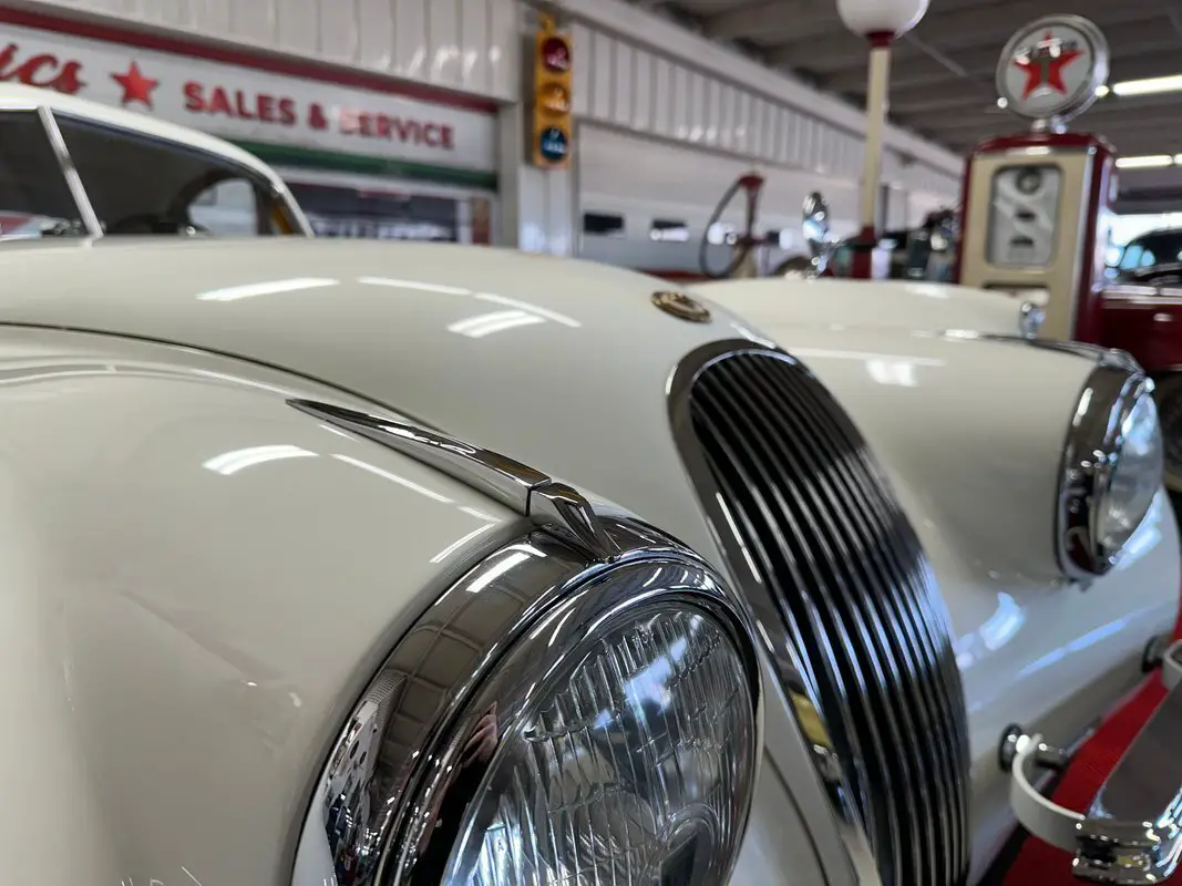 The car before us today was produced on April 4th, 1952, with red paint and biscuit interior was then sent to Los Angeles, California, per the Jaguar Heritage Trust Certificate. After examining the car, we have determined that this XK120 retains its original numbers-matching chassis, body, engine block, head, and 4-speed manual transmission! That's right - this is a true numbers-matching car! This Jaguar comes to us fresh from a complete nut-and-bolt restoration that touched literally every inch of the car. It is now dressed in a show-quality coat of fresh Ivory paint with a gorgeous red interior – an absolutely perfect color combination for this coupe! The white paint really brings out the swooping body lines of what is widely considered one of the most beautiful shapes ever to grace an automobile. The body itself is made of pressed steel with aluminum doors, bonnet, and boot lid. All the chrome and brightwork on the car is in exceptional condition with a brilliant shine and no pitting. Up front, you'll find a gleaming vertical-bar oval grille flanked by round Lucas headlamps set in bright bezels and mirror-finish chrome bumperettes down low. Above the grille is a like-new gold Jaguar head badge, and up on top of the fenders are dual chrome side mirrors and turn signal indicators. The curved bonnet leads your attention back to a chrome-framed split windshield complete with a set of bright wiper arms. The windshield and all of the other glass on the car are brand new and crystal clear. The main door windows as well as the front and rear pop-out vent windows are all framed in chrome trim, just like the windshield. The view from the side of this Jaguar is truly the most breathtaking vantage point, showing off the swooping fender lines and the curvaceous top. The wheel/tire combination brings the whole look together with Ivory-painted steel wheels, beauty rings, and correct Jaguar centercaps all wrapped in new Dunlop Road Speed RS5 tires (6-ply nylon tube-type). Removable rear fender spats enhance the streamlined look from the side. Sophisticated styling continues around back with a downward-sloping rear end that features round taillights in bright fixtures, dual vertical chrome bumperettes, a locking gas fill door, a bright license plate lamp fixture, and a single stainless steel tailpipe peeking out from underneath. Twist the bright handle and lift the boot lid to find an immaculate trunk with red vinyl lining, a full spare, a period air-pump, and all of the correct factory jacking equipment mounted to the sidewalls. The leather strap that would hold the factory tool roll is present, though the tool roll is not. The undercarriage of this XK120 is just as exceptional as the top side, and it's painted Ivory just like the body. It is obvious that literally every detail underneath was attended to with equal vigor during the restoration.