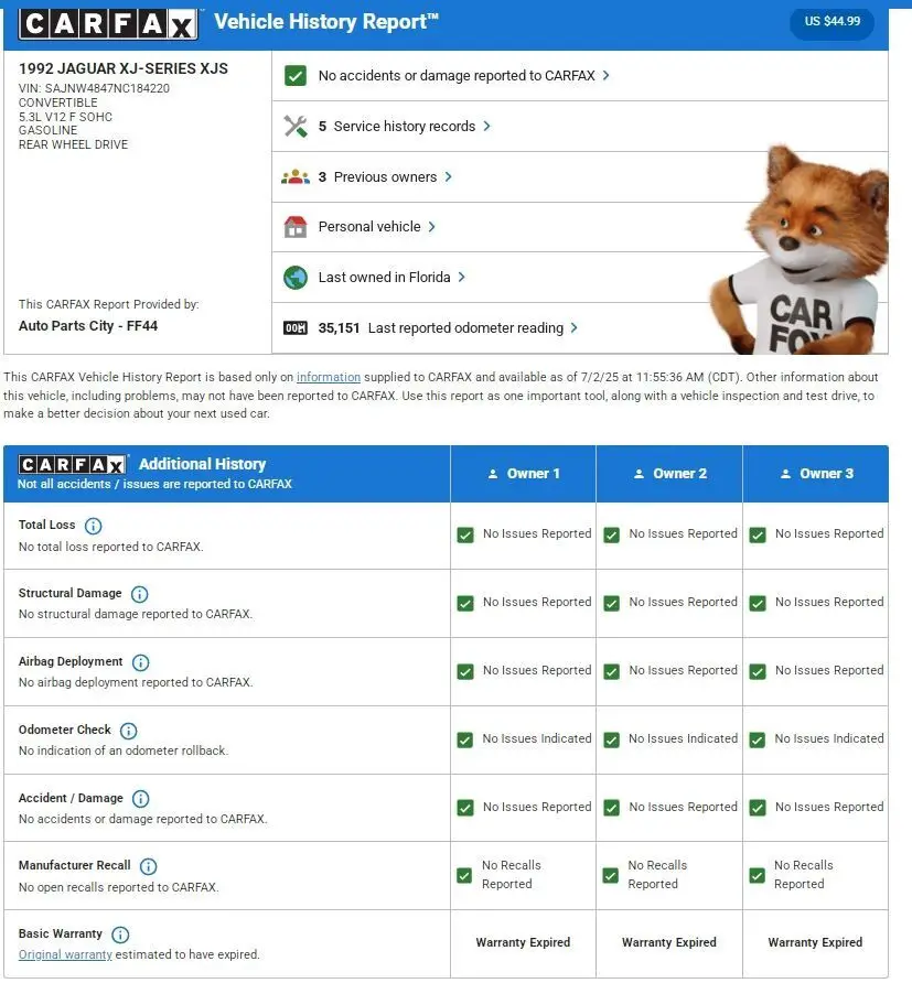 AUTO PARTS CITY / CLASSIC CAR CITY / CITY AUTO SALESGURNEE, ILLINOIS AND PARK CITY, ILLINOIS847-890-8100 - VEHICLE QUESTIONS / INFO1992 JAGUAR XJS V12 PROJECT OR PARTS CARCLEAN TITLEWE SHIP NATIONWIDE !