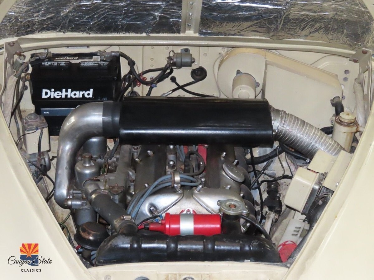 -3.4L 6 Cyl Twin Carb Engine-3 Speed Borg Warner Automatic Transmission-Restored Wood-Cork Tan Interior-Factory Radio DeleteThe body on the car is in very good condition and was extremely well maintained. There is no obvious evidense of any body work or metal repair, this appears to be a rust free original very straight body. The paint on the car is finished in a tan single stage paint which is a good base to pick a color of your choice. The car has been completely inspected underneath from front to back and is solid as a rock and well cared for garaged car should be. All chrome trim, glass, and rubber seals are in place and look fair. The car is riding on the original steel wheels with dog dish hubcaps wheels which look great and wrapped in brand new radials.
