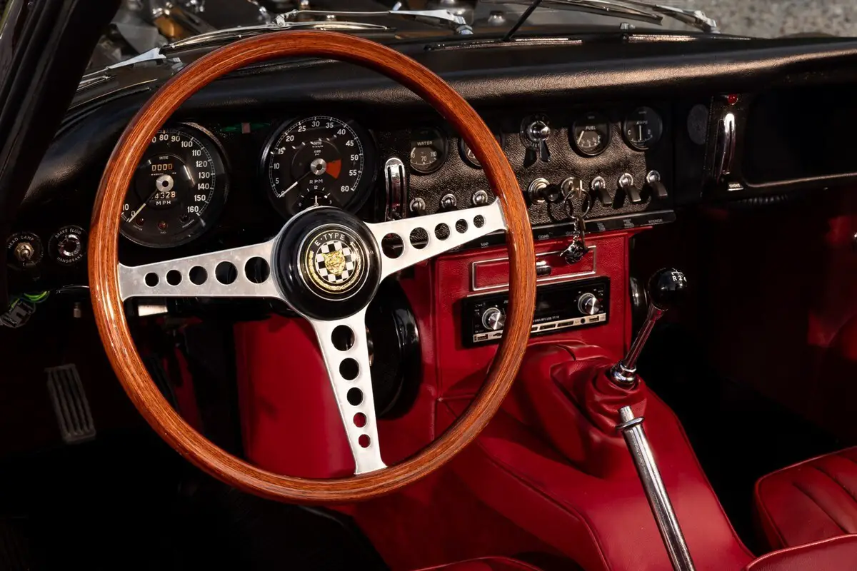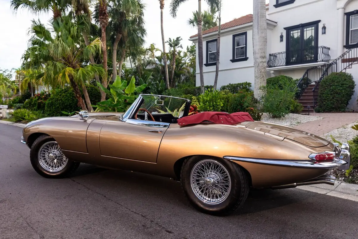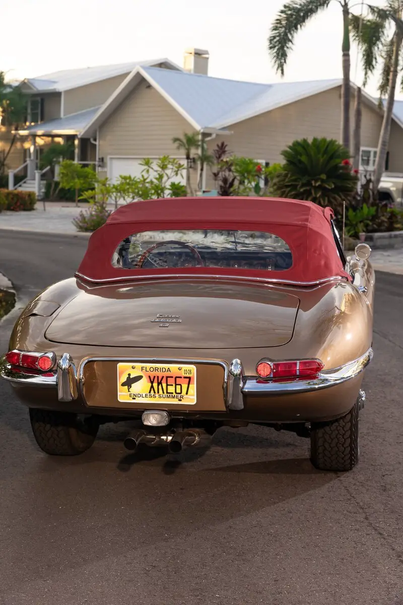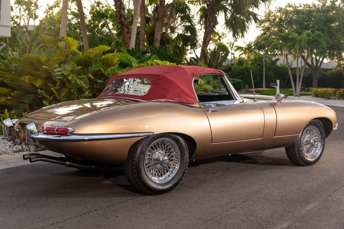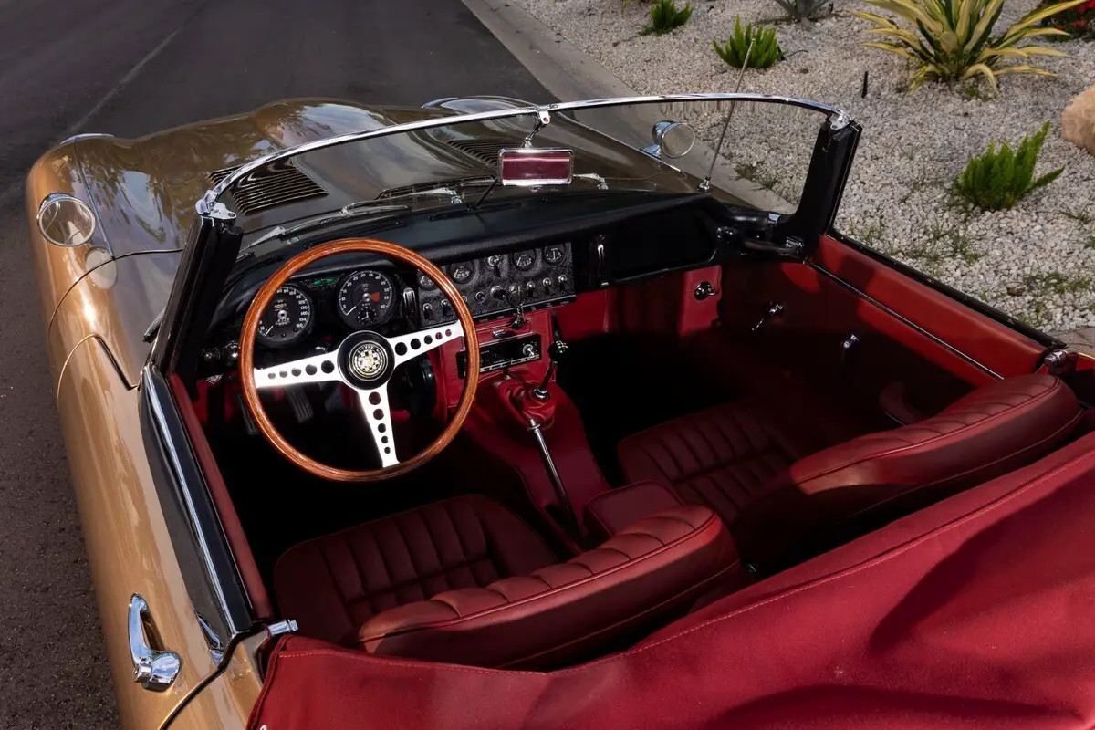 This 1967 Jaguar E-Type Series 1 4.2-Litre Roadster was built on 14 October 1966. A left-hand-drive example destined for North America, this open two-seat roadster left the factory finished in Opalescent Golden Sand over a Red interior with a Sand convertible top. It was dispatched on 16 November 1966 and distributed through Jaguar Cars, New York, USA.Just a two-owner example from new, it was purchased by the consignor in 1973. A comprehensive multi-year rotisserie restoration was completed in 2021. The car was refinished in its original shade of Opalescent Golden Sand, now complimented by a red convertible soft top. Exterior features include dual Talbot-style sideview mirrors and chrome knock-off wire wheels. The interior was retrimmed back to its original red leather, and it is equipped with a modern JSD-20158 radio unit and also includes a period 70s stereo/8-track unit. Two shift knobs are included with the car: One traditional black with white lettering, and one custom wooden knob with a 1967 gold Kennedy half dollar. According to its accompanying JDHT certificate, this Jaguar is an allnumbers-matching chassis, engine, cylinder head, and gearbox example. The drivetrain has been completely rebuilt and the previous American gear ratio (3.54) has been changed back to the British gear ratio (3.07), so the top speed has been upgraded from 135 to 155. Included with the car is a detachable hardtop, tools, jack, and literature.The Jaguar E-Type remains one of the most celebrated British sports cars of all time. This example, finished in a seldom-seen factory color combination, and having benefitted from a multi-year restoration, would make a fine addition to any collection.