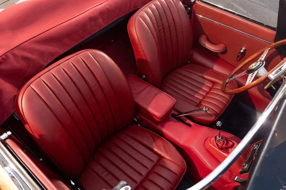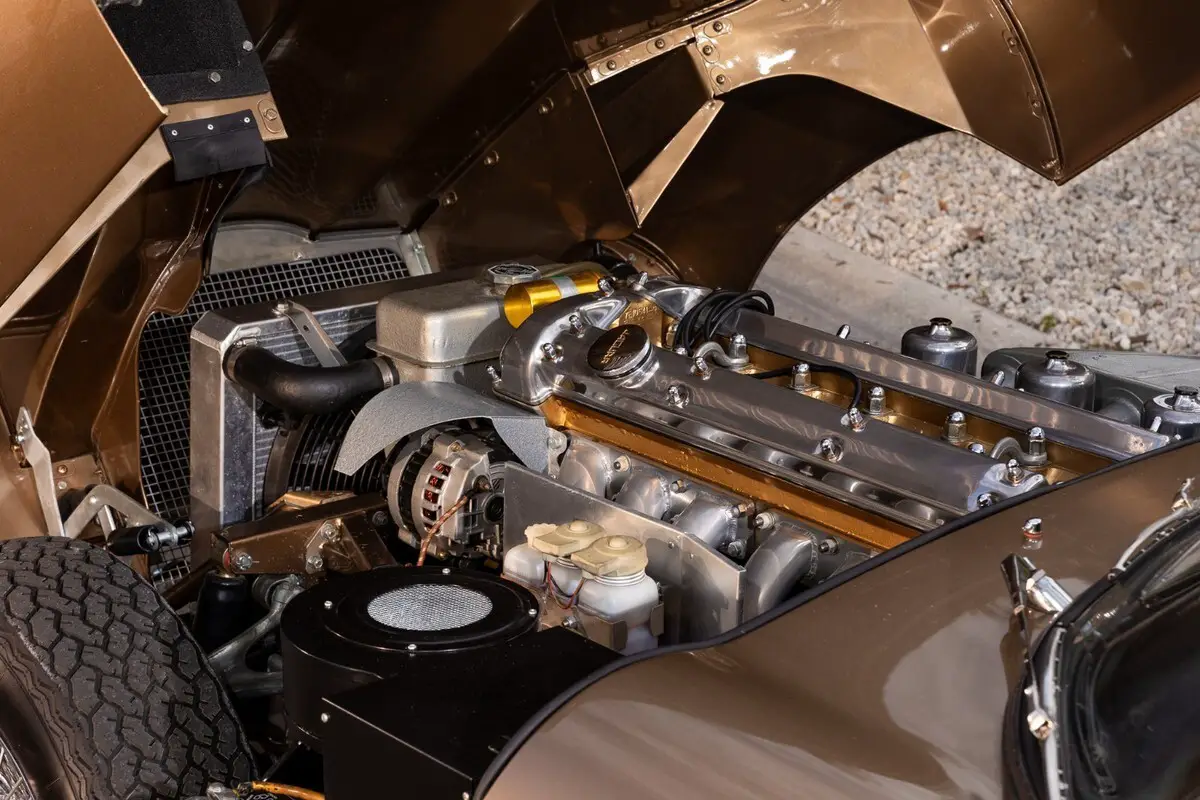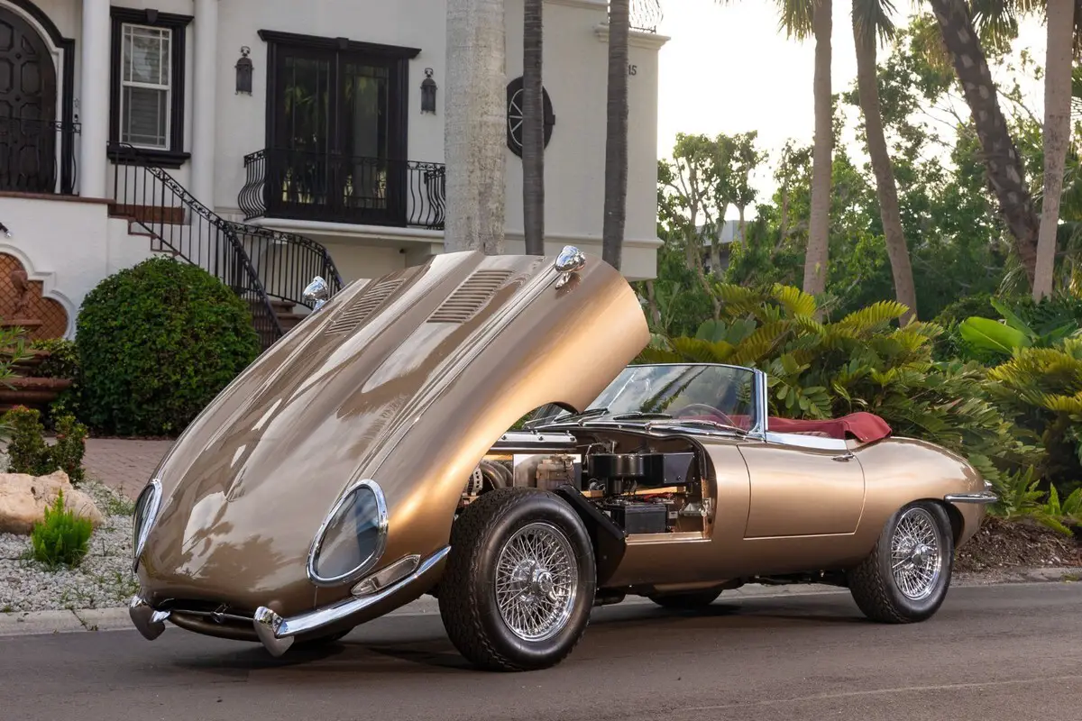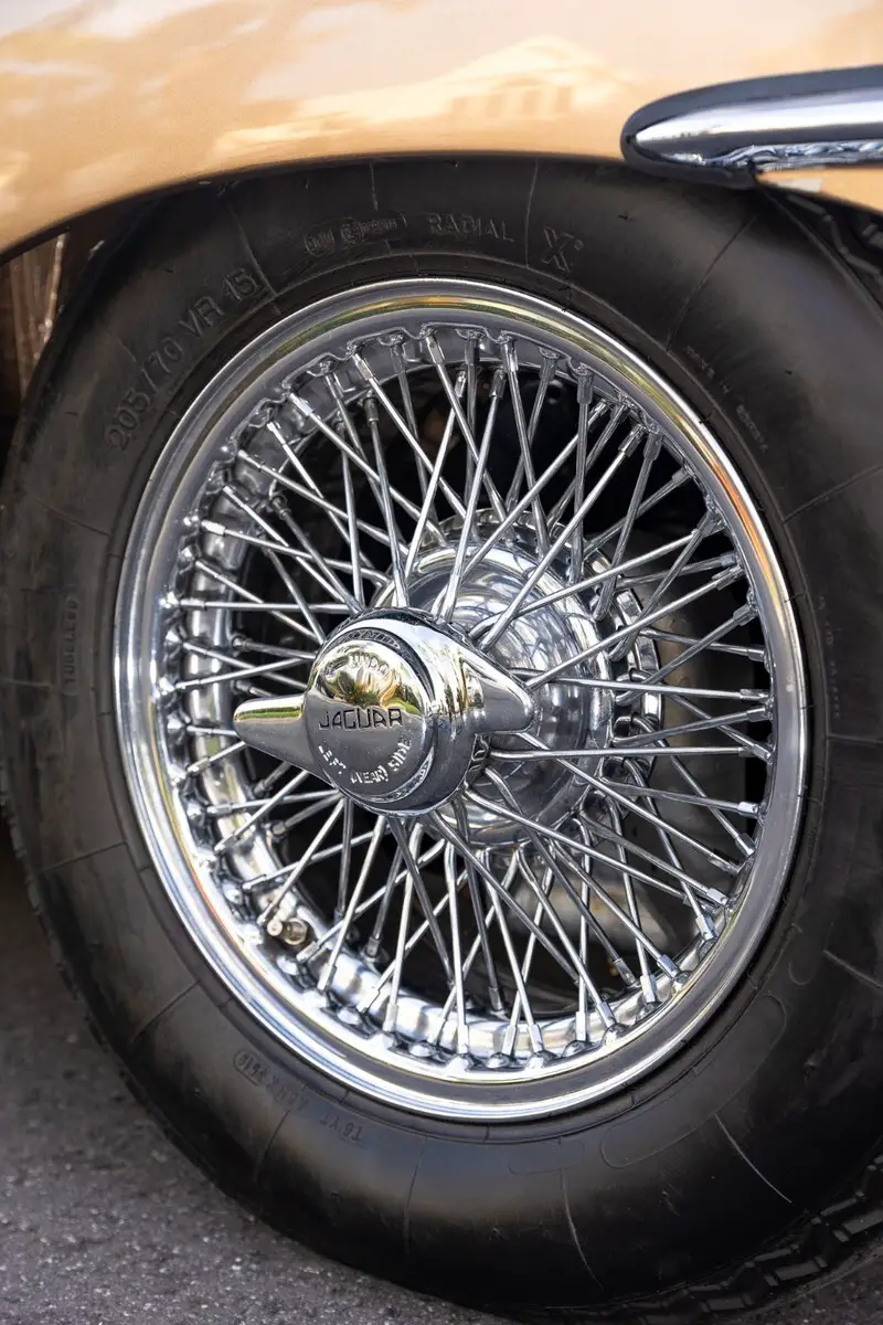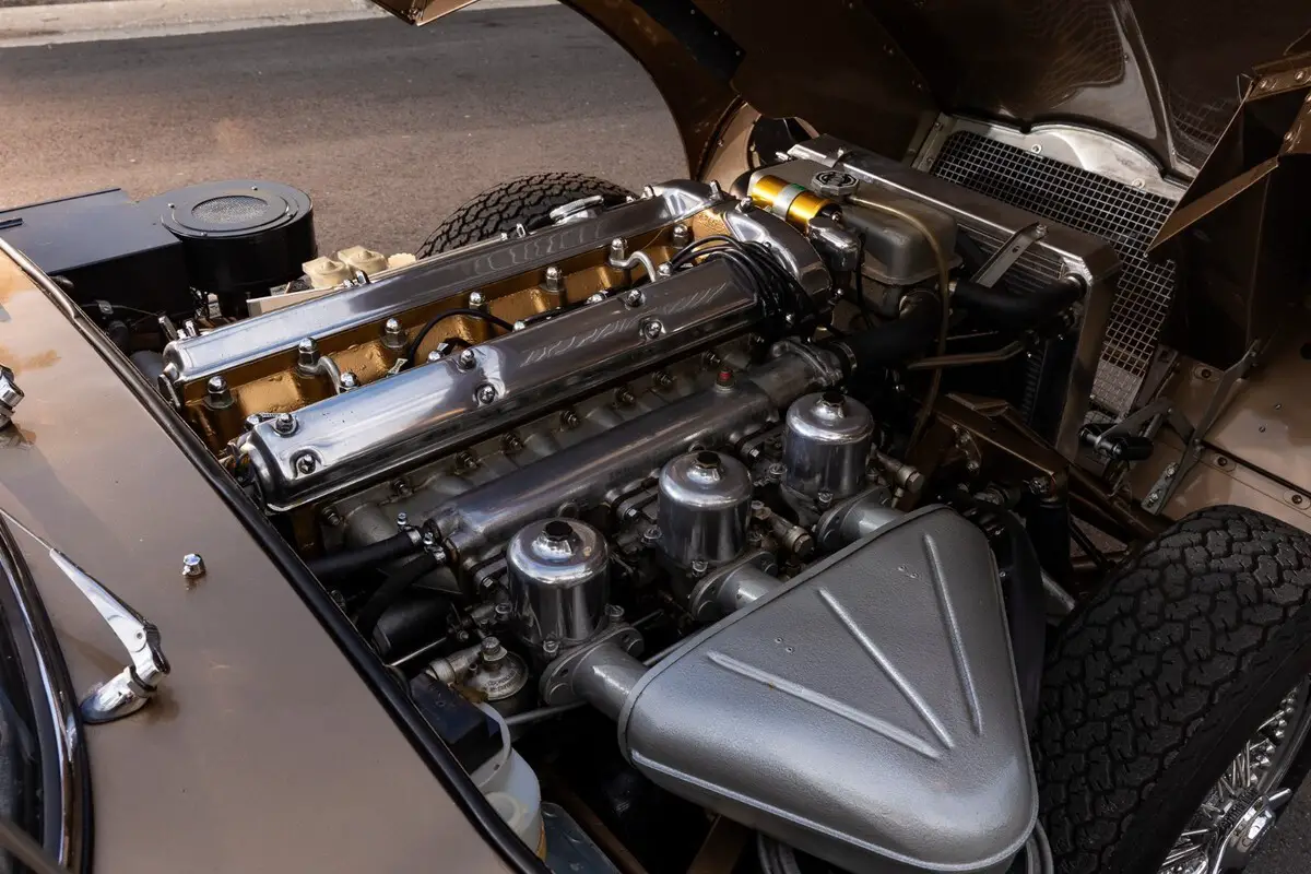 This 1967 Jaguar E-Type Series 1 4.2-Litre Roadster was built on 14 October 1966. A left-hand-drive example destined for North America, this open two-seat roadster left the factory finished in Opalescent Golden Sand over a Red interior with a Sand convertible top. It was dispatched on 16 November 1966 and distributed through Jaguar Cars, New York, USA.Just a two-owner example from new, it was purchased by the consignor in 1973. A comprehensive multi-year rotisserie restoration was completed in 2021. The car was refinished in its original shade of Opalescent Golden Sand, now complimented by a red convertible soft top. Exterior features include dual Talbot-style sideview mirrors and chrome knock-off wire wheels. The interior was retrimmed back to its original red leather, and it is equipped with a modern JSD-20158 radio unit and also includes a period 70s stereo/8-track unit. Two shift knobs are included with the car: One traditional black with white lettering, and one custom wooden knob with a 1967 gold Kennedy half dollar. According to its accompanying JDHT certificate, this Jaguar is an allnumbers-matching chassis, engine, cylinder head, and gearbox example. The drivetrain has been completely rebuilt and the previous American gear ratio (3.54) has been changed back to the British gear ratio (3.07), so the top speed has been upgraded from 135 to 155. Included with the car is a detachable hardtop, tools, jack, and literature.The Jaguar E-Type remains one of the most celebrated British sports cars of all time. This example, finished in a seldom-seen factory color combination, and having benefitted from a multi-year restoration, would make a fine addition to any collection.