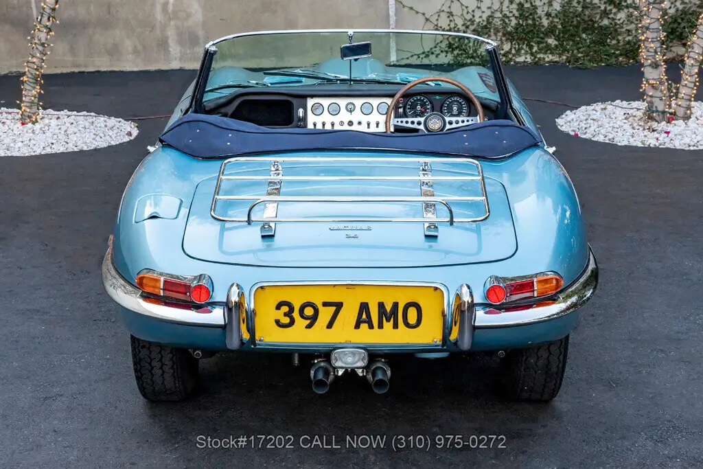 Equipped with a 4-speed manual transmission, 3.8-liter engine fed by triple SU carburetors, dual exhaust finishers, aluminum center console & dashboard, front-wheel disc brakes, toggle switches, Smiths instruments, Lucas-branded ammeter gauge, covered headlights, triple windshield wipers, blue convertible soft top, chrome bumpers with overriders, wire wheels with Jaguar branded two-eared knock-off wheel spinners, Vredestein tires, and a full-size spare tire fitted in the trunk. This particular British classic also boasts the unique feature of bonnet louvers. These louvers not only enhance the car's aesthetics but also serve a functional purpose by improving engine cooling. This attention to detail is a testament to Jaguar's commitment to both form and function. Convenience features manual-crank windows, Lucas-branded headlights, cigar lighter with an ashtray, passenger dash grab handle, three-spoke wood-rimmed steering wheel, and a rear luggage rack.