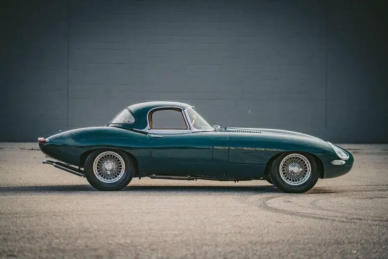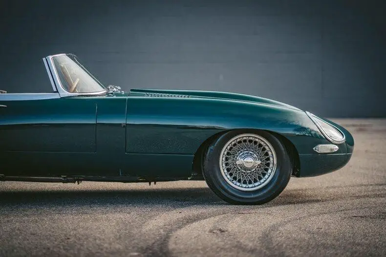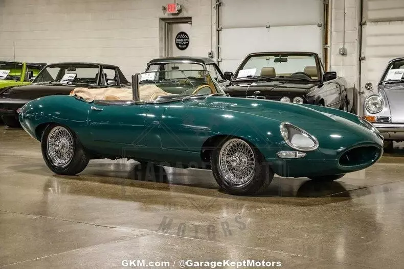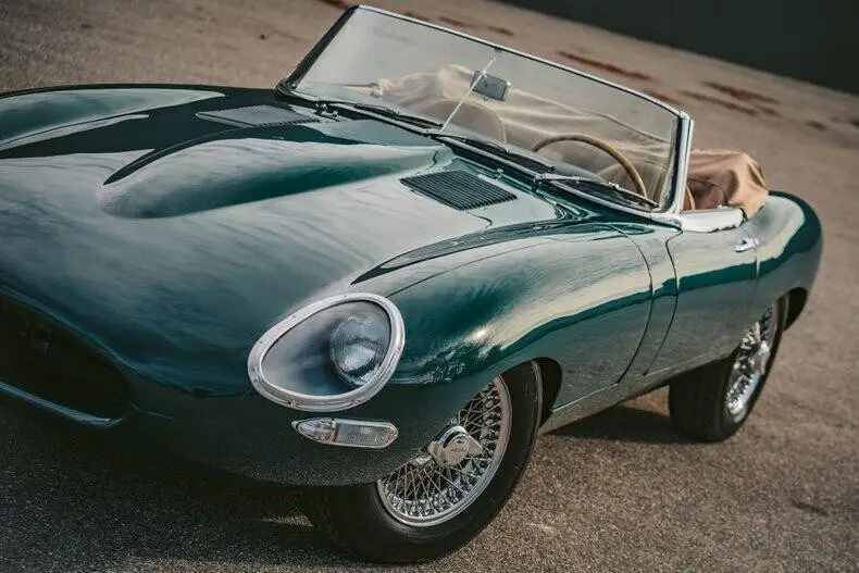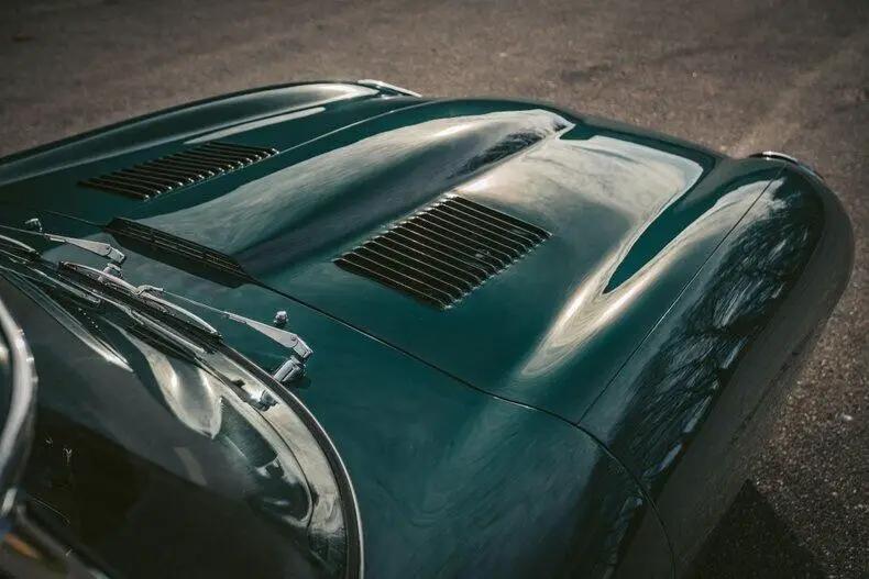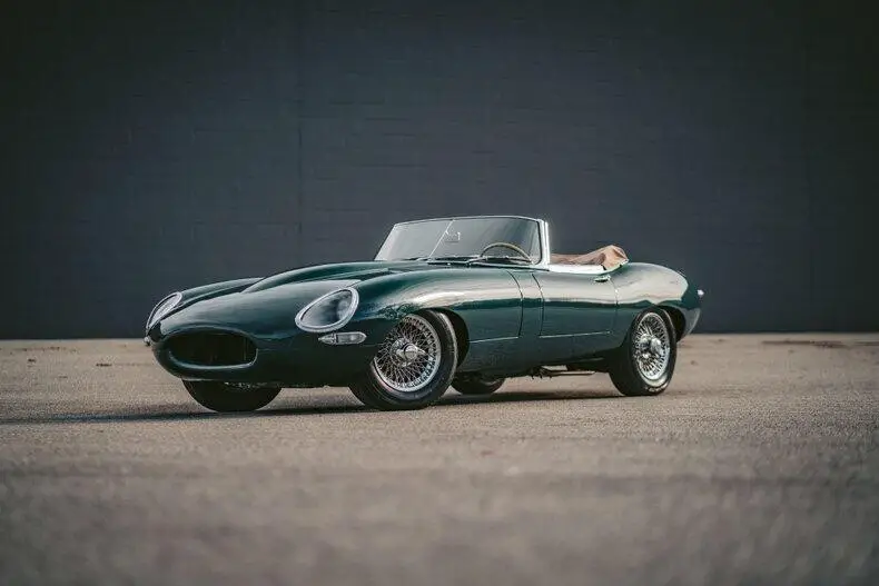 The 1964 Jaguar E-Type Series 1 3.8 Roadster stands as one of the most iconic British sports cars ever made, and this particular example is a stunning testament to the timeless design and performance that made the E-Type legendary. With its sleek and elegant lines, long hood, and covered headlights, this roadster captures the essence of 1960s automotive style. The car has undergone a recent, high-quality restoration, finished in an elegant dark green that pairs beautifully with its tan soft top and matching tan interior, giving it a classic and distinguished presence.