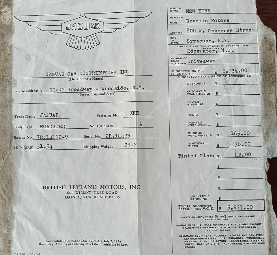 I am pleased to offer this gorgeous 1971 Jaguar XKE (E-Type) roadster. This car is presented today by the second owner who has owned the car since 1980 (talk about long term ownership). He is only the second owner since new. Documentation includes the original sales invoice showing a whopping MSRP of $5,977 paid in 1971. The car has been driven 56,000 original miles. VIN # is 2R14439.