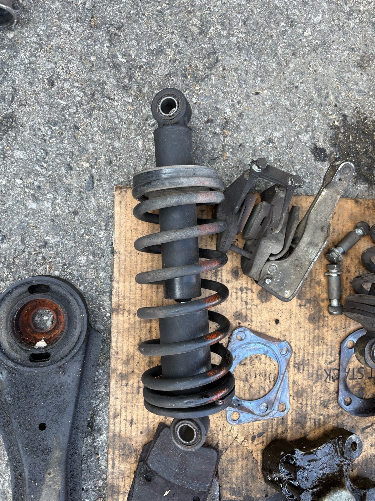 Drop rear axle and replace brake calipers, pads, hoses, rotors, shocks, control arms and etc.