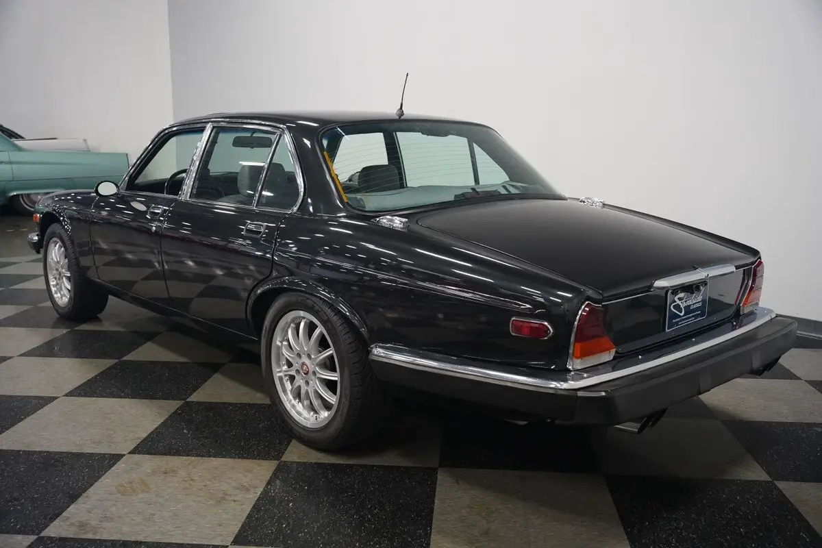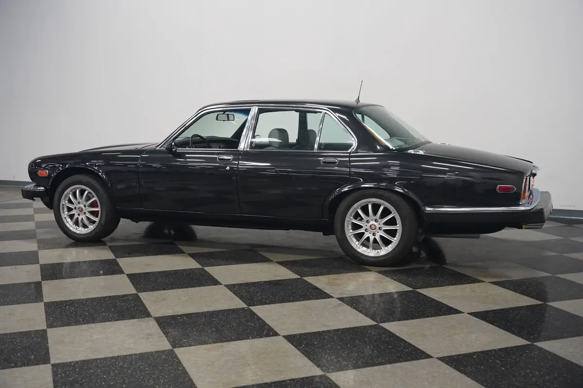 British luxury fused with American muscle - that's what makes this 1983 Jaguar XJ6 Restomod special. Finished in sleek Maraschino Black, this sedan sports a classic silhouette with updated details. The slender proportions gain athletic presence from 17" wheels originally designed for a newer Jaguar XK8. Aerodynamic, color-matched side mirrors enhance the profile while maintaining elegant symmetry. With 235/50R17 tires (dated 2006) and dual exhaust outlets, this big cat signals its performance potential without saying a word.