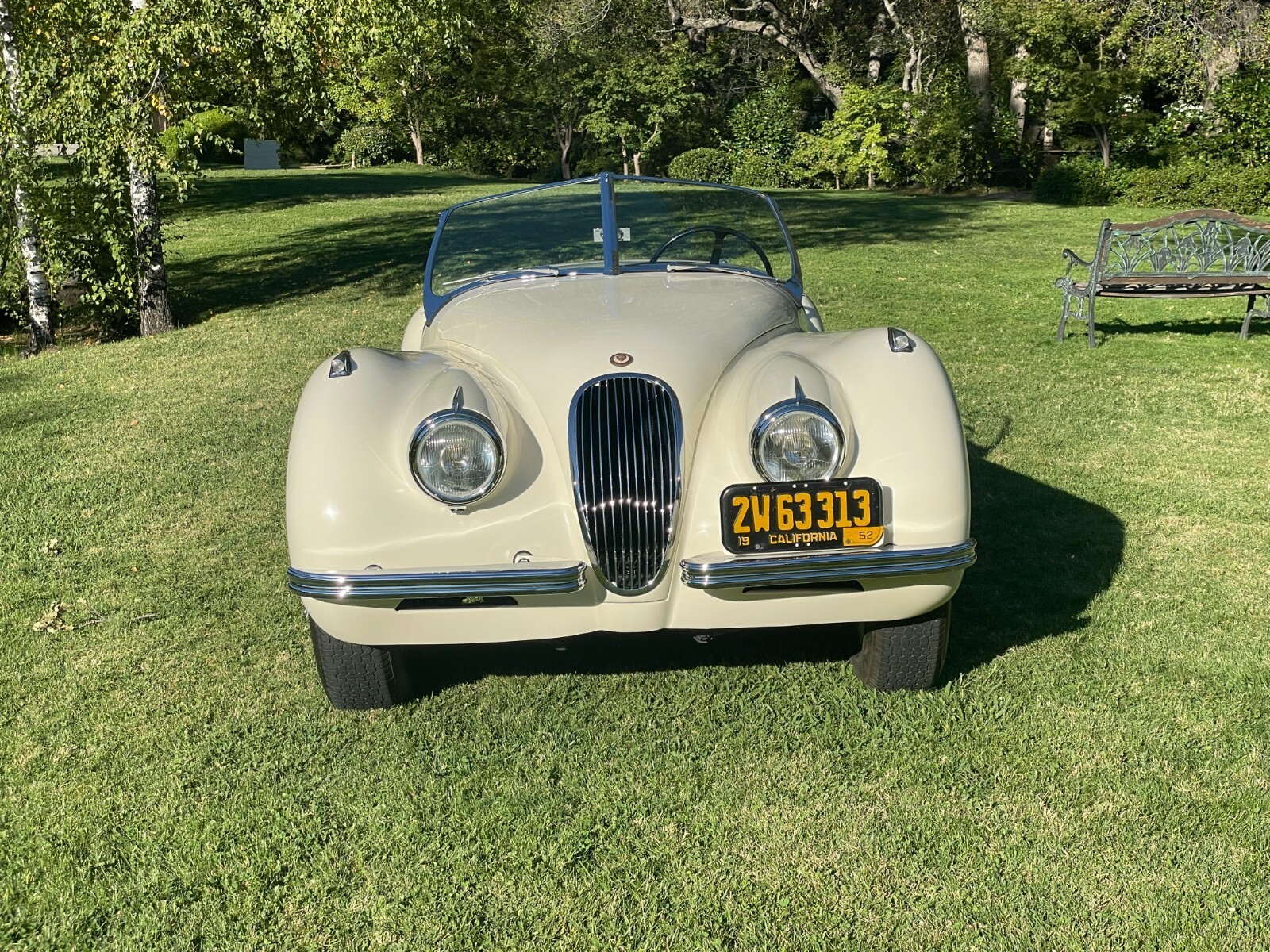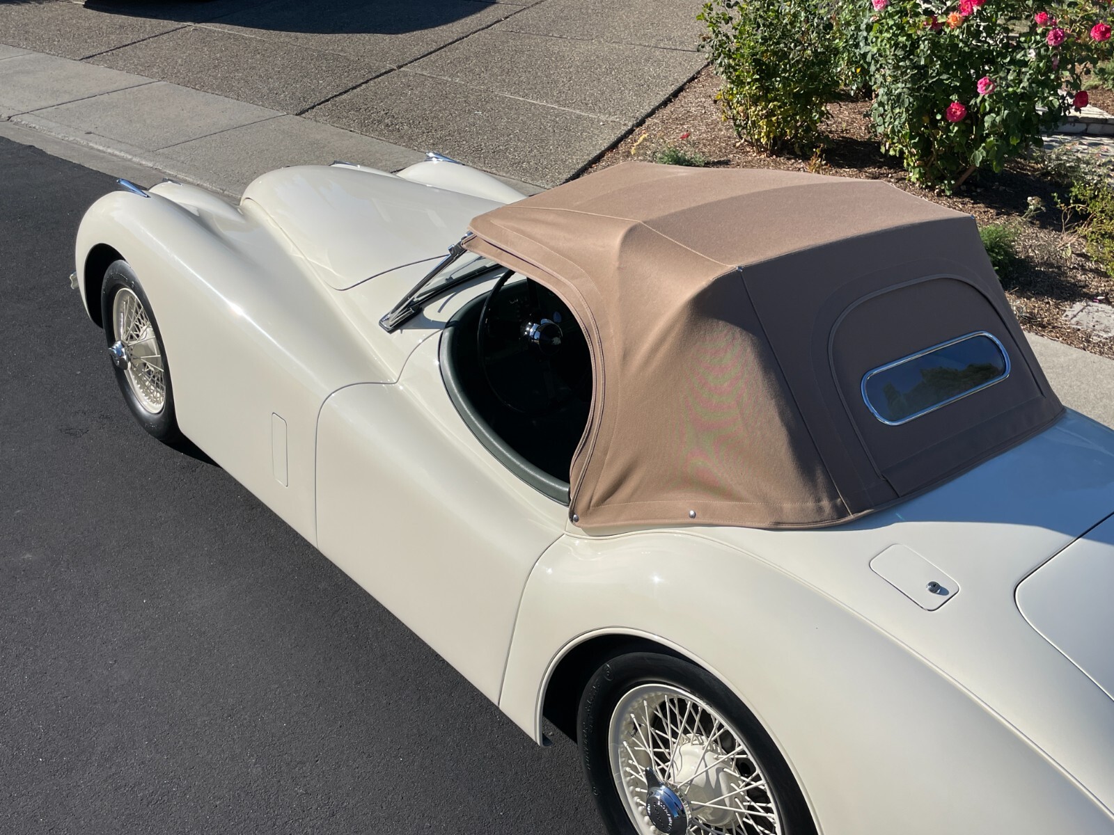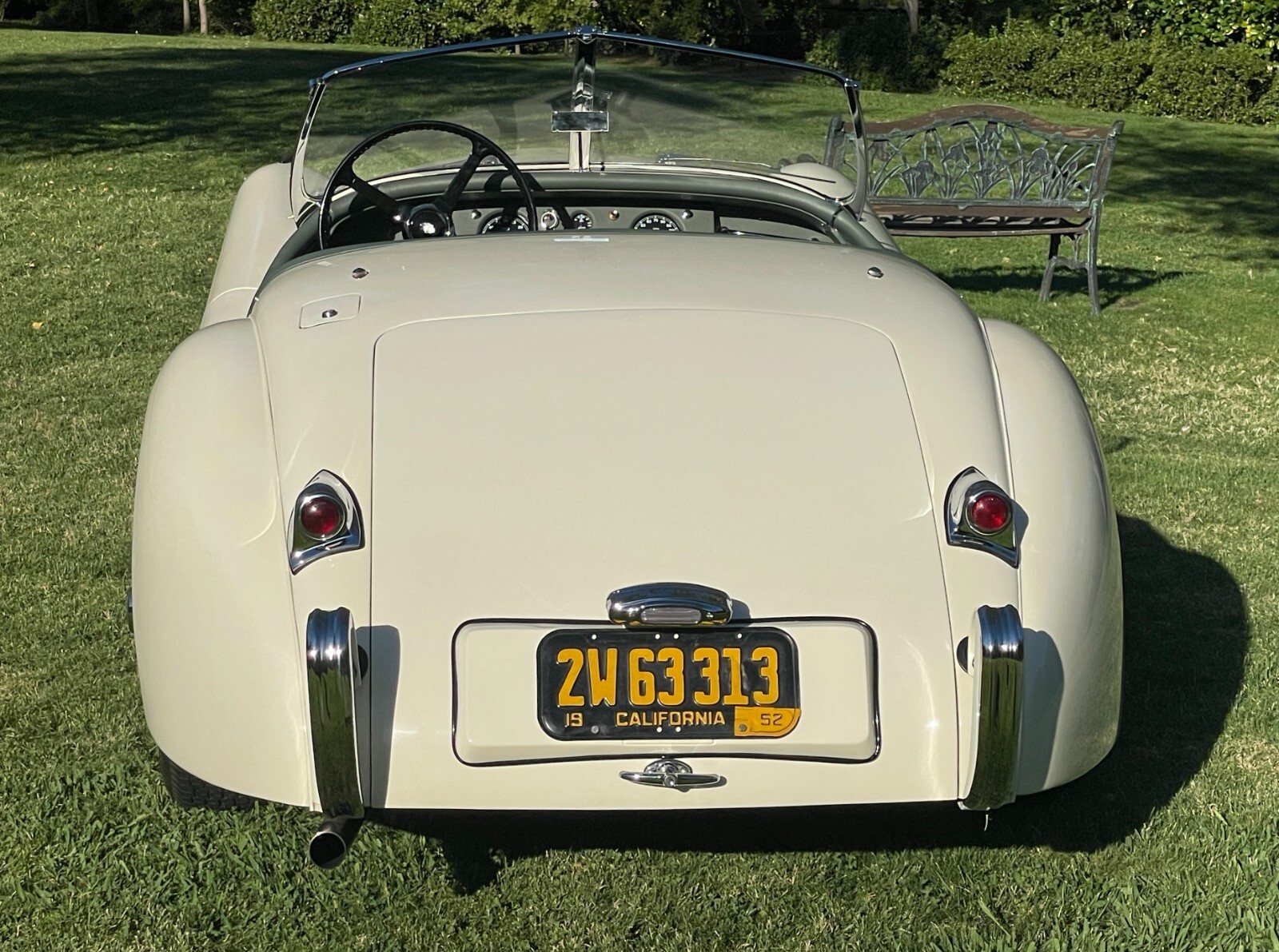 As recorded on its Jaguar Heritage Trust Certificate (included in sale), this XK 120 was completed on 25 June 1952, finished with a factory special order color combination of Cream over Suede Green interior with a Fawn soft-top, side curtains and tonneau cover. Most importantly, the Certificate confirms this car retains its numbers-matching chassis, head, block, transmission and body.