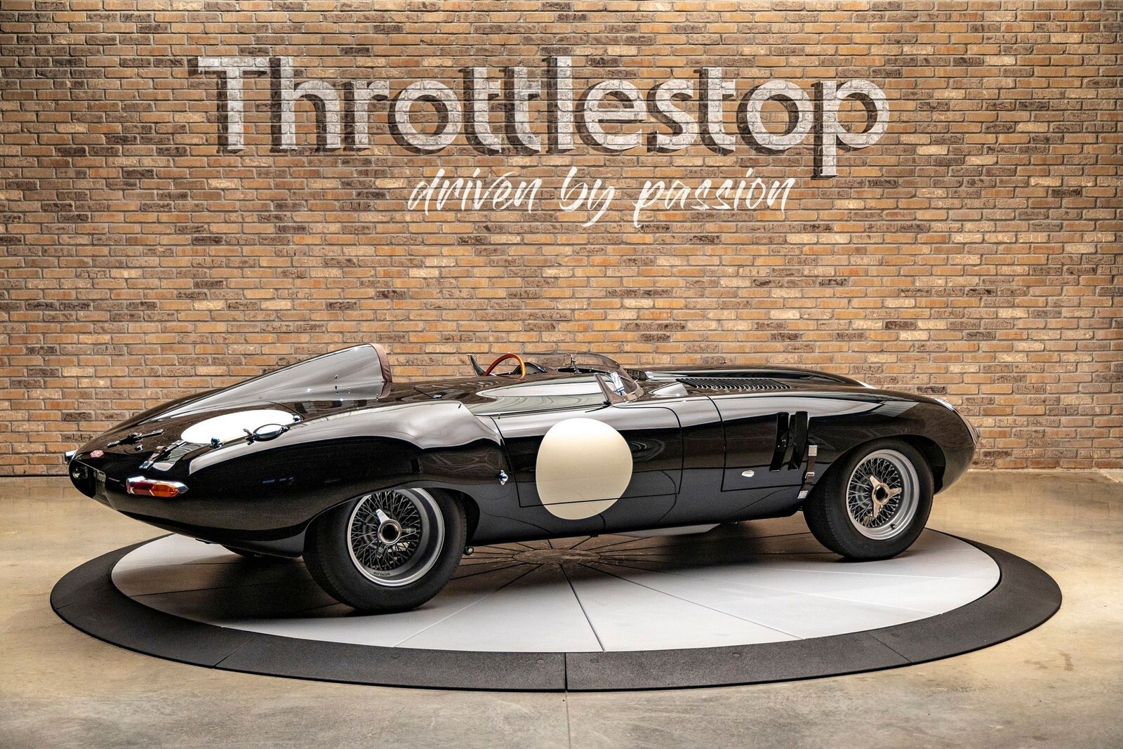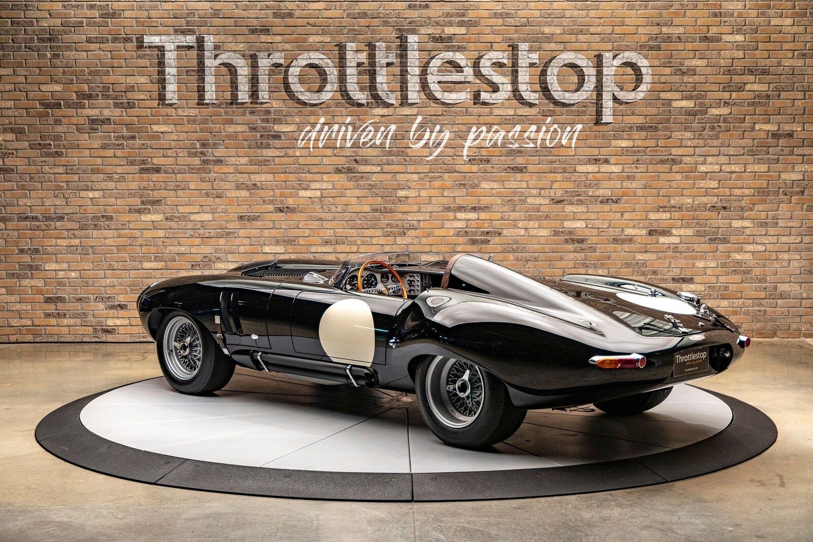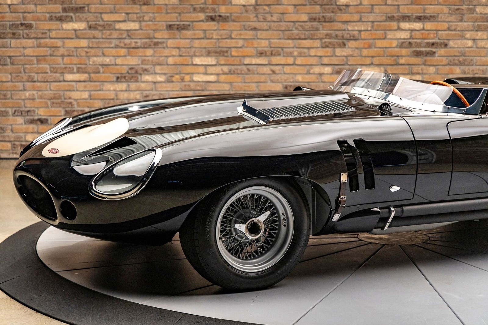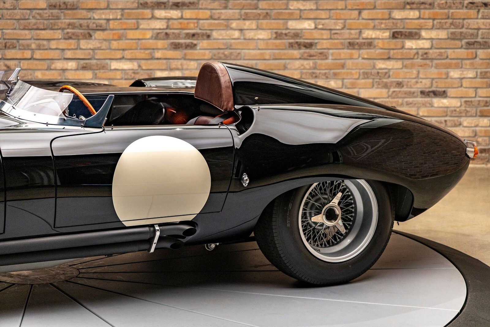 The bodywork features a custom aluminum "cockpit delete" panel, turning the car into a single-seater focused machine, though the panel is removable for a passenger. The exterior includes custom touches like a "hump" behind the driver, additional bonnet louvers, and a hand-formed bug deflector. The interior is pure vintage motorsport: chronometric-style gauges angled toward the driver (D-Type style), a rigid-mounted steering column for maximum road feel, and a stripped-back aesthetic that still offers refined leather touches on the sills and tunnel.
