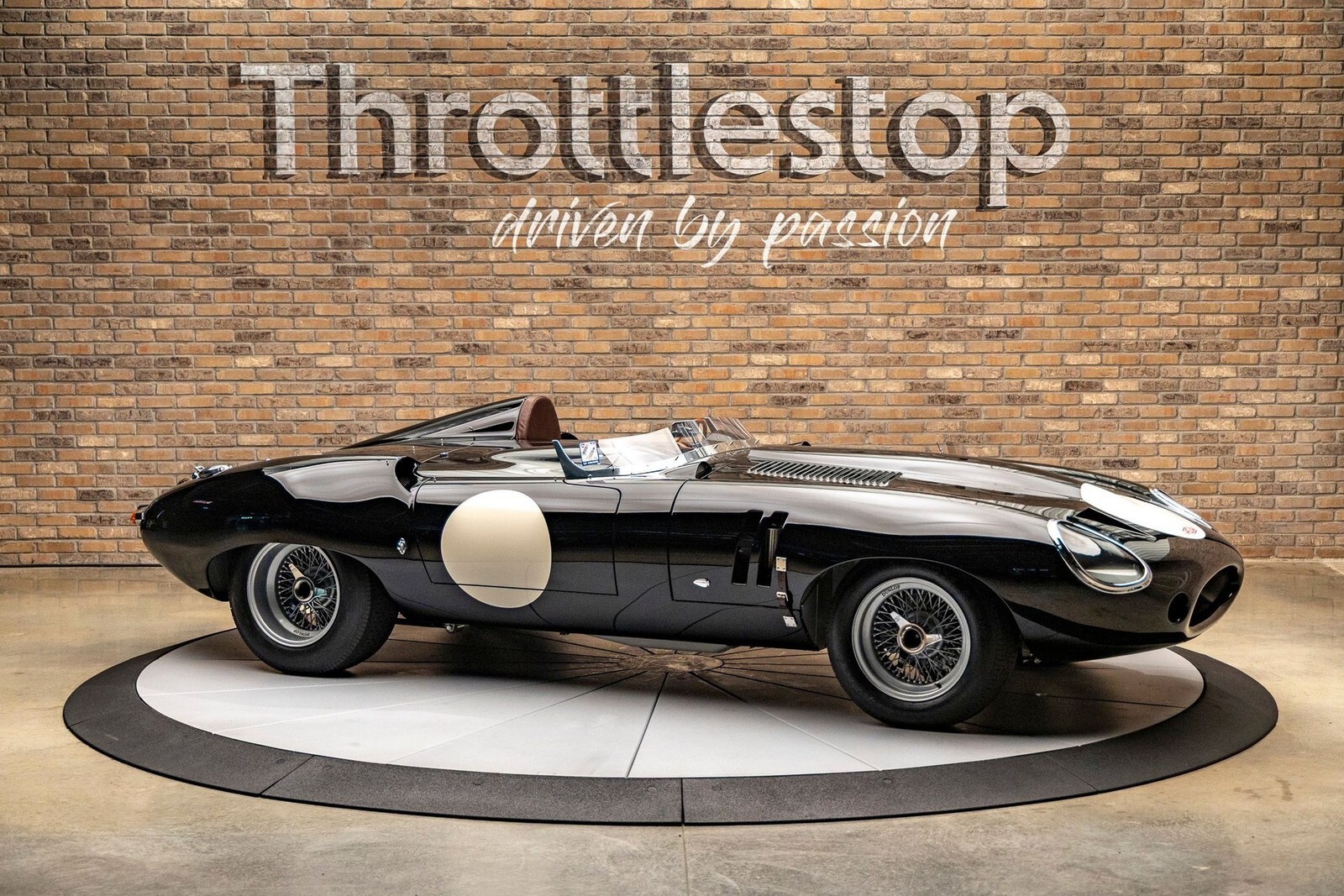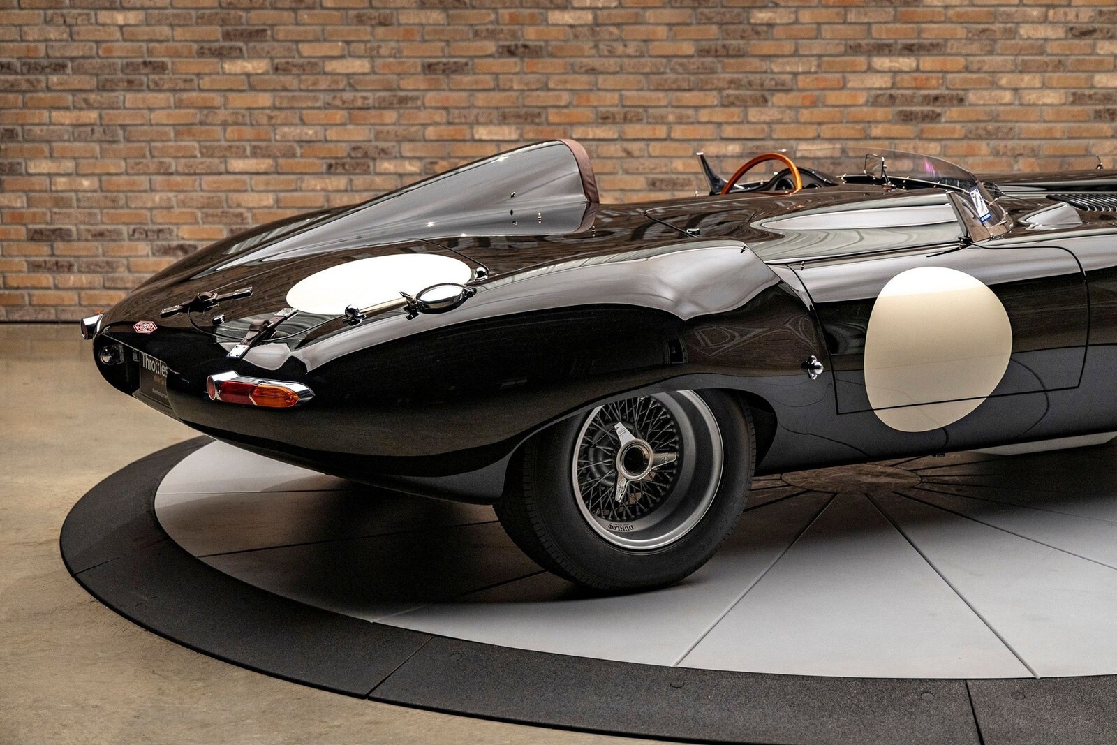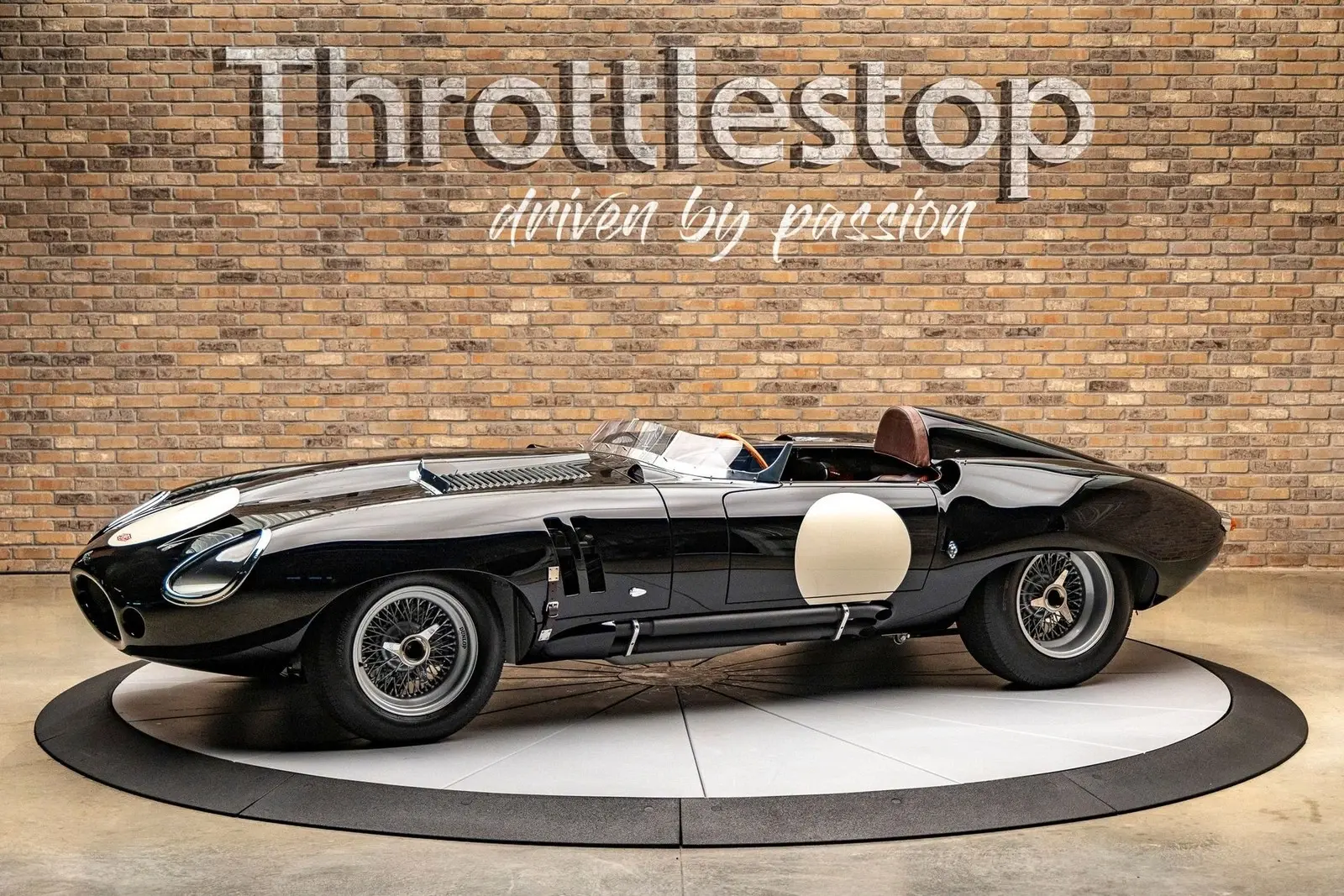 The bodywork features a custom aluminum "cockpit delete" panel, turning the car into a single-seater focused machine, though the panel is removable for a passenger. The exterior includes custom touches like a "hump" behind the driver, additional bonnet louvers, and a hand-formed bug deflector. The interior is pure vintage motorsport: chronometric-style gauges angled toward the driver (D-Type style), a rigid-mounted steering column for maximum road feel, and a stripped-back aesthetic that still offers refined leather touches on the sills and tunnel.