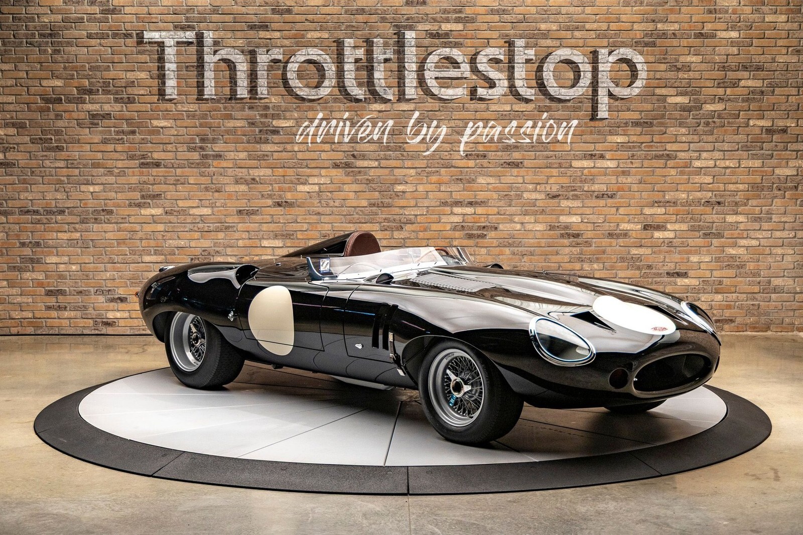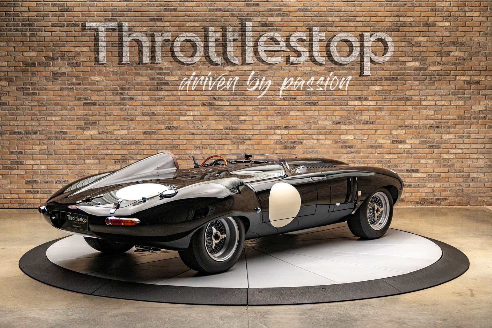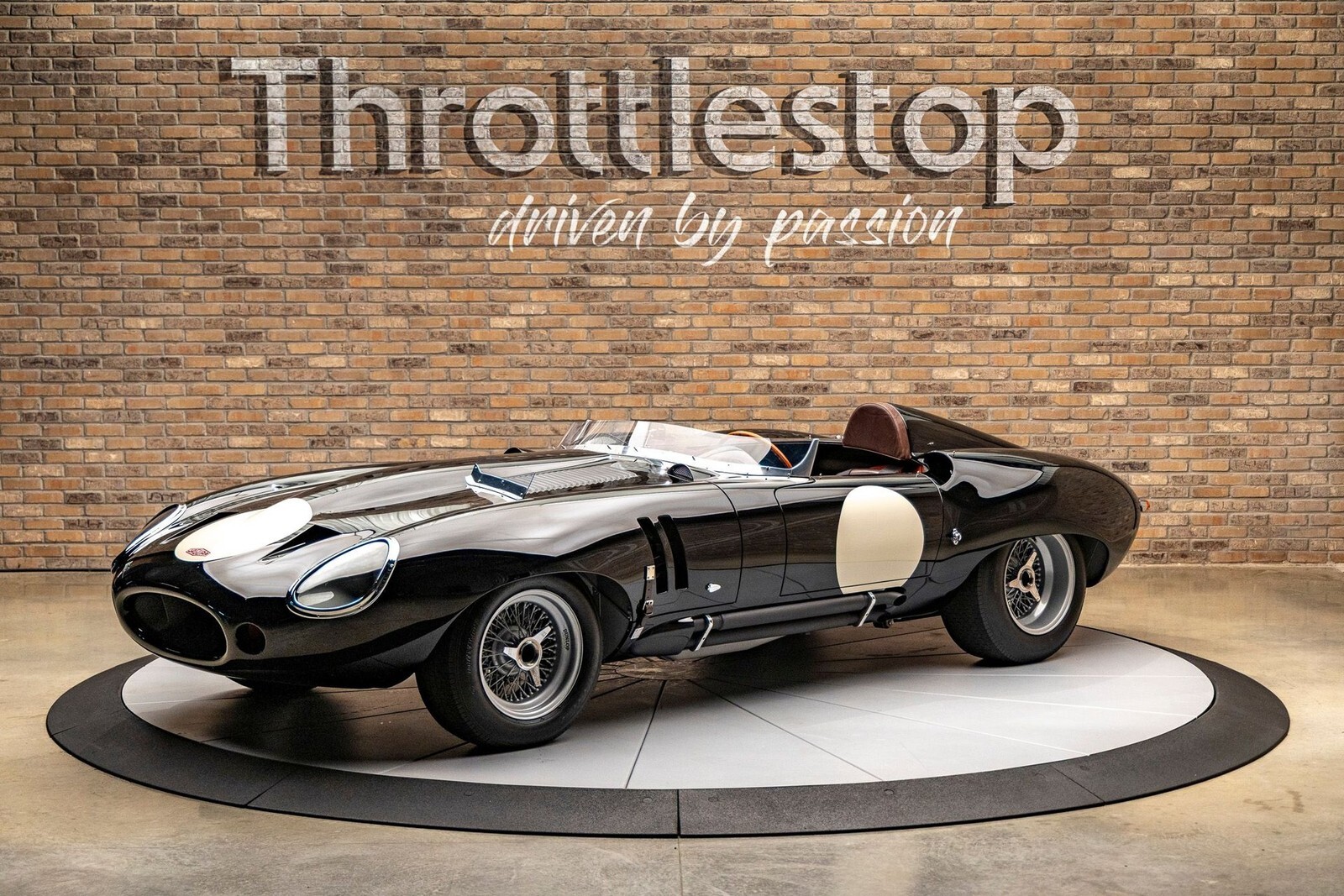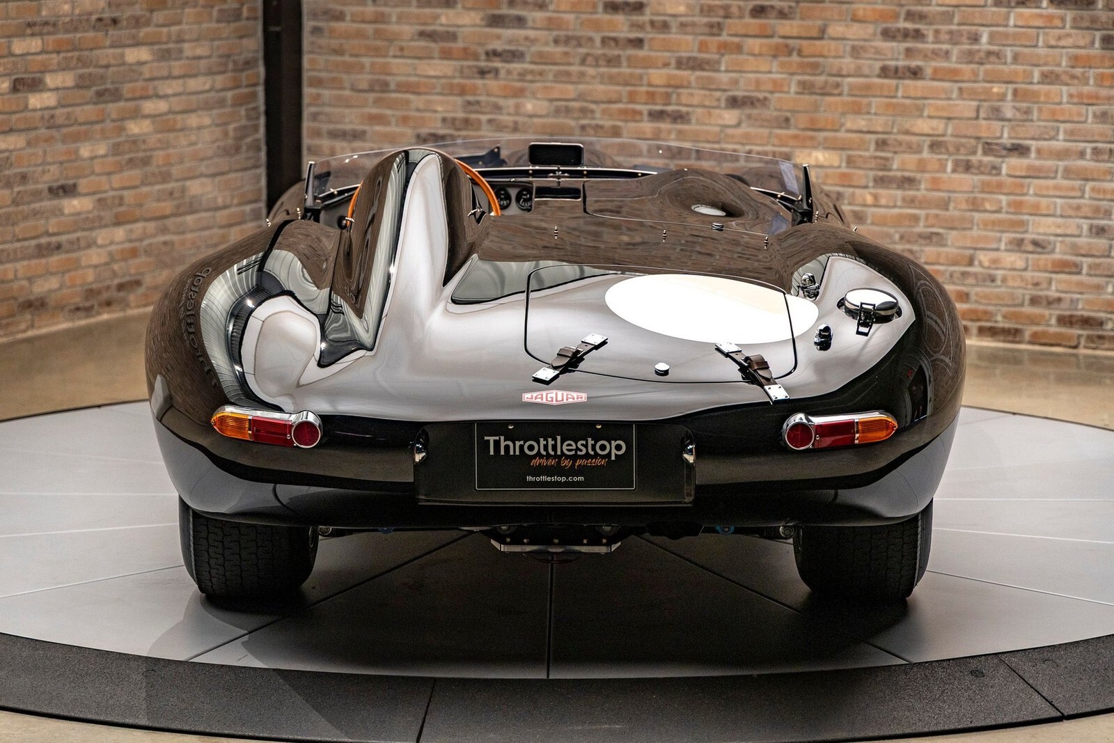 The bodywork features a custom aluminum "cockpit delete" panel, turning the car into a single-seater focused machine, though the panel is removable for a passenger. The exterior includes custom touches like a "hump" behind the driver, additional bonnet louvers, and a hand-formed bug deflector. The interior is pure vintage motorsport: chronometric-style gauges angled toward the driver (D-Type style), a rigid-mounted steering column for maximum road feel, and a stripped-back aesthetic that still offers refined leather touches on the sills and tunnel.