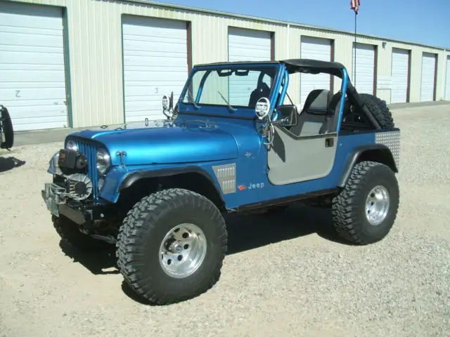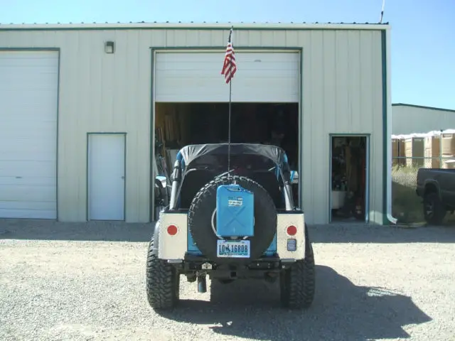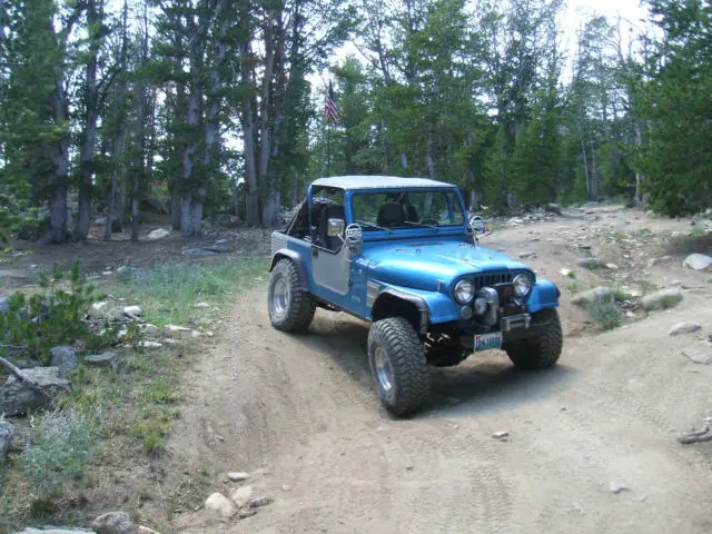 1986 Jeep CJ-7, AMC 304 V-8, Summit Racing EFI distributor, E-3 plugs and Bosh spark plug wires.Dana 44 30 spline axles with Detroit Locker in rear and ARB air locker in front w/ 3.73 gears,disc brakes all around, Currie Enterprisesaxles and disk brake kit on rear. Borg- Warner T-18 transmission rebuilt 3,000 miles ago by Baker's Transmission in Grand Junction, CO, a new LUK clutch was installed at the same mileage. It has a Dana 300 transfer case with twin stick shifters. Driveshafts' are from Drivetrain Industries in Grand Junction, CO. It has sway bar disconnects and air shocks also.Aluminum rims with 35x12.50 - 15 Goodyear MT tires, spare is the same size and I have an extra tire also. The Jeep also has a front roll cage along with the factory roll cage. It has an older Warn 10,000 # winch, a Tuffy lock box console with a Pioneer stereo. I have a bikini top on it and an older soft top for it also.