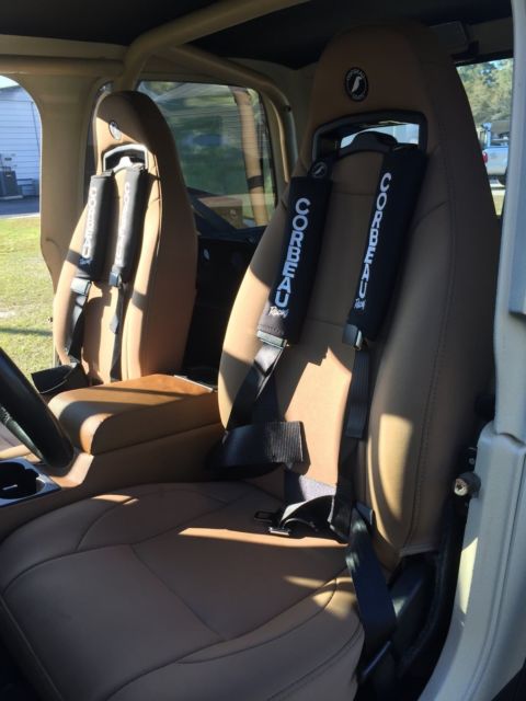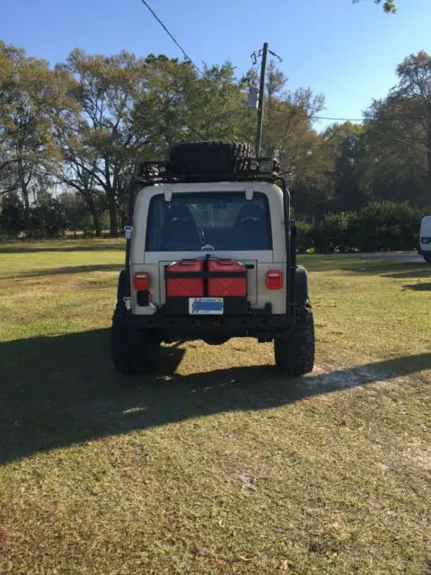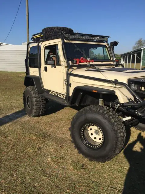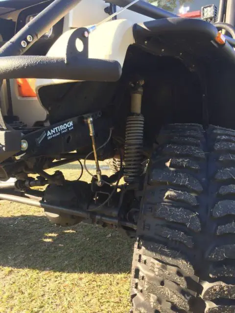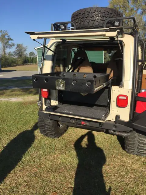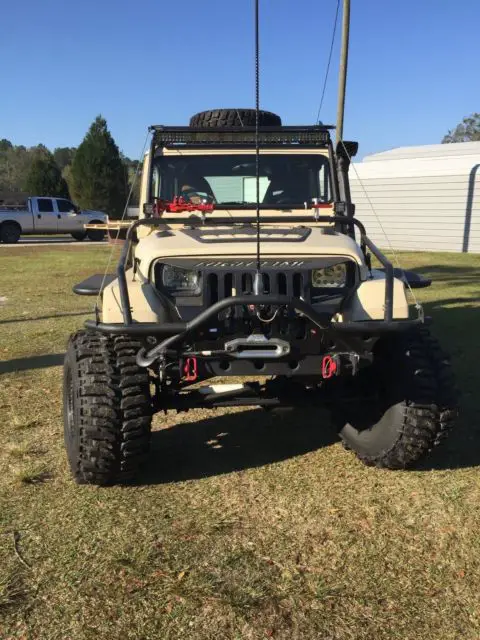 Brand new 35 x 14.5 x 15 Boggers on Brand new True Bead locker Rims /$6000 6 inch rock krawler lift / 4.88 gears in front axle with chrome moly axles/ 4.88 gears in rear axles with chrome moly axles. SYE with cv drive shaft.BrandNewAX 15 transmission/ All new interior with new door seals / Door Handlers /Door panels / New Carpert / New suspensionseatsWith 4 point harness/ 5 pod with air gauge/Hard top/ cb radio/ Hi lift jack/ 35 inch spare tire /warn winch with synthetic rope and wireless remote/ custom bumpers and fender flares with rock sliders/hood louvers/ /Coil over shock suspension/ ox locker with electric select/ arb air locker with compressor/ HD tie rod and drag link/ 4 to 1 Transfer case/ custom rear storage/ Battery cut off switch / All lights are led head lights as well / A/C / Air intake and exhaust have snorkels / Roof rack and custom grille / JEEP is completely sprayed with bed liner / transmission transfer case and both axles are vented to under hood. King Shocks in Rear $2000. Jeep has only been driven once since restored. JEEP is garage kept . Roof rack/ Front Grille / Fender Flares / Rock Sliders / Bumpers / Bush Guard /Spare fuel can holder / Rear Storage slide outs Everything is custom built not store bought. This jeep is one of a Kind. Over &38000.00 invested