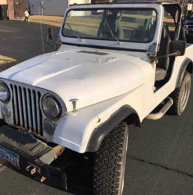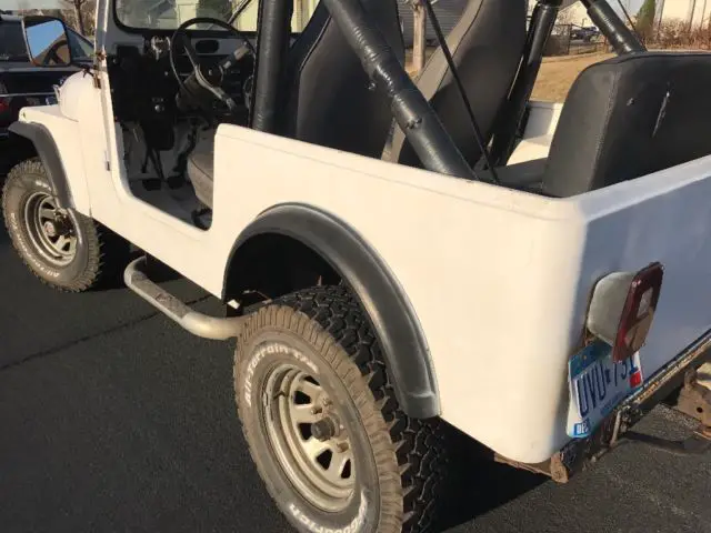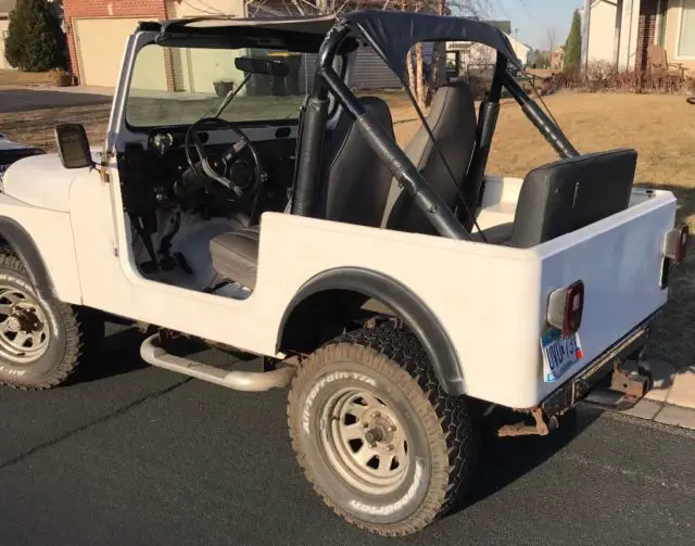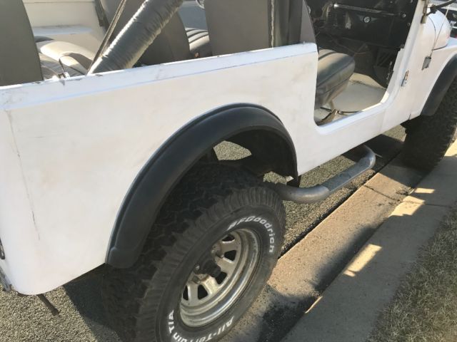 This Jeep has a 1979 engine which runs and drives well. The drive shaft is not there for the 4x4, so it is essentially rwd. Power steering has a leak in it. This has a fiberglass tub - I have no clue when that was installed. There is only a bikini top with this. No hard top or soft top. I have a tow bar that will go with it and a canoe rack that mounts to the front bumper. No doors.