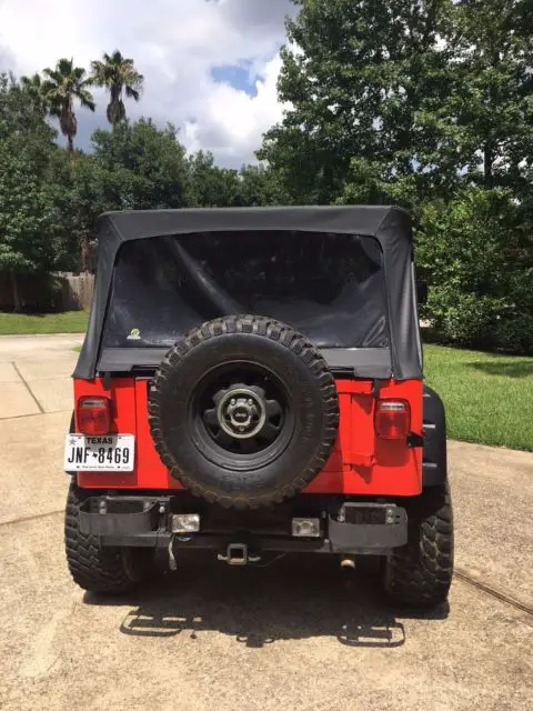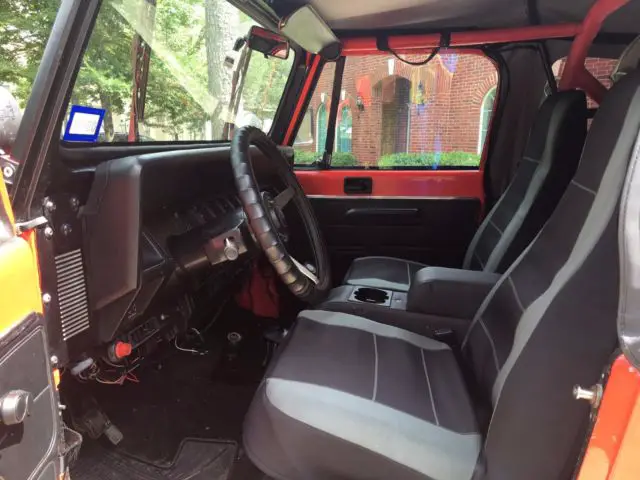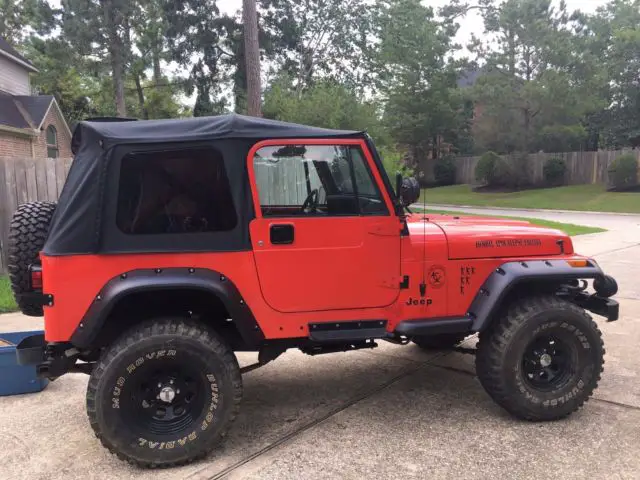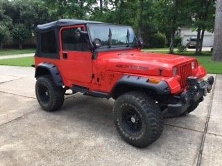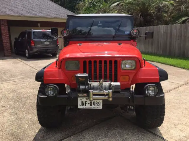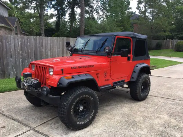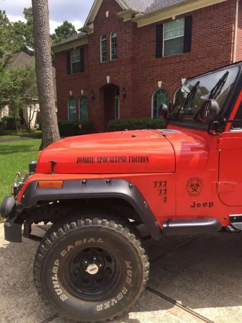1987 Jeep Wrangler YJ. Custom"Zombie Apocalypse Edition" decal scheme. Includes gun rack with zombie defense tools (axe, machete, shovel). 4.2L Inline 6 cylinder engine with 5-speed manual transmission. Body lift and 33" tires on Cragar rims. I bought this Jeep from a friend who rolled it. It has new top, windshield, fender flares, water-pump and carb. Body was straightened on a rack, but there are still visible flaws (small wrinkles and dents) on right side and hood. A/C works. Paint is somewhat worn and has a few small rust spots. Car did pass Texas safety inspection and is road-worthy. Lights/horn/turn-signals/wipers work. Exterior flood-lights are not currently hooked up. Winch works. No rear seat. Has seat covers, Comes with a set or half-doors, bimini top and tow bar. This would be a great ranch, cabin or hunting lease vehicle.