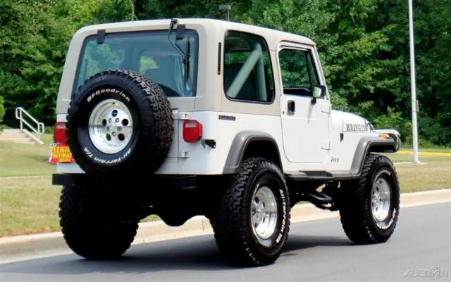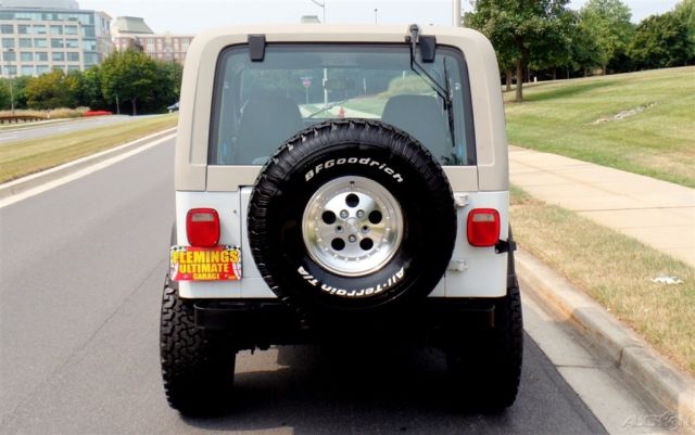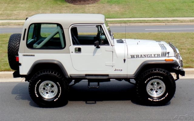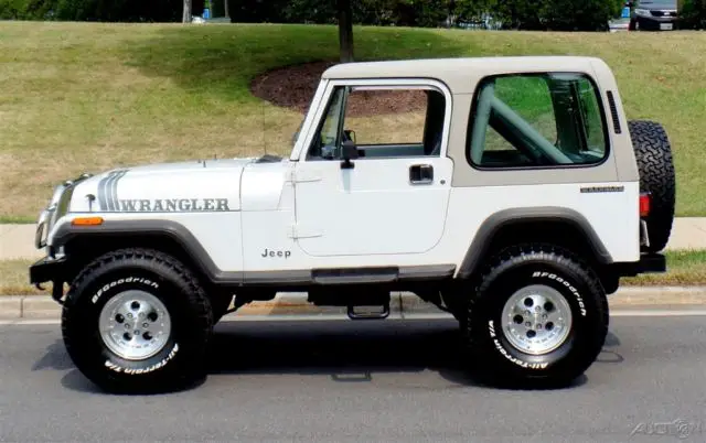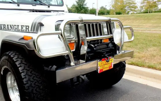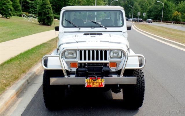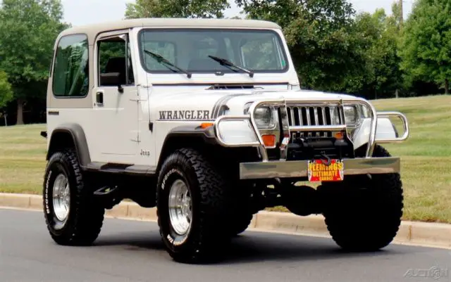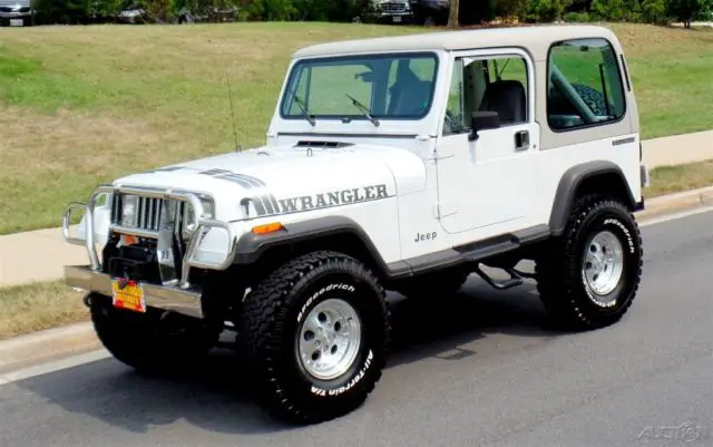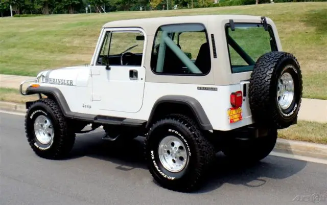 '90 Jeep Wrangler Loaded with options and incredible condition, Jeeps famous 4.2L Inline 6cyl Engine, Correct HD Manual 5 Speed Transmission, Beautiful Mirror Finish Factory Bright White Paint with grey Wrangler callouts, Optional Body Colored Wheel Flares and Side Steps,Removable matching Hardtop, Fully Carpeted Interior, Grey Bucket seat interior w/Custom Console, Optional Factory Cold Air Conditioning, Cruise Control, Power Steering, Power disc Brakes, Tilt Wheel, HD Winch w/Remote, AM/FM/CD Stereo w/All Weather Speakers, Roll Bar with color matched pad, Custom Chrome Front, Bumper w/HD Tow Hooks, New 4" lift, New alloys w/ 35" BFG all terrain radial T/As, what a cool jeep for the money and only driven around 4K miles a year.