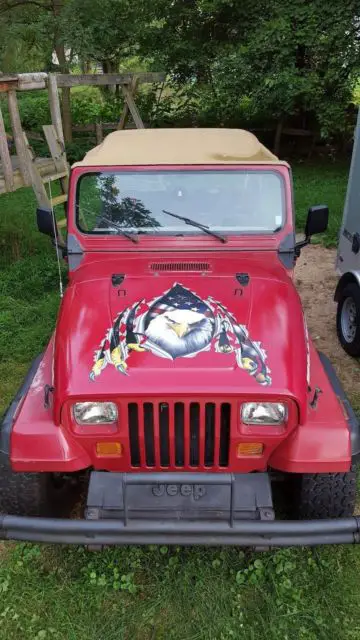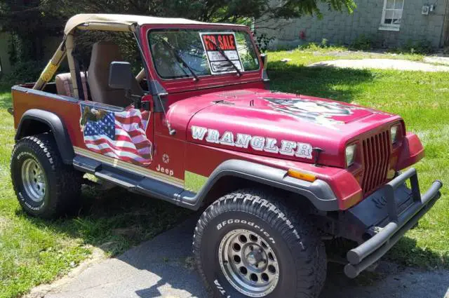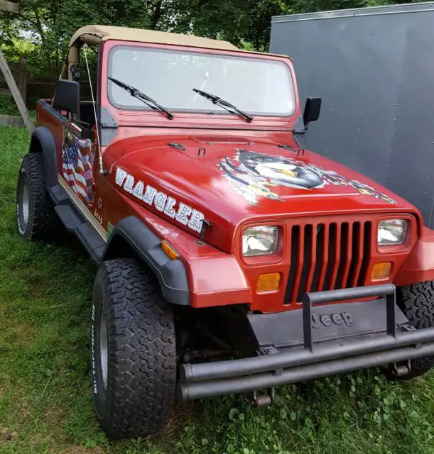 JEEP WRANGLER '88 (YJ) - $5800 (frederick) 1988 jeep wrangler condition: goodVIN:2BCCV81K9JB509776Year of Production:1988Car Make:JeepModel of the vehicle:WranglerBody Style:SPORT UTILITY 2-DRMotor:4.2L L6 OHV 12VCountry of Production:CANADACar Trim:S Soft TopVIN number:509776Vehicle's Transmission Type:5-Speed ManualDriveline:4WDFuel Tank (gallon):15.00drive: 4wd fuel: gas paint color: red title status: clean transmission: manual This vehicle is in good running condition. There is no trouble shifting this transmission. Nice hood with eagle decal This vehicle has a clean exterior. The interior is clean and in good condition. The tires on this vehicle appear to have no wear at all. Use it with flag doors or without.As is! OBO