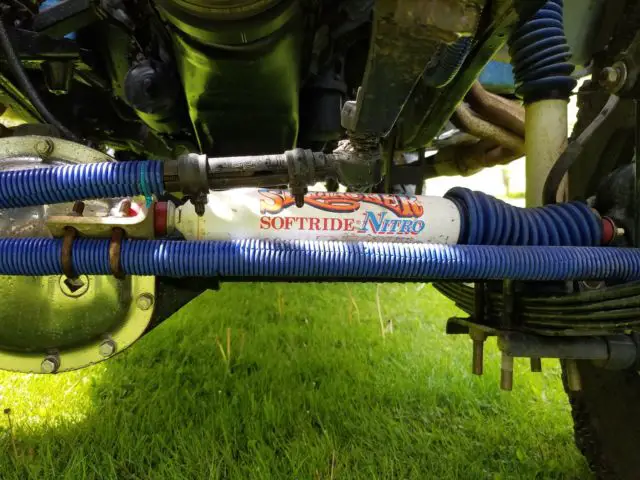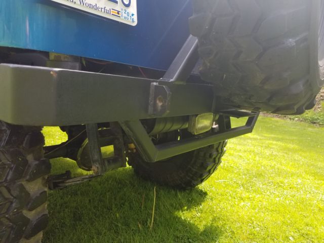 Custom front and rear heavy duty bumpers. Rear has attached spare tire carrier.