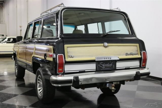 This 1991 Jeep Grand Wagoneer is one rugged looking workhorse. More than a quarter century after it began its duty, it still cuts a very appealing "no nonsense" appearance and, with its numbers matching drivetrain plying its trade alongside some well-chosen aftermarket upgrades, runs with a level of confidence-inspiring smoothness that's very hard to find in a classic SUV. While its black paint does show some evidence of its years of service - after all, it's more than 25 years old and likely hasn't seen the inside of a paint shop during that time - you won't find any glaring dents or scratches, so this vintage Jeep remains very presentable. The woodgrain paneling ornamenting its sides is actually looking pretty strong and, even upon close inspection, you'll find that its sturdy frame has done its job well. There are no signs of sagging on its sizable form and its four doors, decklid and liftgate all open and close with no issues at all. A trip to the local re-chroming shop will have the front and back bumpers looking their best, as both are table straight and show no major dings. There's a pretty sizable array of glass surrounding the cabin - 3 windows and a couple of wind wings per side, plus the front and rear windshield - and all of it is looking impressively clear while being surrounded by rubber seals that have plenty of life left in them. Take a look beyond the doors and you'll see a clean interior that holds some welcome surprises. An Alpine media player has been so cleanly installed in the dash, it could be mistaken for factory equipment, though it offers functionality that was way out of reach at the time this Jeep debuted as well as convenient A/V inputs for passenger entertainment. A CB radio is on board, complete with front loudspeaker and though it will need a bit of tuning to perform as intended, it looks fairly new and should have plenty of life left in it. Due to a complete reupholstering session only about a half year back, the seating throughout the cabin is in fine shape and is plenty comfortable for even the longest of journeys - the front buckets feature power adjustment and they, as well as the bench seat behind them, really look great. Up front on the dash, the array of control knobs and switches are all working as intended and the gauges in the instrument cluster may show a bit of age but they, too, are completely functional. The engine compartment is well detailed and tidy - this '91 likely made a trip down to the steam cleaner not long ago. At its center sits the original 360 cubic inch V8 and it still acquits itself well, starting right up and running smoothly to provide a very pleasant driving experience. An Edelbrock 4-barrel carb and intake manifold have been added to provide some extra power and a nicely sized aluminum radiator is up front to keep temperatures down in more demanding conditions. The 3-speed automatic transmission is shifting with precision and 4-wheel drive ability is easily activated and combines with the Jeep's substantial ground clearance to provide surefootedness once off the asphalt. Power steering featuring a recently replaced pump makes this substantial vehicle easy to drive, while power brakes - with discs up front - provide low effort stopping ability as it performs its duties on a set of 15" stock wheels outfitted with Cooper All-terrain tires. This iconic 1991 Jeep Grand Wagoneer has been well cared for over the years, and it's ready for action just as soon as you get it home. Call today!