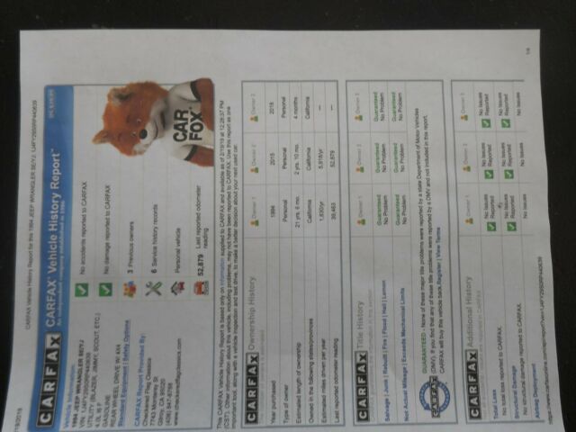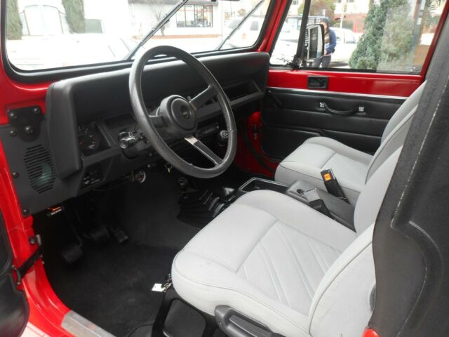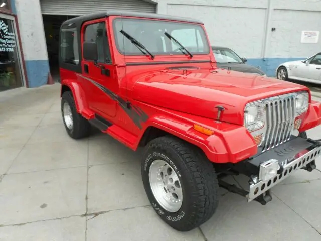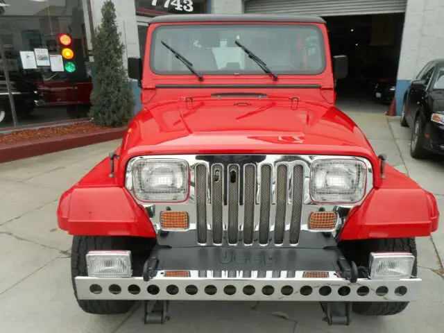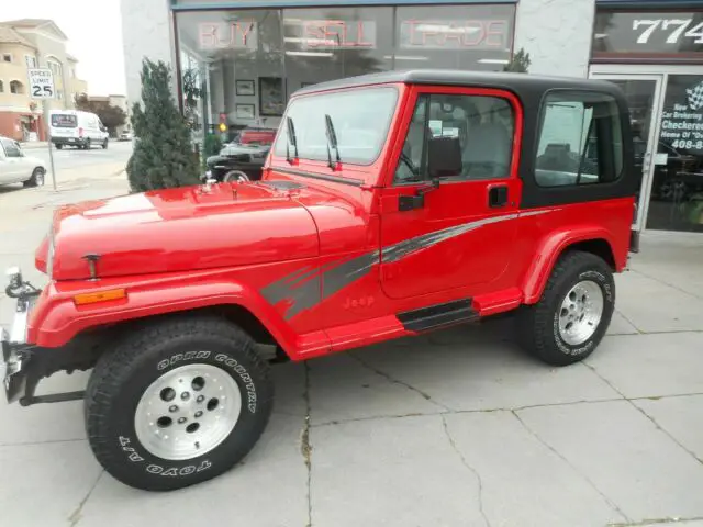 Jeep Wrangler YJ Sport 4X4 only three adult owners and only 53,100 original miles. It is equipped with all standard power options plus tilt wheel, hard top with deck cover, 1998 wheels, like new 30 inch Open Country Toyo tires, 3.73 gears, dual system after market alarm with special key, custom front grill and bumper, optional 21 gal gas tank, off road suspension (factory), high power radio with I Pod, wireless 6 disc changer, and much more. The power plant is the proven 4.0L H.O. 6 cylinder and driven by a 5 speed manual transmission. This little all around fun buggy has a clean car fax and clear California title and ready for many years of any type of driving. It is in stunning condition one of the nicest one we ever had, it runs and drives great, dependable, powerful, safe and hard to find with these miles. #440639 Now on display at the home of "over the top cars"CHECKERED FLAG CLASSICS 7743 MONTEREY ST GILROY, 408-847-8788 or 888-625-2774, sold as-is, California buyers are responsible for sales tax and license fees. Buy with confidence I am a licensed bonded California dealer.