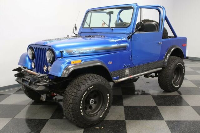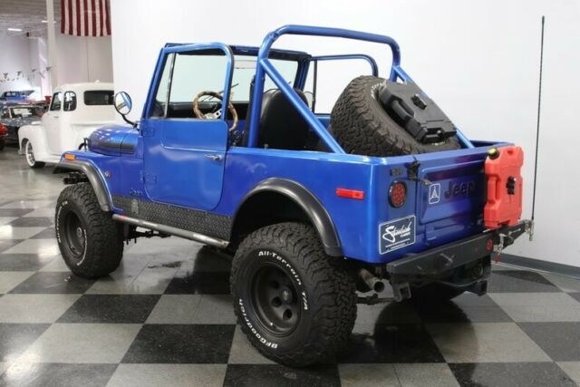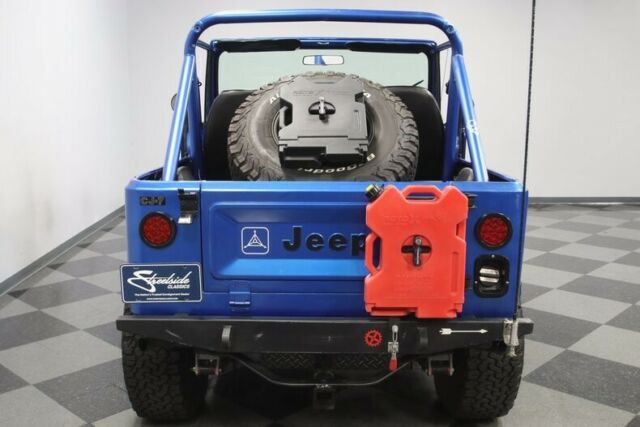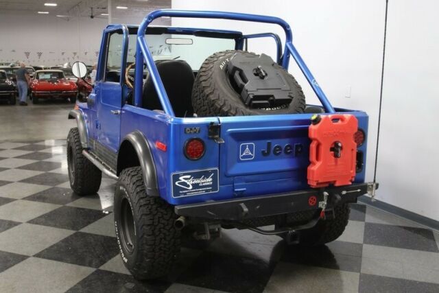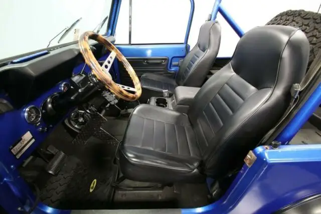 Jeeps are a timeless representation of a go-anywhere 4x4 spirit. So it's great to find an example like this 1979 Jeep CJ7 that samples from the best of this vintage line and adds in plenty of cool/modern upgrades... all for a very attractive price. This Jeep is distinctive from the first moment you lay eyes on it. The electric blue metallic paint instantly conveys the modern investment in this classic icon. The Renegade trim also sends the right... message. After all, it has the vintage look that complements the classic V8 badging and overall iconic CJ design lines. And the black is the perfect setup for the all darkly painted function this 4x4 has to offer. It includes tubular rock rails that perform double duty as steps, diamond plate rockers, hood pins, Poison Spyder Customs hood louver, trailer hitch, and 15-inch Pro-Comp wheels. But our favorite part showcasing style and function is the front end. The rugged Metalcloak front bumper has an attached shovel, and you've even been upgraded to LED headlights. Inside continues the black and blue theme nicely. It starts with updated seating with weather-friendly neoprene seat covers. Plus, liner paint on the floors keeps cleanups a snap, and the rugged floor mats up front are ready to catch any dirt or mud that happens to get tracked back in the Jeep. There is a locking center console that is big enough to fit any loose items in for those bumpy trail rides. Everything is within easy reach, such as the four-wheel drive shifter. Beyond the three-spoke steering wheel is a center mounted large speedo. Plus, all the knobs, padding, auxiliary gauges, and lighting look fresh. You can choose to stay buttoned-up to the world with the removable hardtop and full side doors, but that's not what Jeep life is really about. And so we know you'll love being open and showing off the color-matched roll bar and pre-runner style spare tire mount. Plus, with the spare gas can, fire extinguisher, and Rotopax tool kit, this one is ready for an adventure. Unlatch the hood, and beyond the shine of the valve covers, you'll find the rough-n-ready function of a 290 cubic-inch AMC V8. Besides just looking good, it has a Flowmaster dual exhaust to give you the right sound and fury this machine deserves. It feeds a stout Ford 9-inch rear end and Dana 44 front axle when the 4x4 is engaged. Plus, this engine has gone through a thorough servicing in the last 8,000 miles that will keep it strong on the trail. This includes new plug wires, distributor cap, heater core, fan, radiator, flywheel, and starter. Steering feels great with a new steering box, pitman arm, and steering shaft. Plus, on or off-road this Jeep feels solid thanks to new brakes and a complete set of urethane bushings. But when you check out all of these components in the undercarriage pictures, the real standouts are the updated pieces that really allow this Jeep to be the leader on the trail. It includes the Daystar one-inch body lift, new leaf shackles, new tie rod assembly, and all shocks, including stabilizer, by the masters at Skyjacker (and also adds an addition 2.5 inches of lift.) Add in features that are welcomed anywhere like the three-speed automatic transmission, power steering, front disc brakes, and the anytime grip of BF Goodrich All-Terrain tires. Yes, this Jeep is truly the complete package. Here's a custom Jeep that's been enhanced to excel on or off the pavement and look unique doing it. Just remember, you weren't the only one who saw this exceptional 4x4, so hurry up and call today!