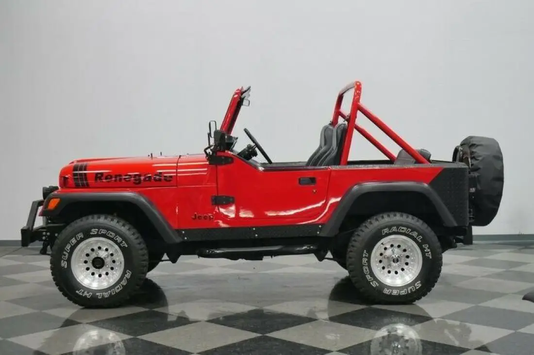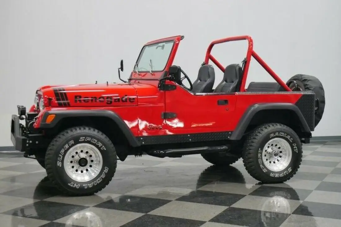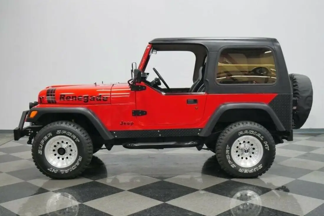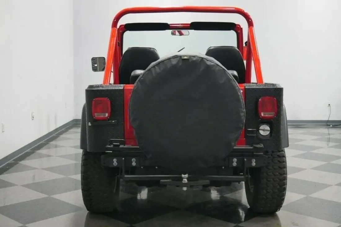The glossy red of this CJ makes sure people instantly take note. And this is joined by a well-coordinated black that seems to highlight some of the most rugged pieces of this 4x4. There's a sturdy steel front bumper standing guard to offer protection, and it even has bright LED lights and a ProMark 8,000-lbs electric winch. The side is dominated by new oversized rubber fender flares, diamond plate rockers, and Smittybilt step bars. There's more diamond plate protecting the rear corners. Plus, there's also a full-size spare on a swing-away mount and a proper trailer hitch. They all coordinate well with the black fiberglass top. The different Renegade hood graphics and half-doors are especially cool additions. After all, this was one of the final years for the CJ, and so it seems only fitting that you can see some cool upgrade inspired by its successor, the YJ Wrangler.