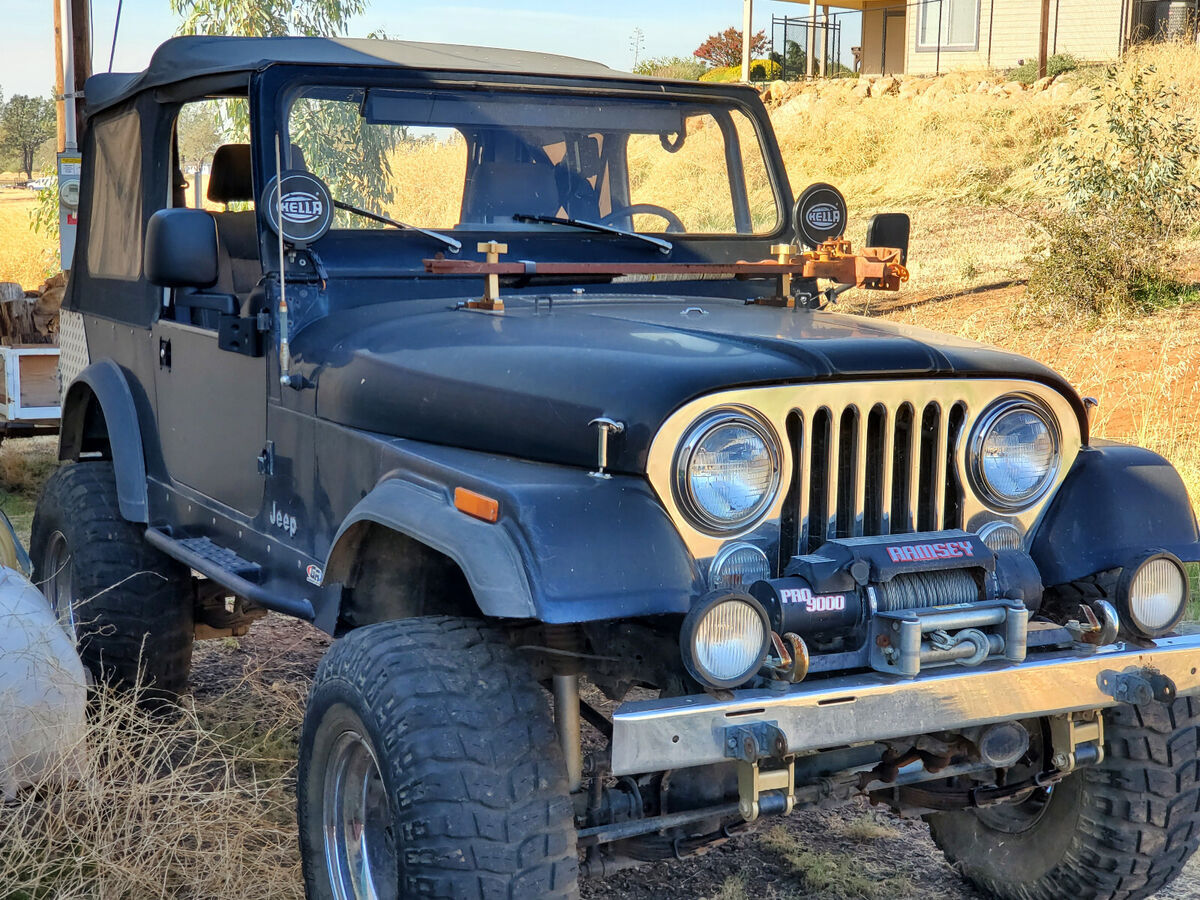 1982 Jeep CJ7 Larado with Howell Fuel Injection System with manual, Front & Rear(for towing) lockers, Tow Bar, Custom Bucket Seats, Custom Dash, Stereo w/ Built in Speakers, Wide Angle Rear View Mirror, Ramsey Pro 9000 Winch, Rear Cargo Rack w/Spare Tire Mount, 2 Spare Tires, Extra Doors, CB Radio, Rear LED Lights, 2 Pair of Off Road Lights, Pair of 6 Ton Floor Jacks, Creeper, Misc. Usable Spare Parts, Jeep Manuals & Documantation