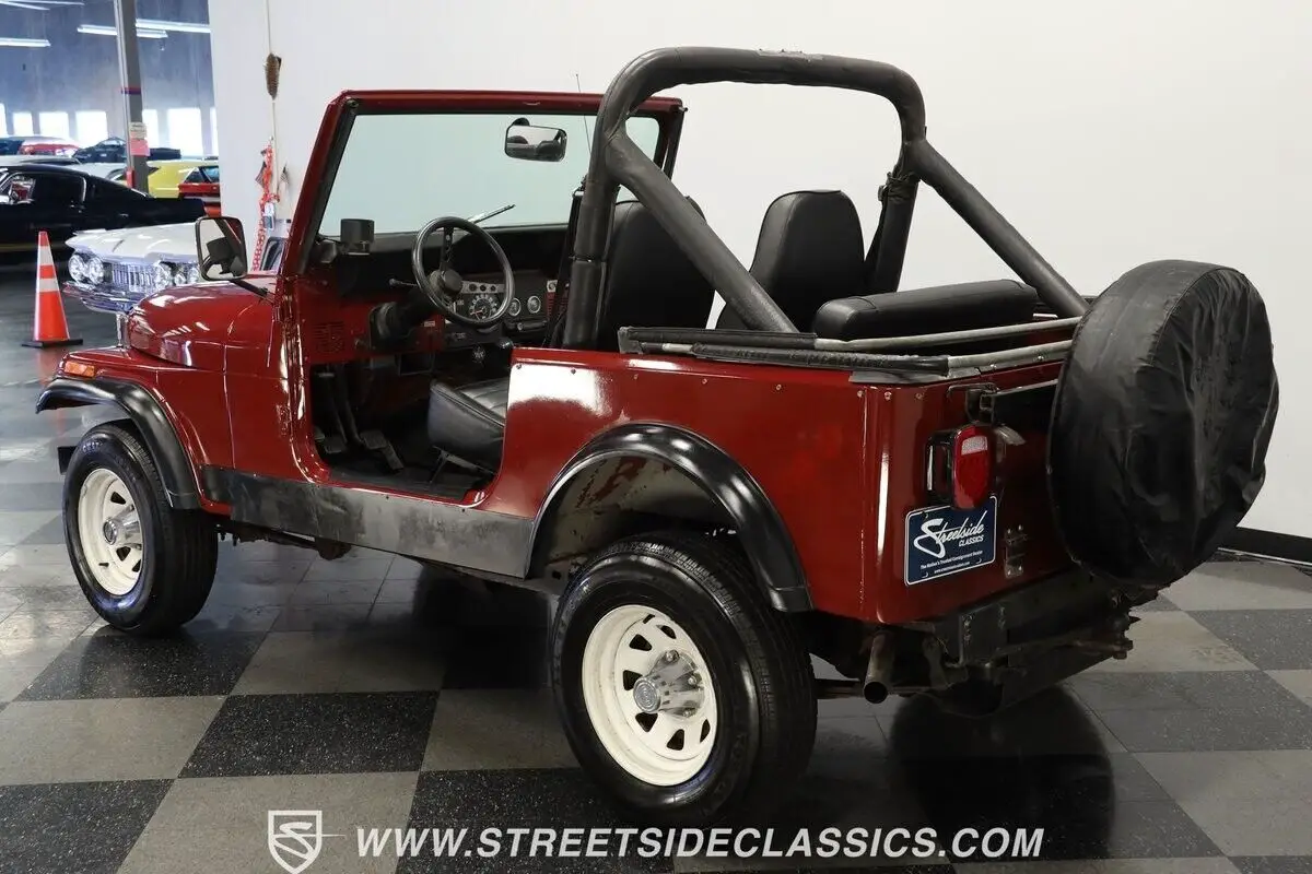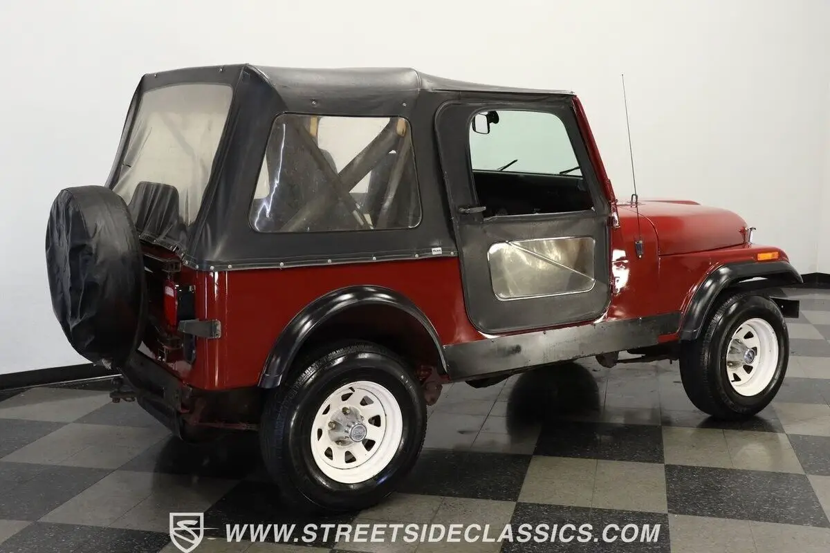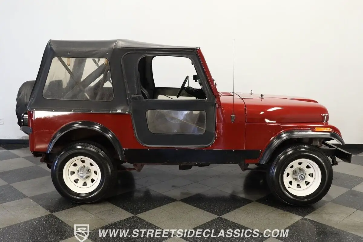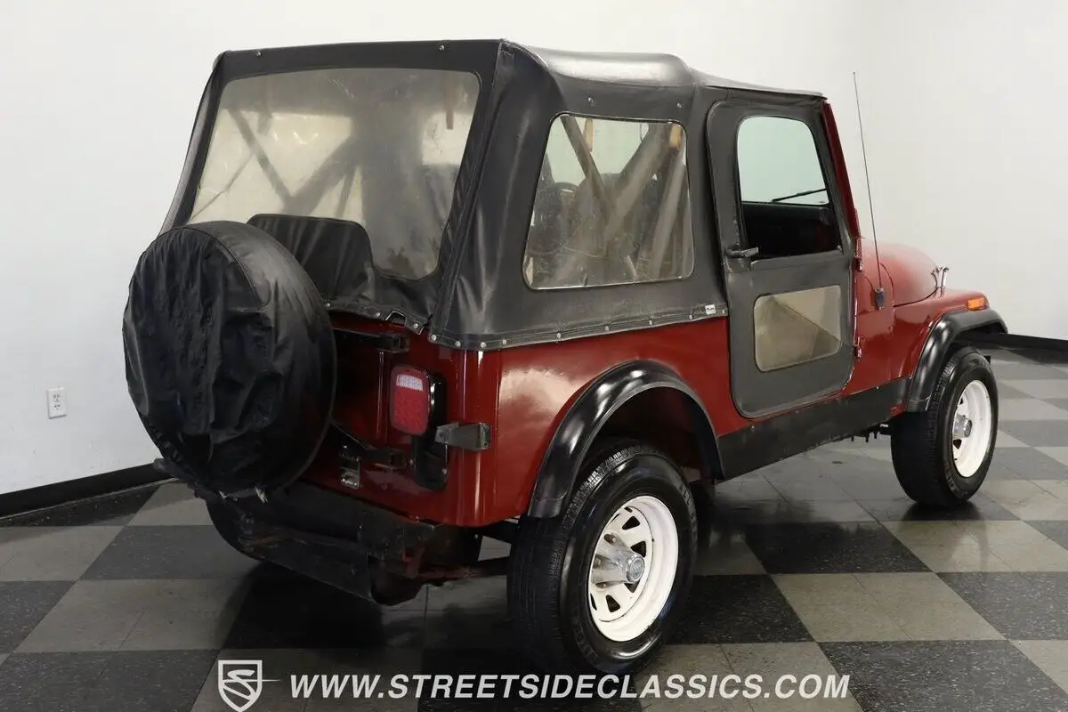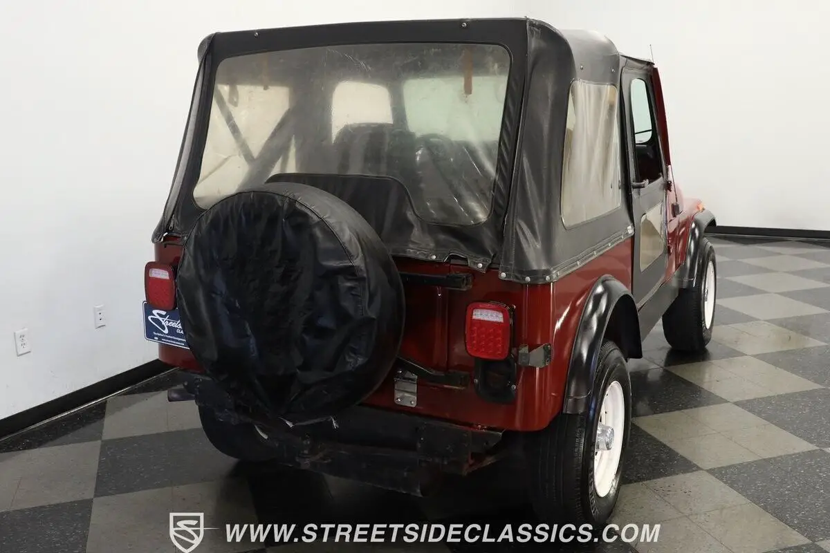 4953-TPA 1982 JEEP CJ7 HIGHLIGHTS: • 4.0L Inline-6 Engine • 4-Speed Manual Transmission • Front Disc Brakes • Upgraded Aluminum Radiator • Belt-Driven Cooling Fan • Power Steering • Burgundy Paint • Vinyl Removable Top • 15" Wheels with 225/75R15 All-Season Radial Tires • Front and Rear Bumpers • Trailer Hitch • Rear-Mounted Spare Tire • Black Interior with Bucket Seats • Floor Shifter • Sony AM/FM CD Player • Maintenance Records Since 1987